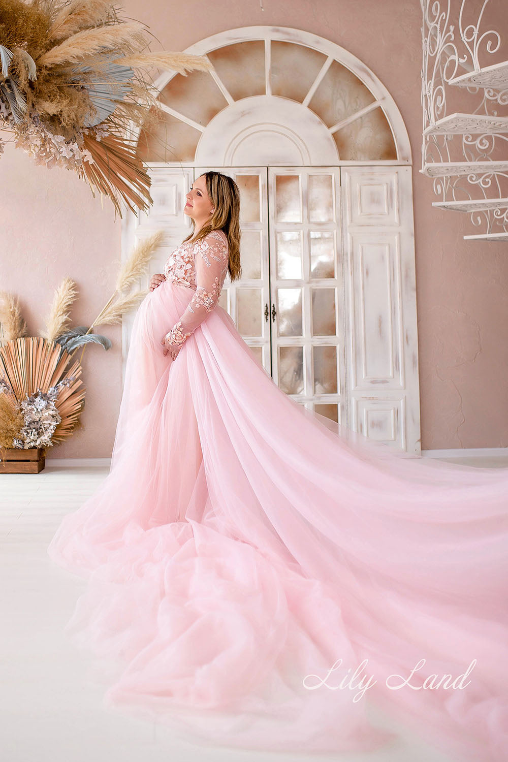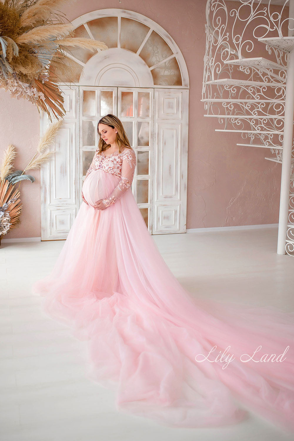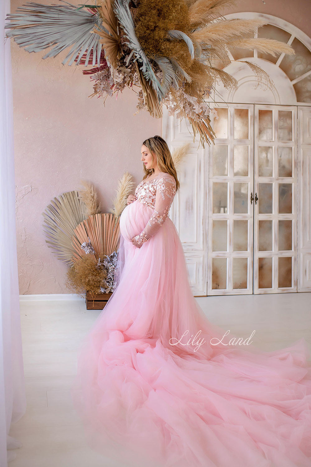 Vestido de maternidad en color rosa con cola larga y esponjosa para sesión de fotos