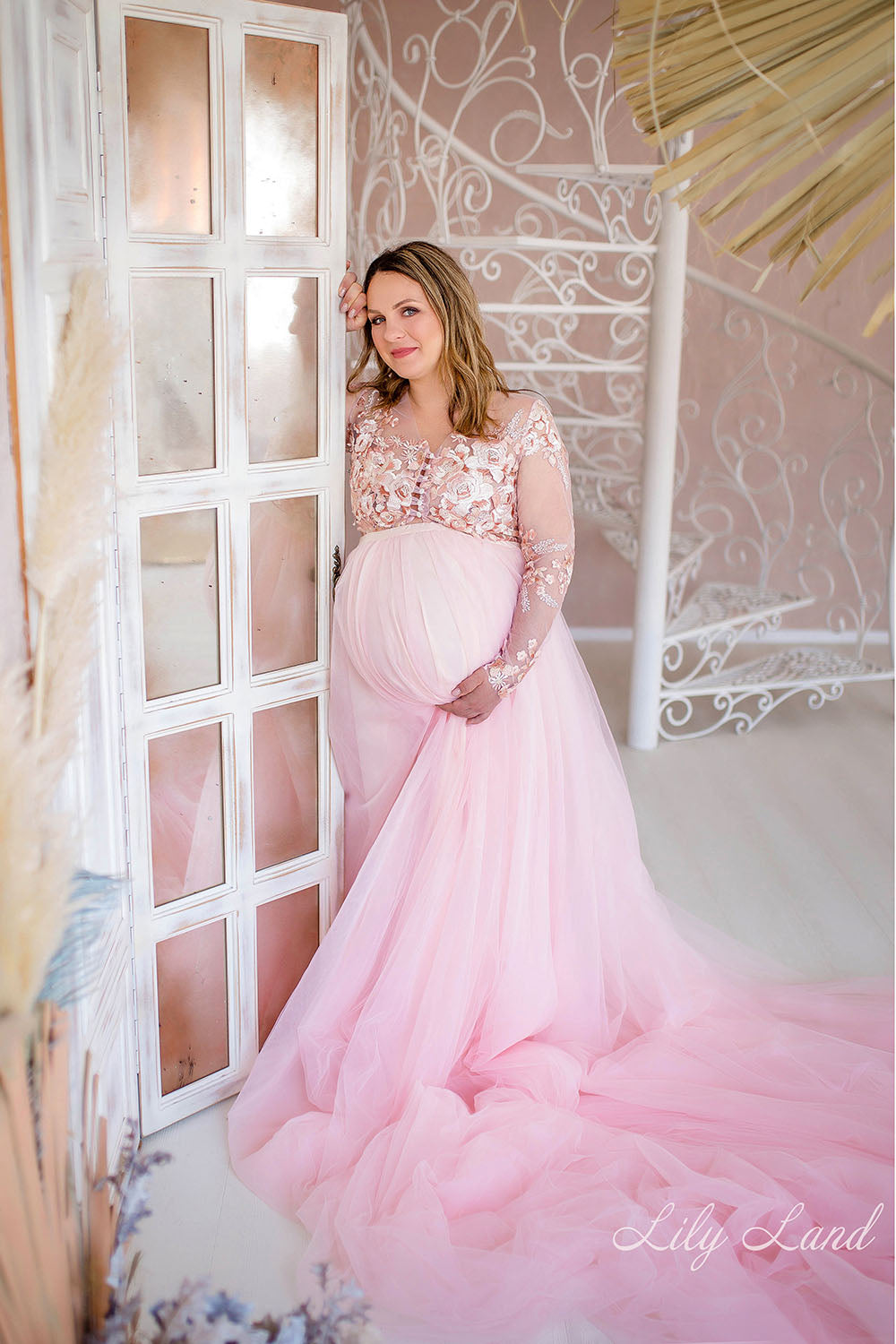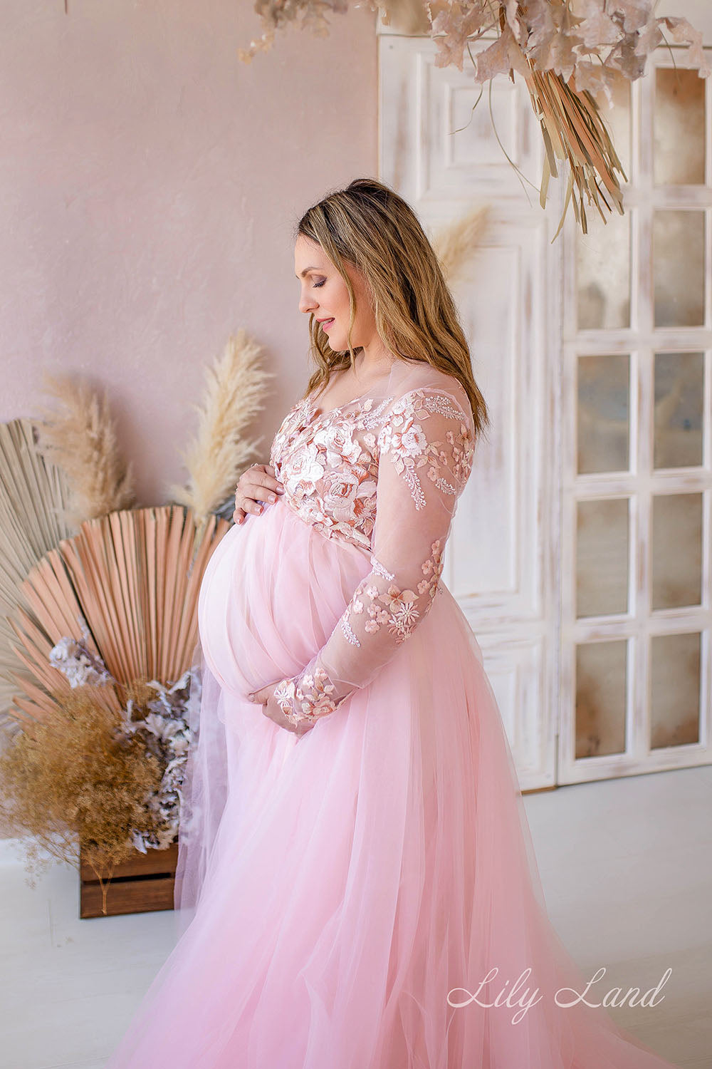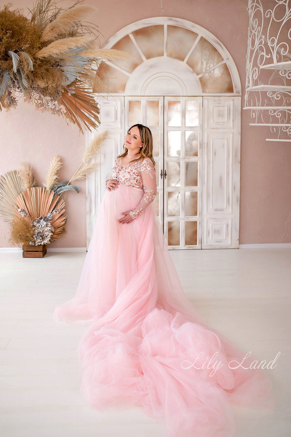 Vestido de maternidad en color rosa con cola larga y esponjosa para sesión de fotos