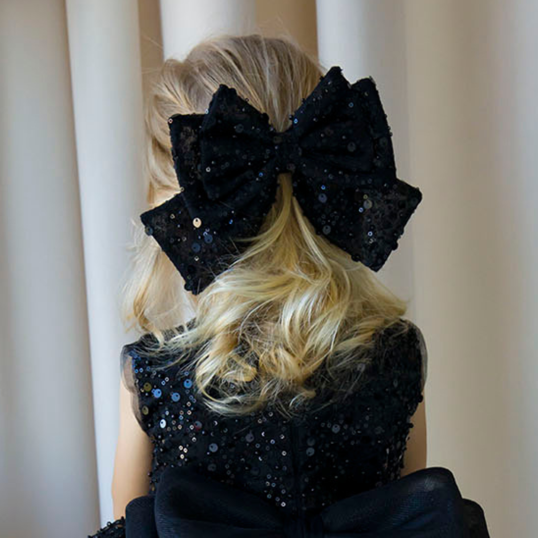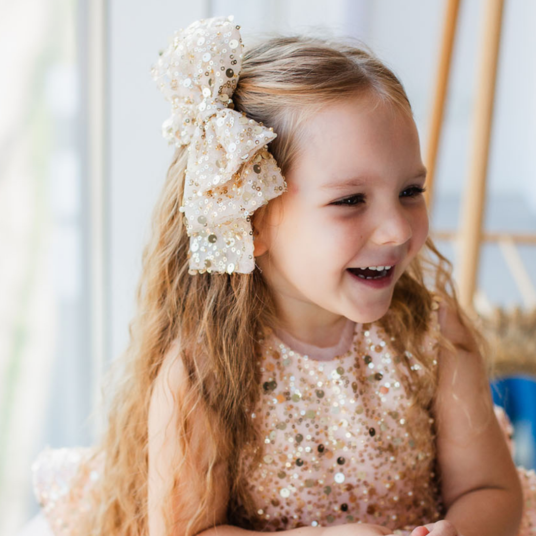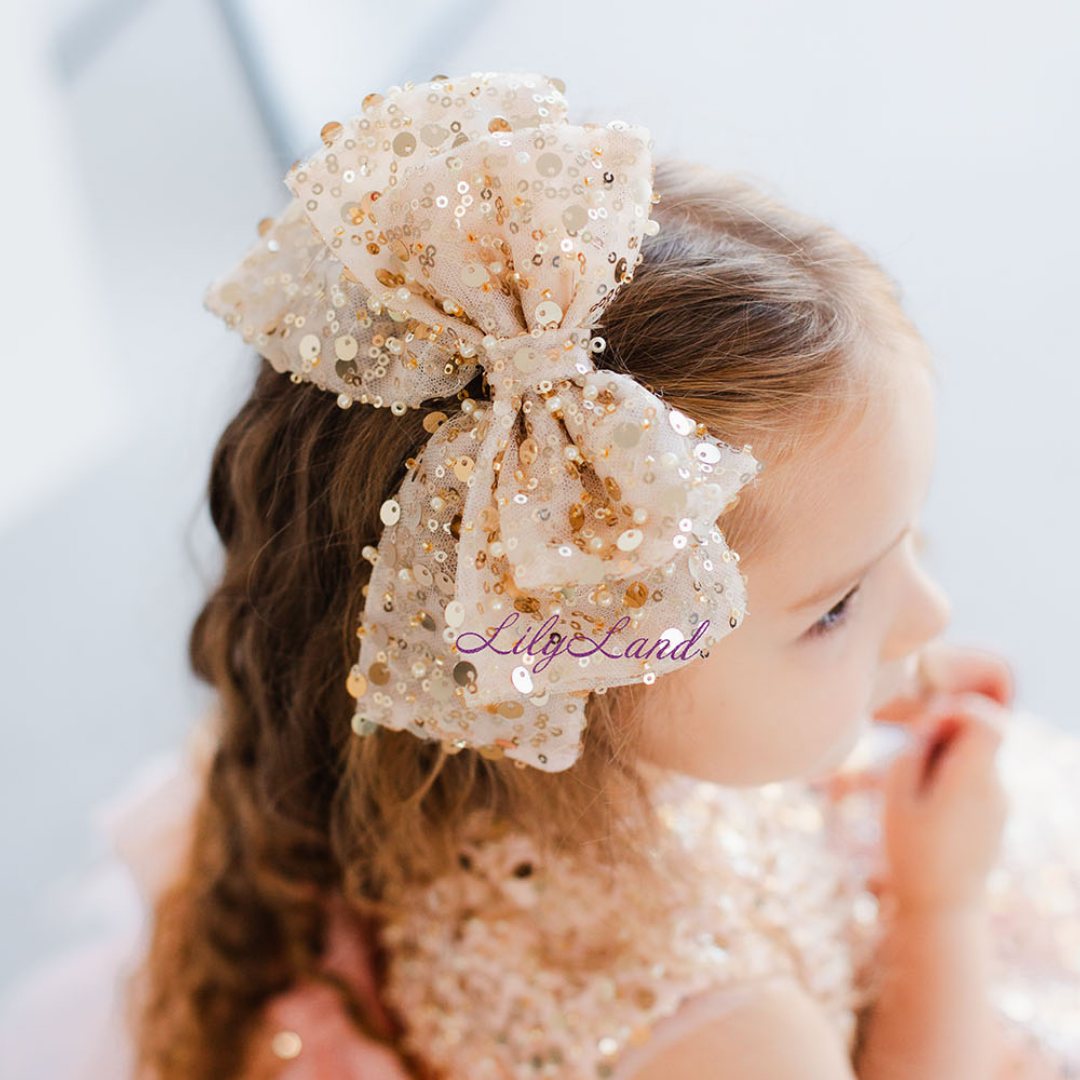 Enhance any hairstyle with a playful touch by adding a bow headband. This headband features a charming gold sequin bow decoration, making it perfect for a variety of occasions, from birthday parties and family photoshoots to weddings, Christmas, prom, Valentine's Day, dances, elegant evenings, and more. These delightful hair accessories for girls are not only incredibly cute but also a versatile addition to baby girl dresses.