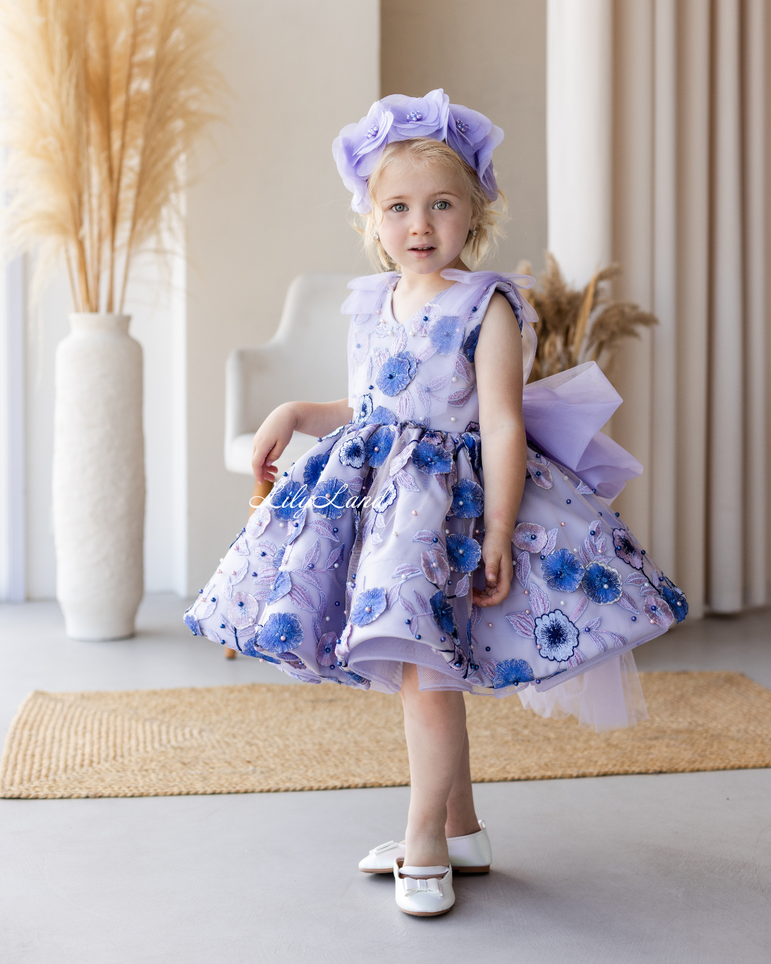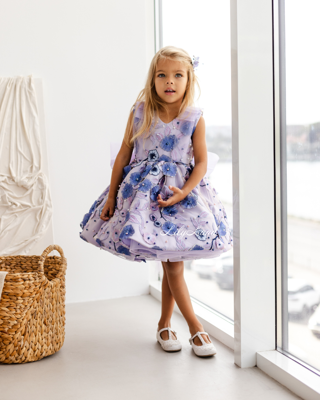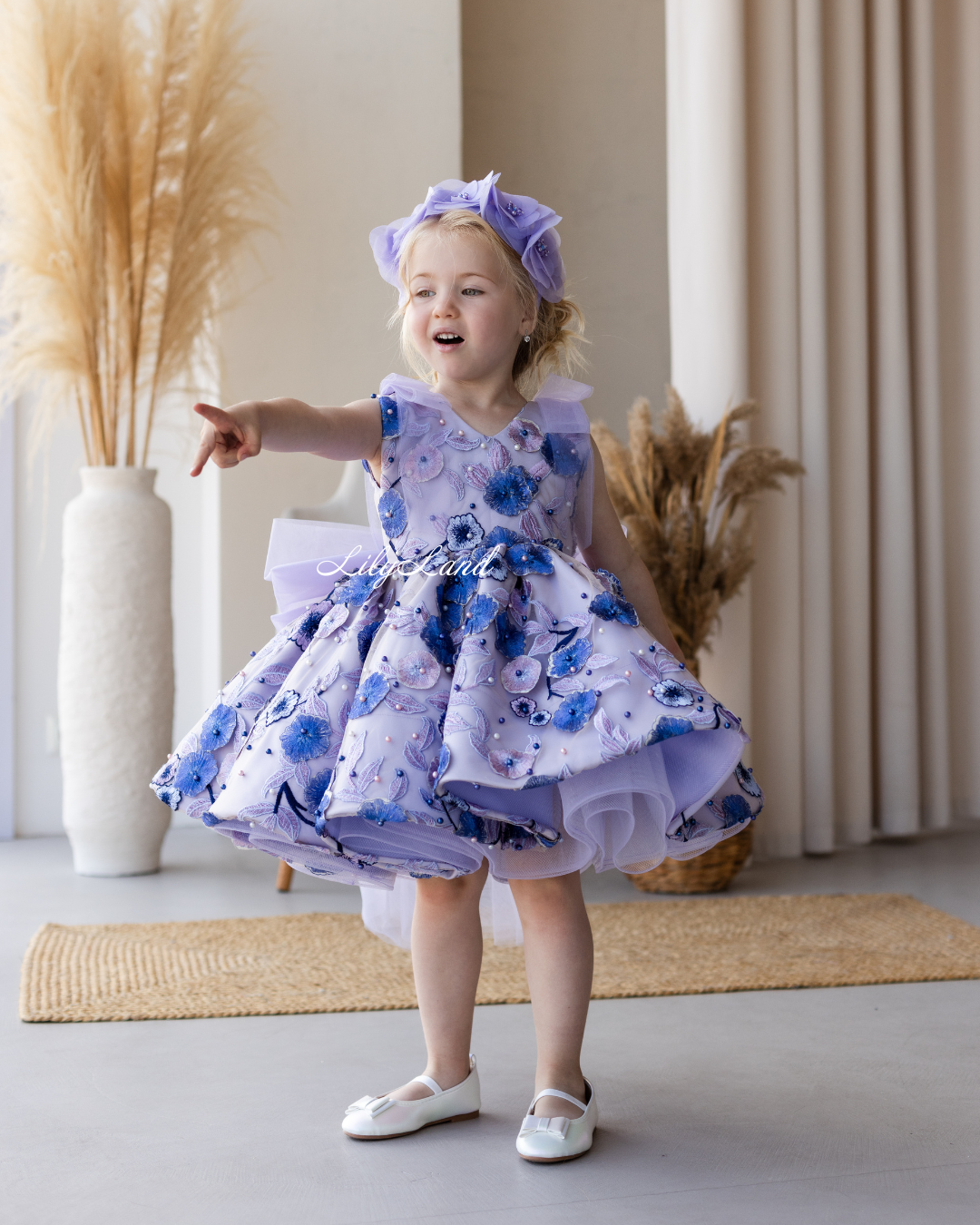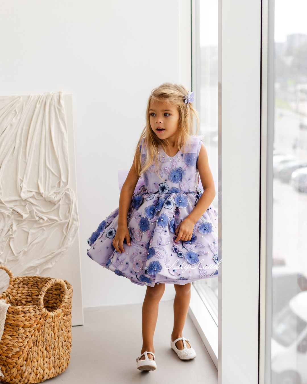 Malva Girl Dress with Floral embroidery and Pearls in Lavender