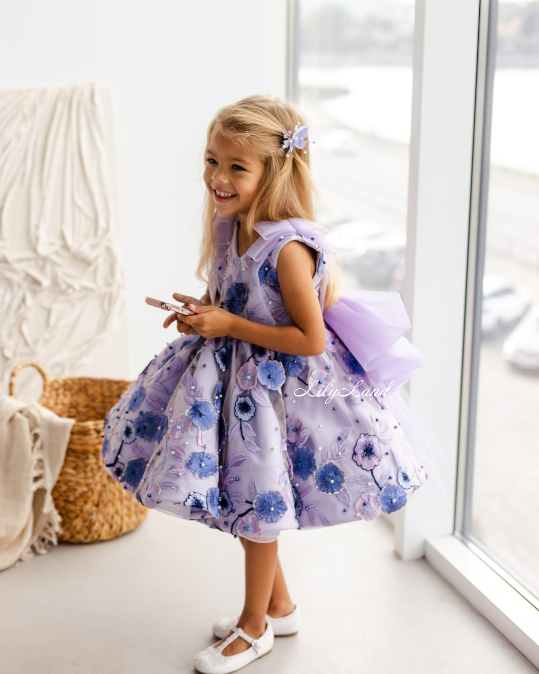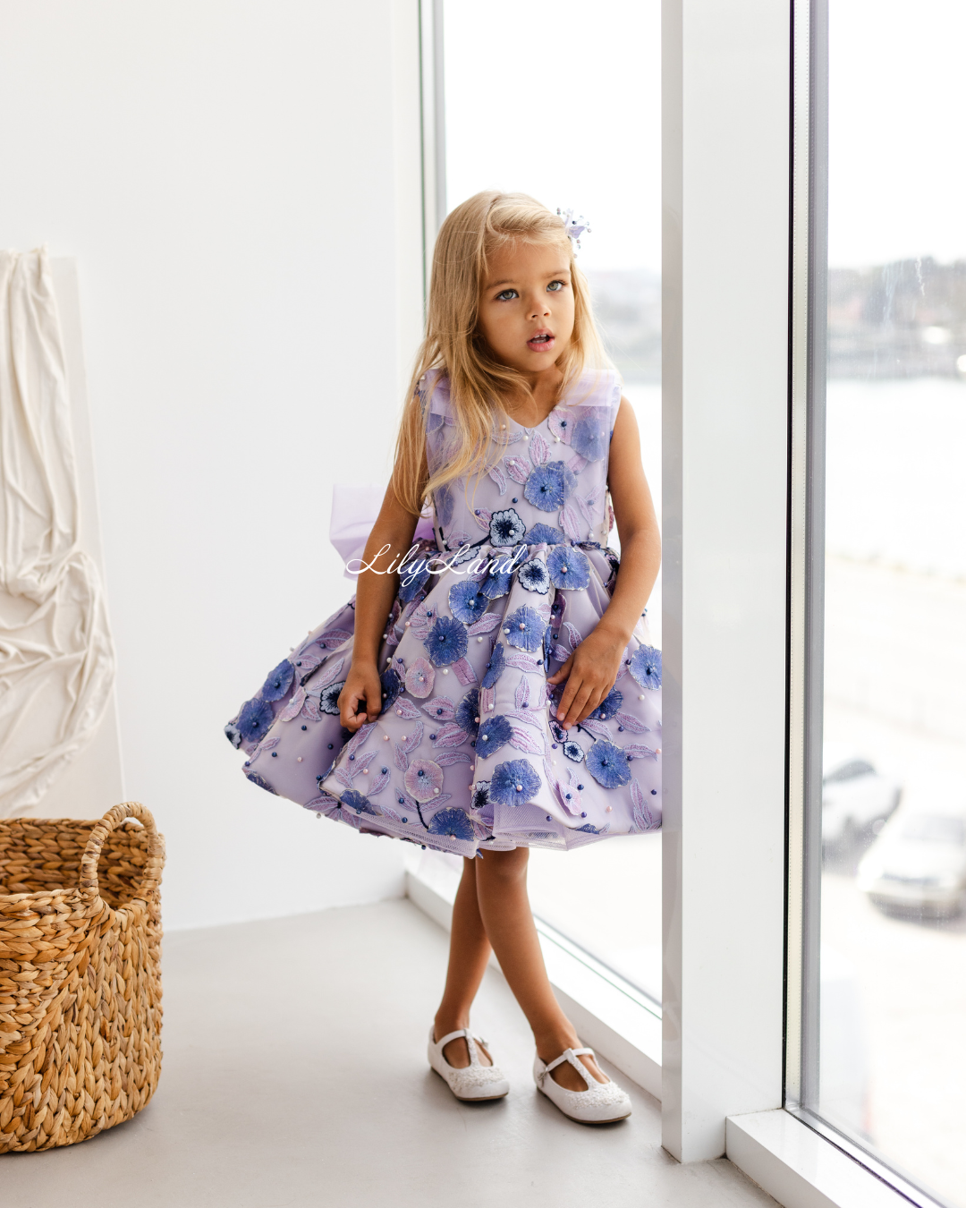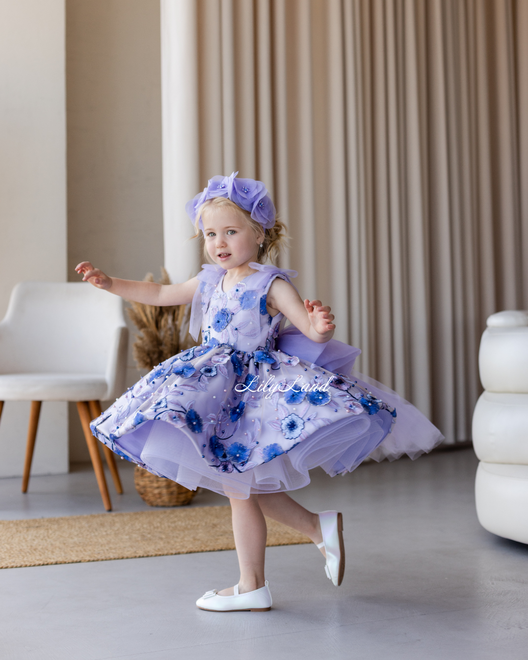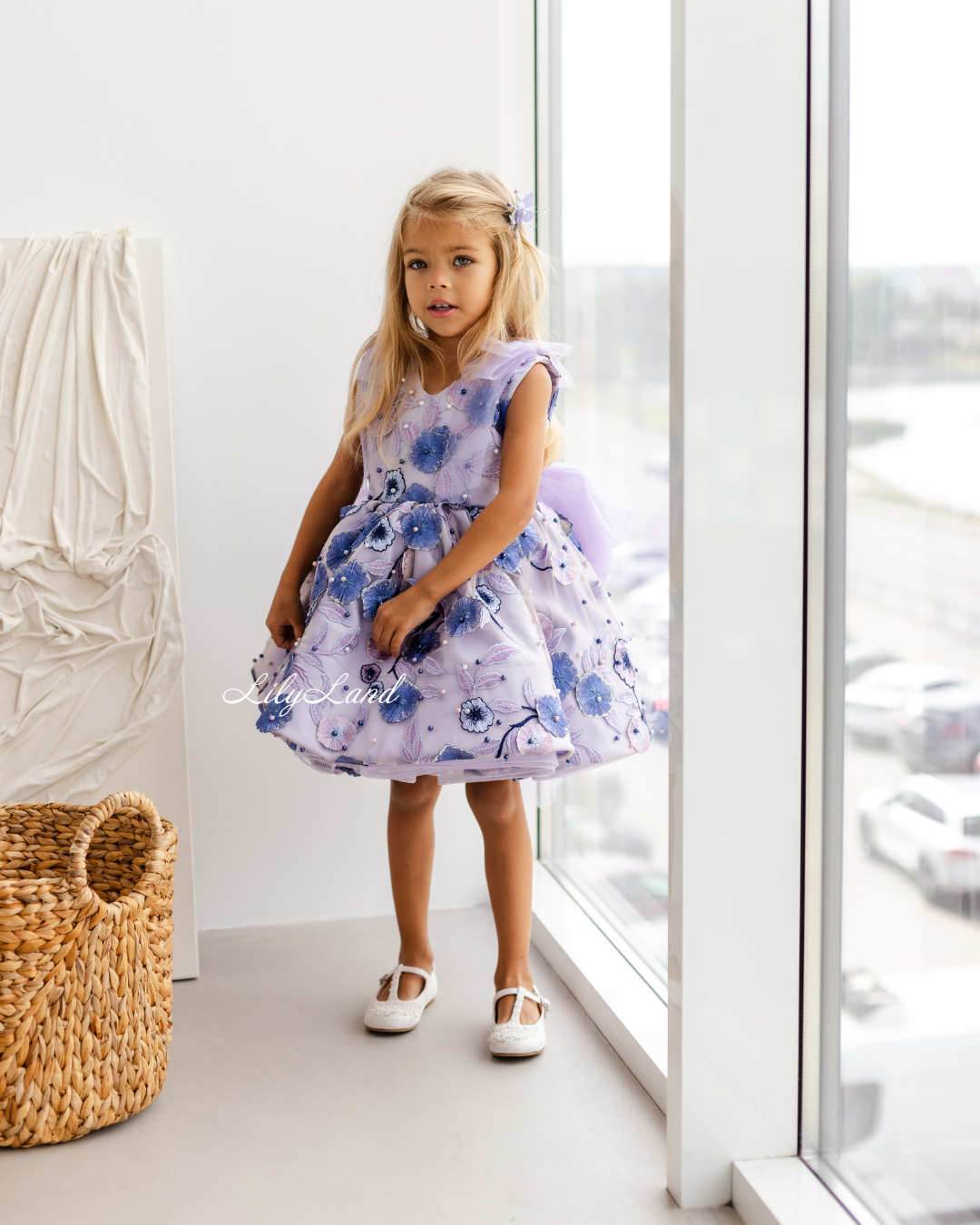 Malva Girl Dress with Floral embroidery and Pearls in Lavender