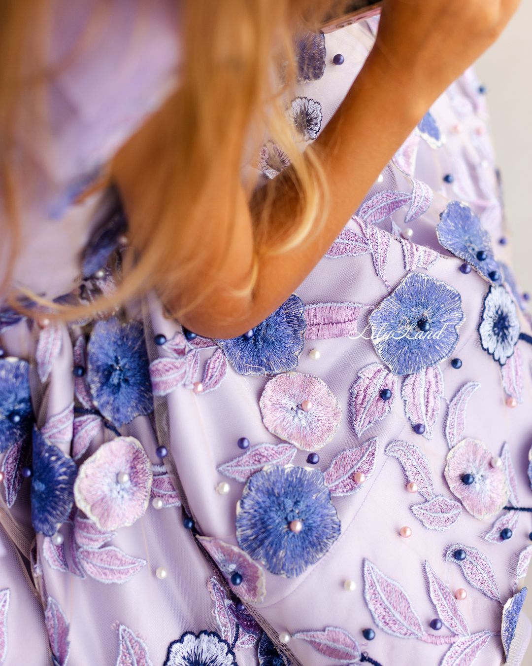 Our Malva dress in a beautiful lavender hue – a stunning blend of elegance and charm, now adorned with delicate lace, floral embroidery, and pearls for an extra touch of sophistication. Perfect for a birthday celebration, a joyful gathering, a prom nights, a fairytale wedding, a photoshoot, a starring role as a flower girl, a festive Christmas soirée, Valentine's Day, or important milestones like first communion, junior bridesmaid duties, baptism, or christening, the Malva dress is the perfect choice to make her feel like royalty.