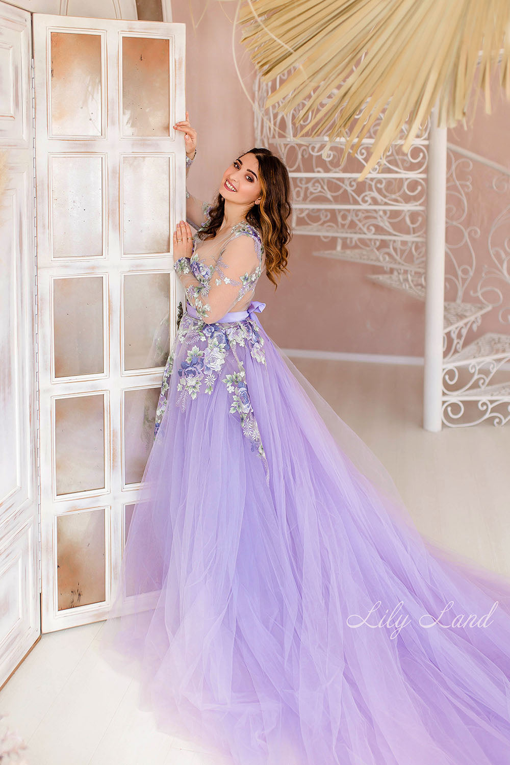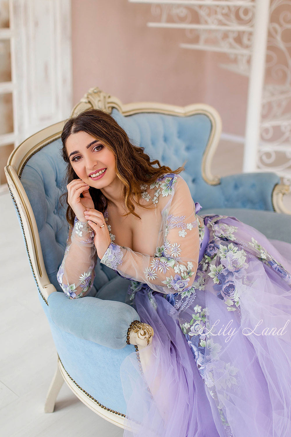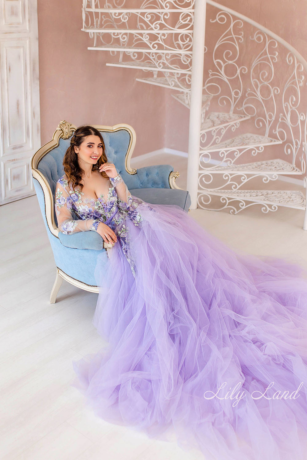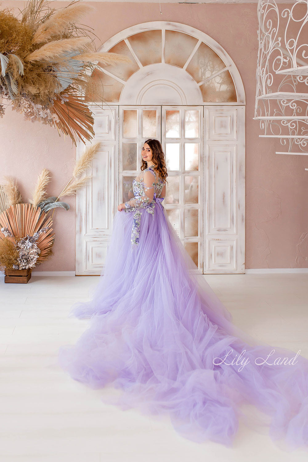 Vestido premamá en color lavanda con cola larga y esponjosa para sesión de fotos