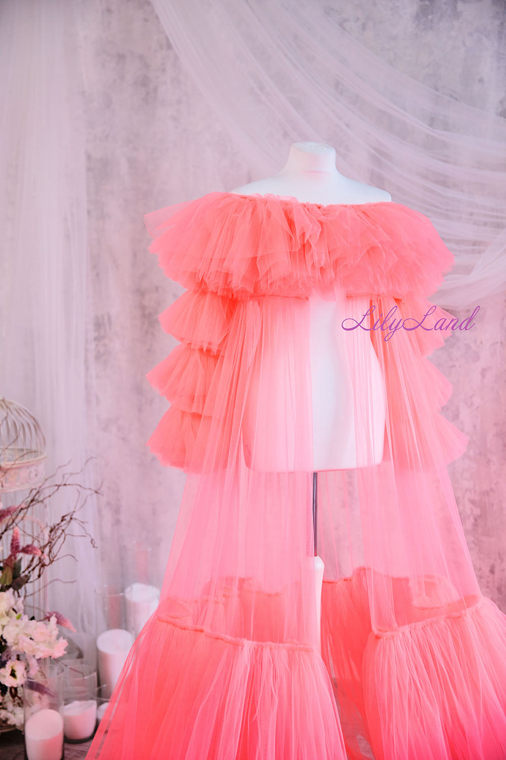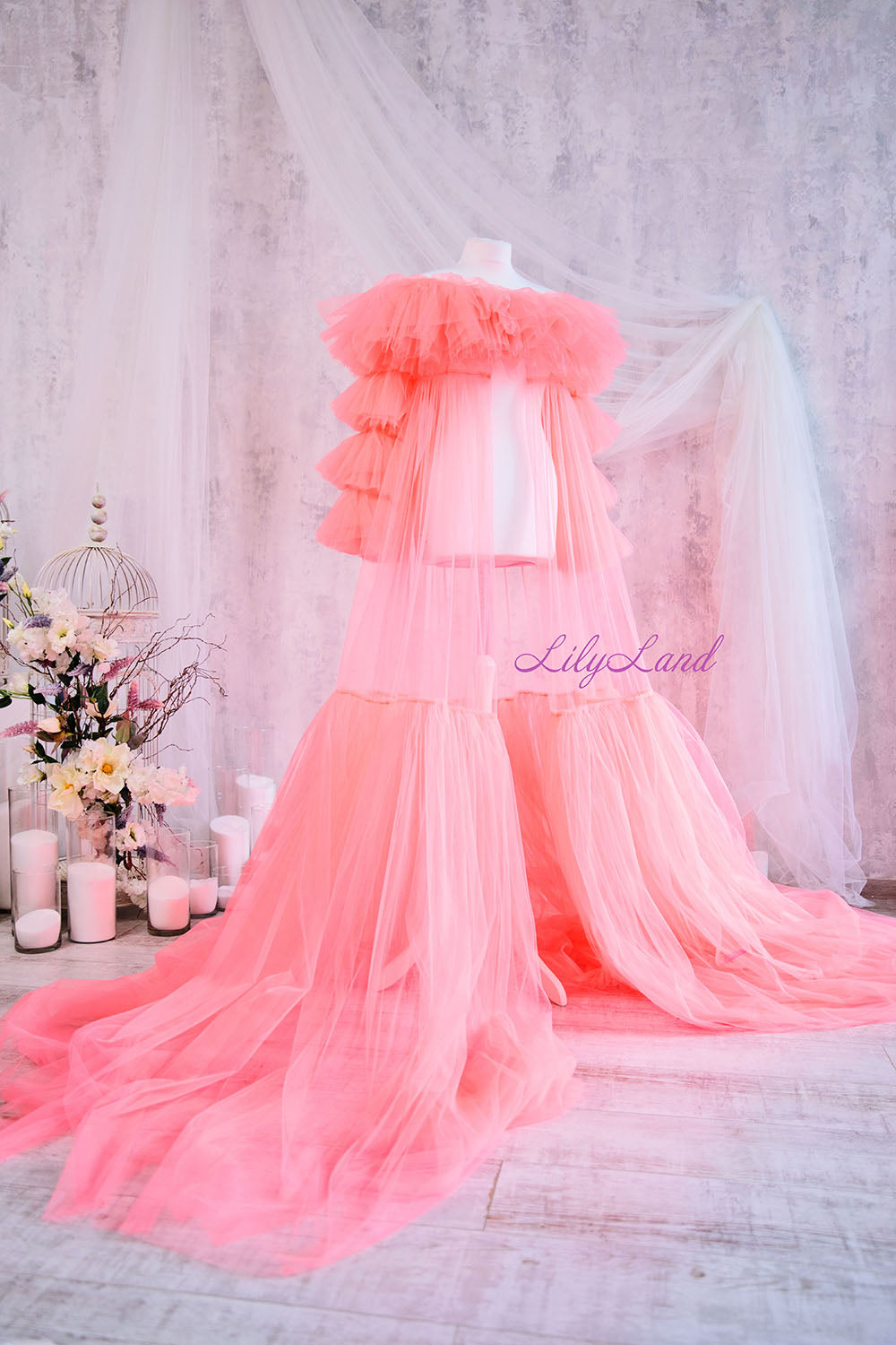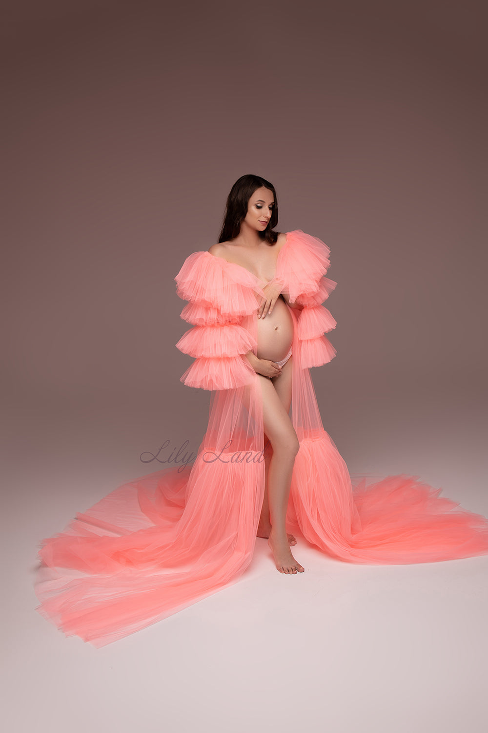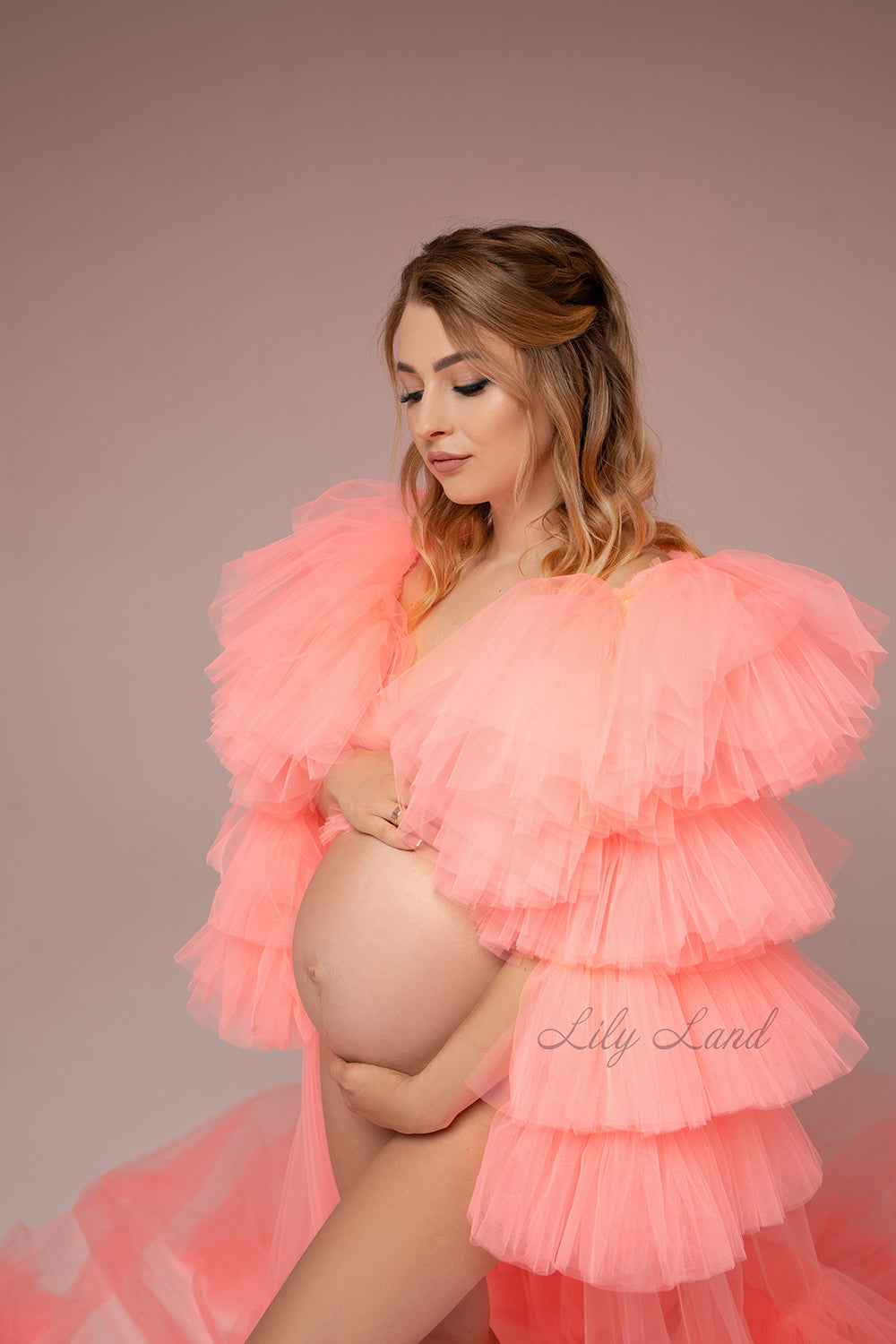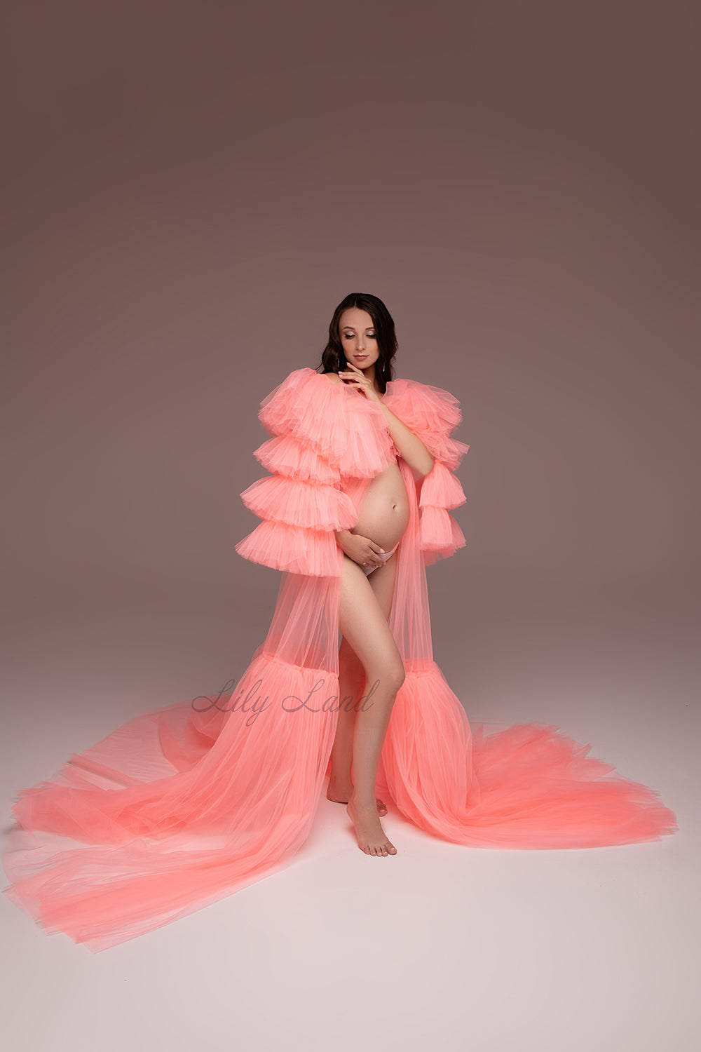 Esta delicada bata de color rosa le ayudará a crear maravillosas fotografías que le servirán como un grato recuerdo durante muchos años. Esta bata de maternidad hecha a mano, con su diseño excepcionalmente original y moderno elaborado con tul de alta calidad, es la elección perfecta para sesiones de fotos, baby showers, sesiones de fotografía u otras ocasiones especiales. La bata se puede realizar en varios colores y tamaños, teniendo en cuenta todos los deseos del comprador.