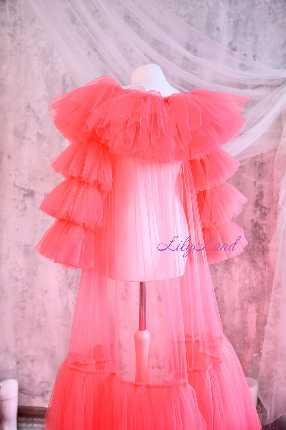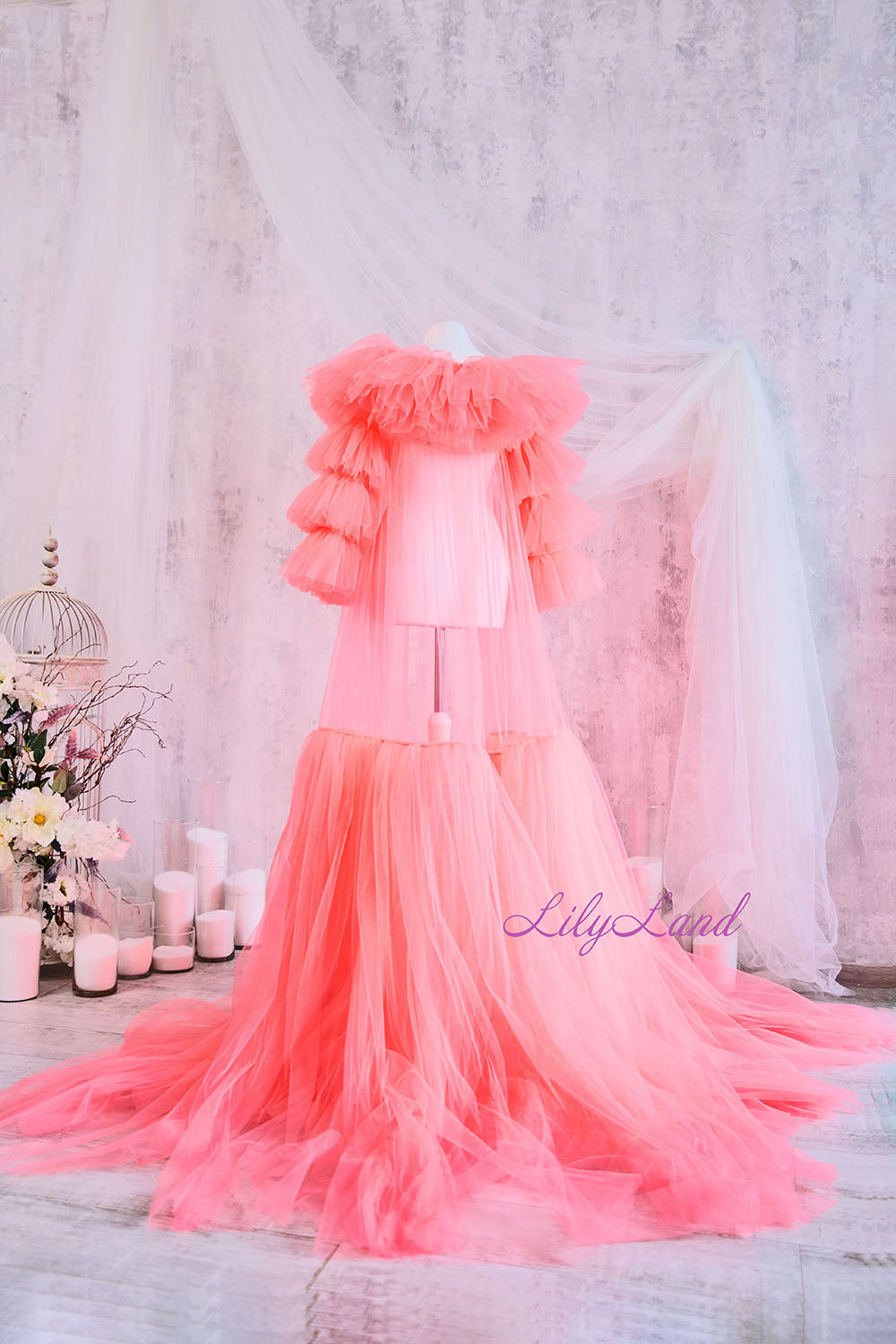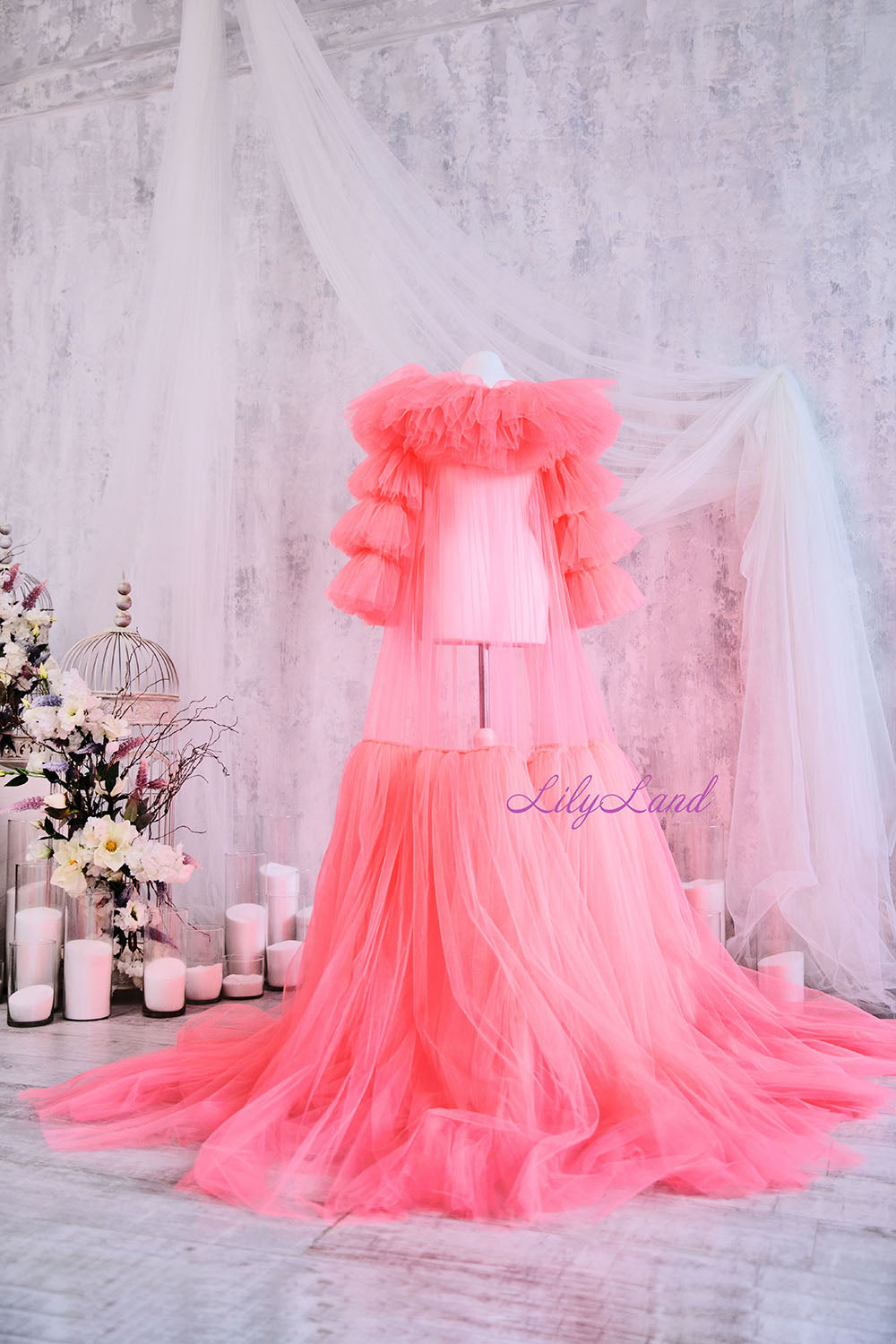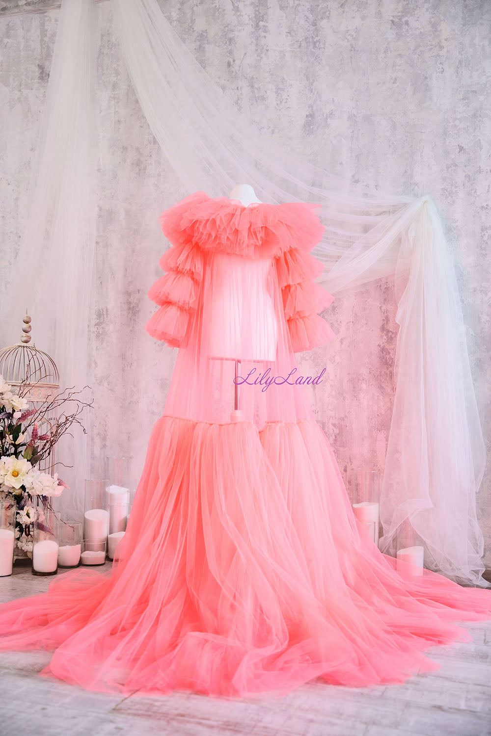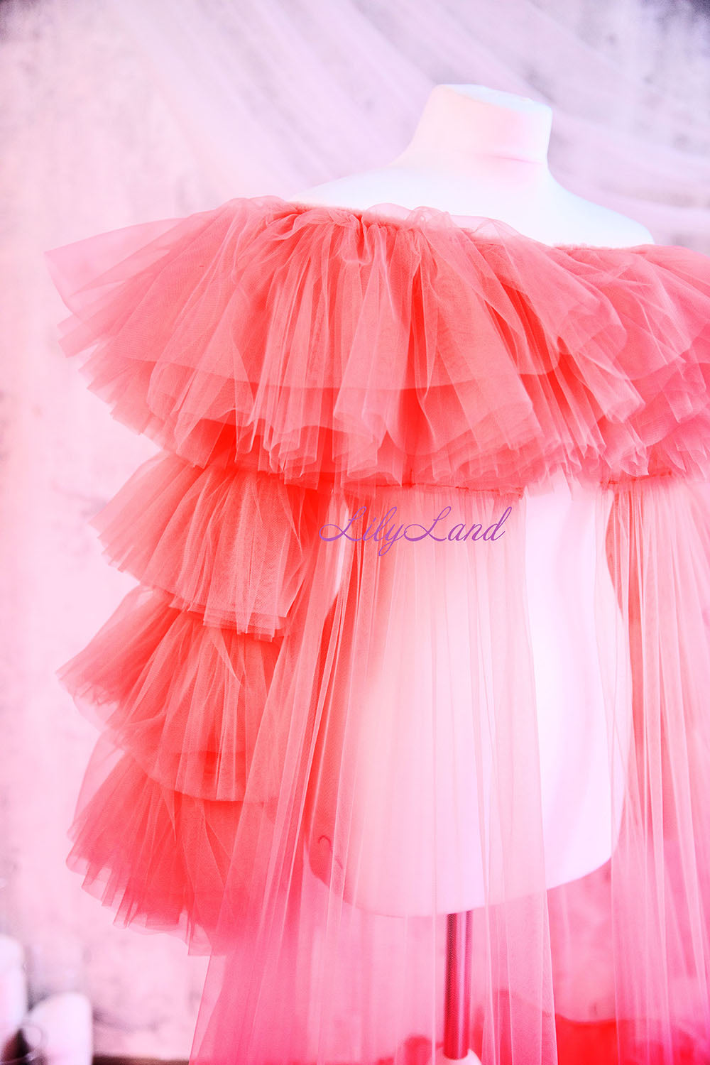 Esta delicada bata de color rosa le ayudará a crear maravillosas fotografías que le servirán como un grato recuerdo durante muchos años. Esta bata de maternidad hecha a mano, con su diseño excepcionalmente original y moderno elaborado con tul de alta calidad, es la elección perfecta para sesiones de fotos, baby showers, sesiones de fotografía u otras ocasiones especiales. La bata se puede realizar en varios colores y tamaños, teniendo en cuenta todos los deseos del comprador.