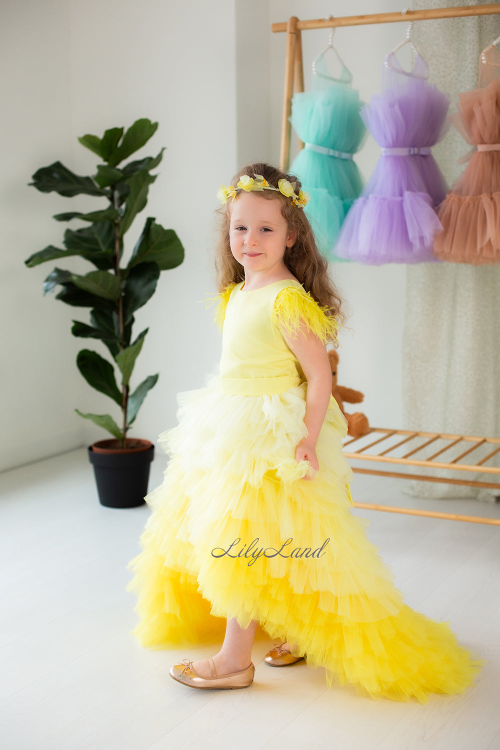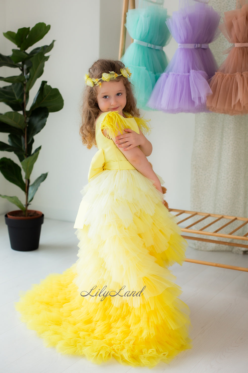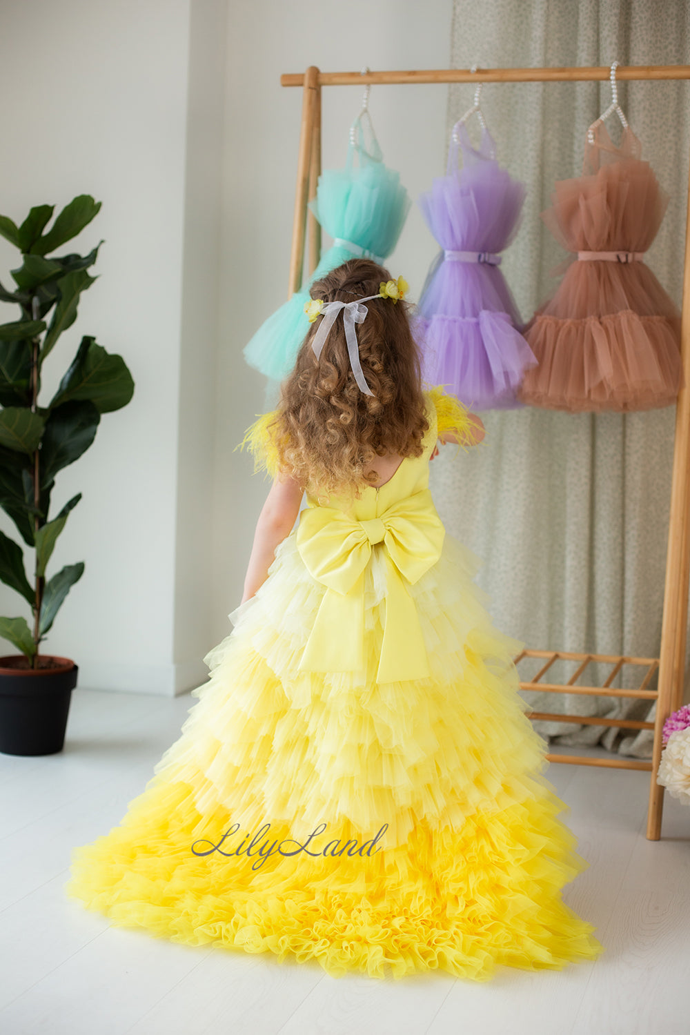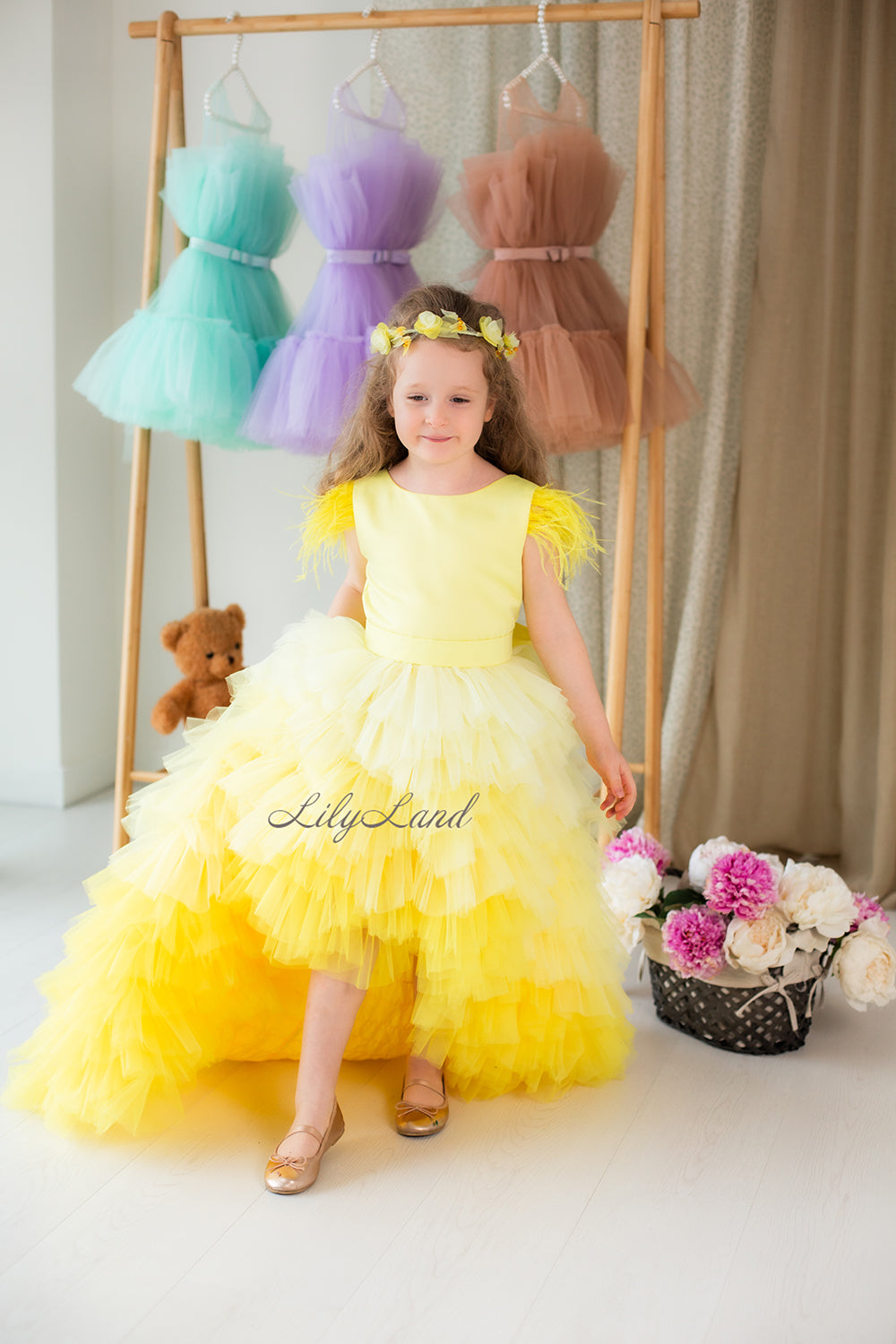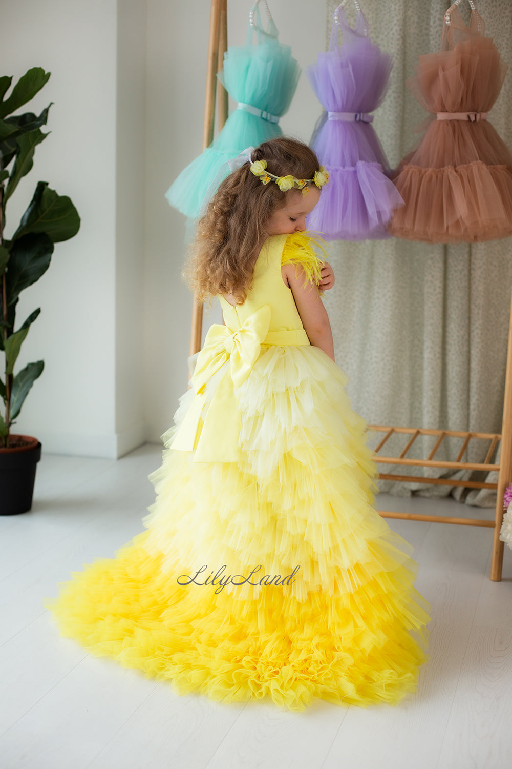 A fantastic choice for stylish young girls is the Ursula dress in a yellow ombre color. This dress is perfect for any occasion, highlighting each girl's unique style. It's made of high-quality materials that feel really nice on the skin and stay looking great for a long time. This lovely outfit is great for lots of celebrations like birthdays, weddings, proms, parties, and more. It's also perfect for taking photos, going to dances, or just pretending to be a fairy or princess, flower girl.