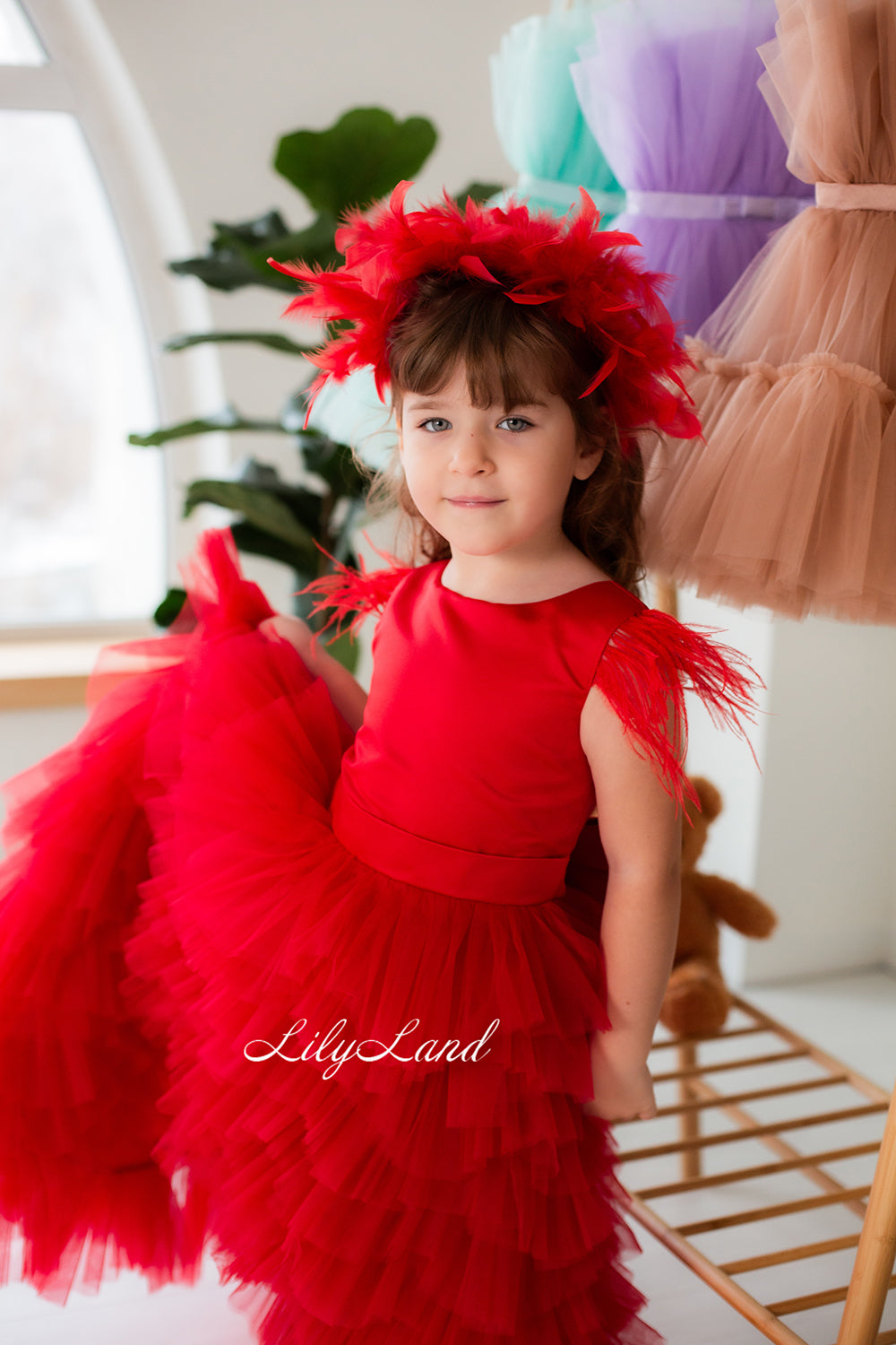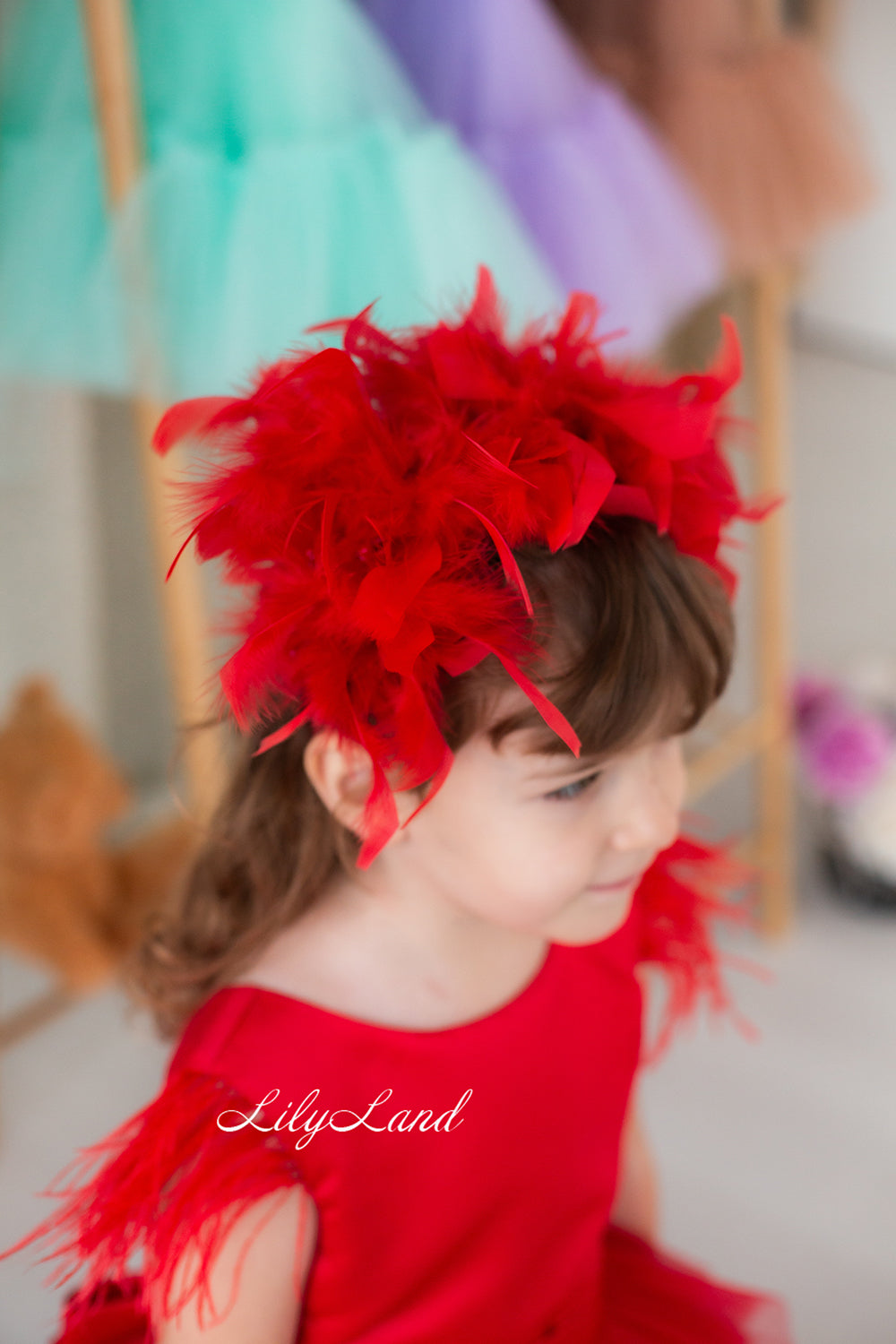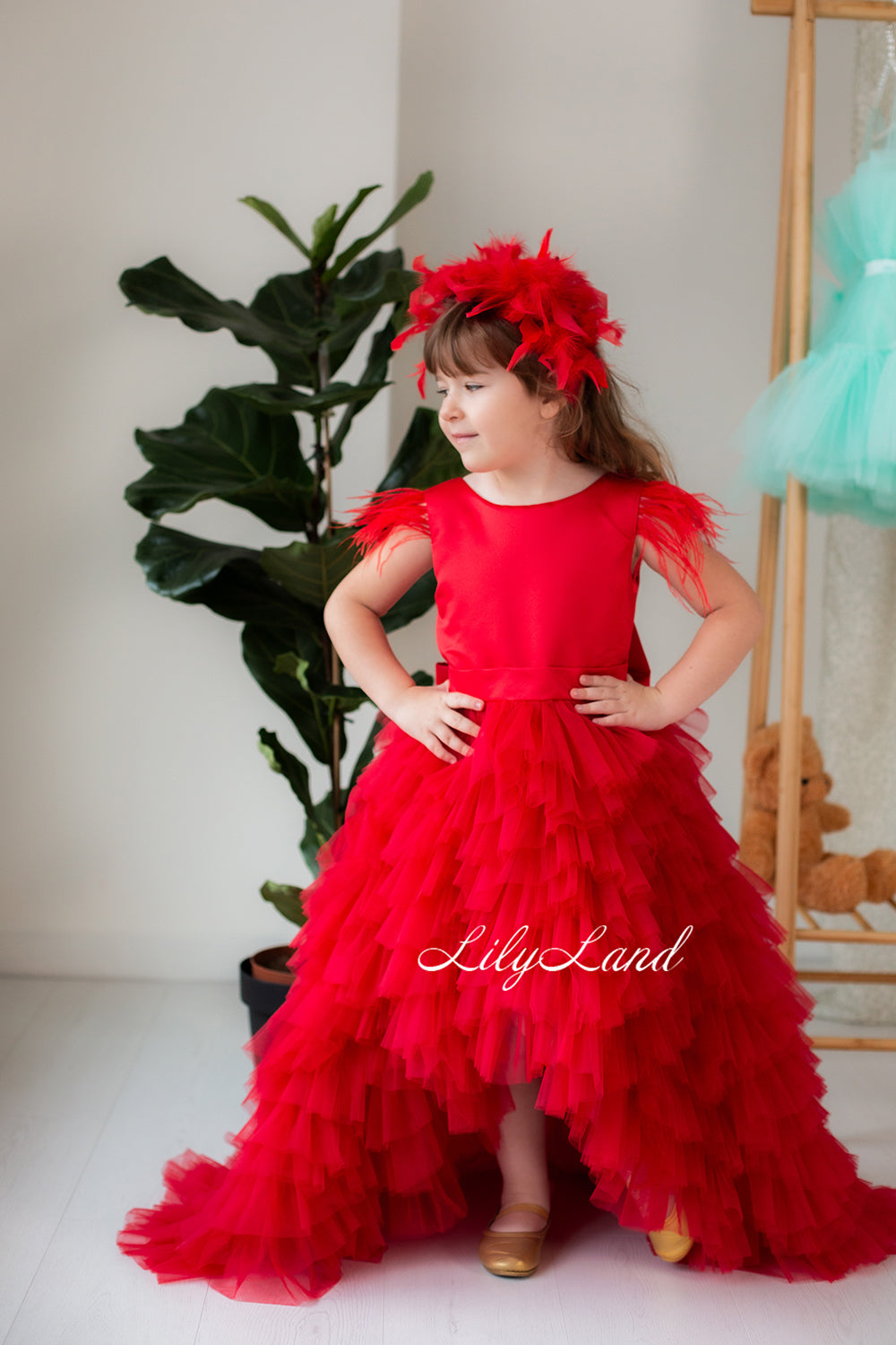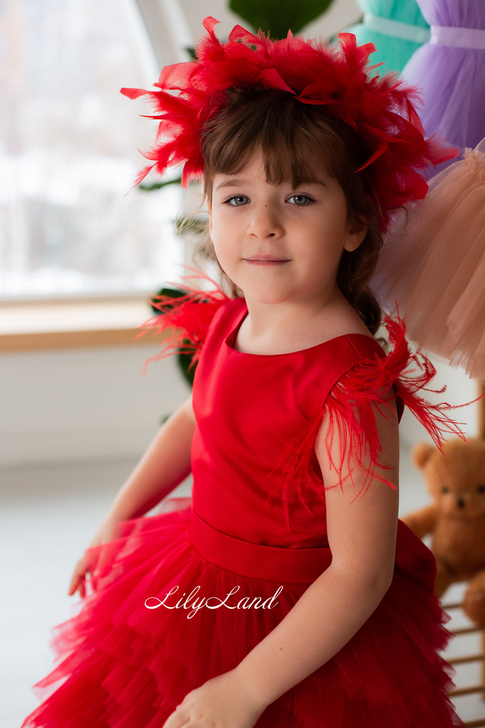 Ursula Girl Dress with Feather Sleeves In Red