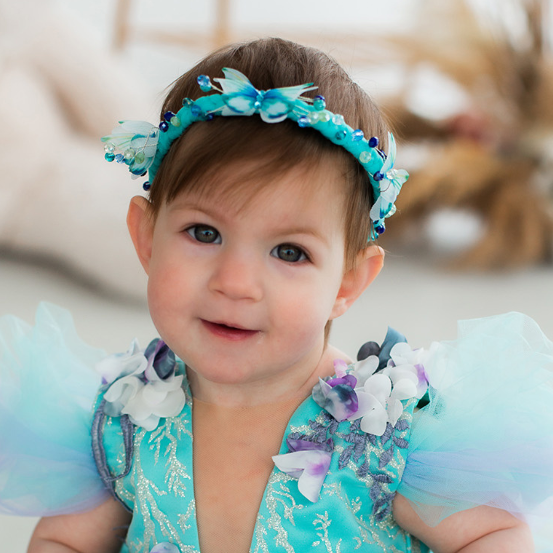 The headband is a beautiful accessory for a little princess. Made of blue tulle in the form of a braid, it is adorned with delicate blue butterflies and matching crystal beads. An elastic band at the back ensures a comfortable fit. Available in various colors, this headband complements any outfit perfectly, tailored to the buyer's wishes. Perfect for a prom ball, pageant, flower girl, birthdays, or any special occasion.