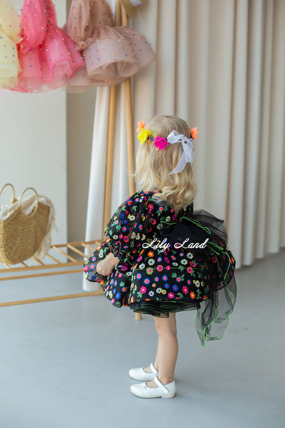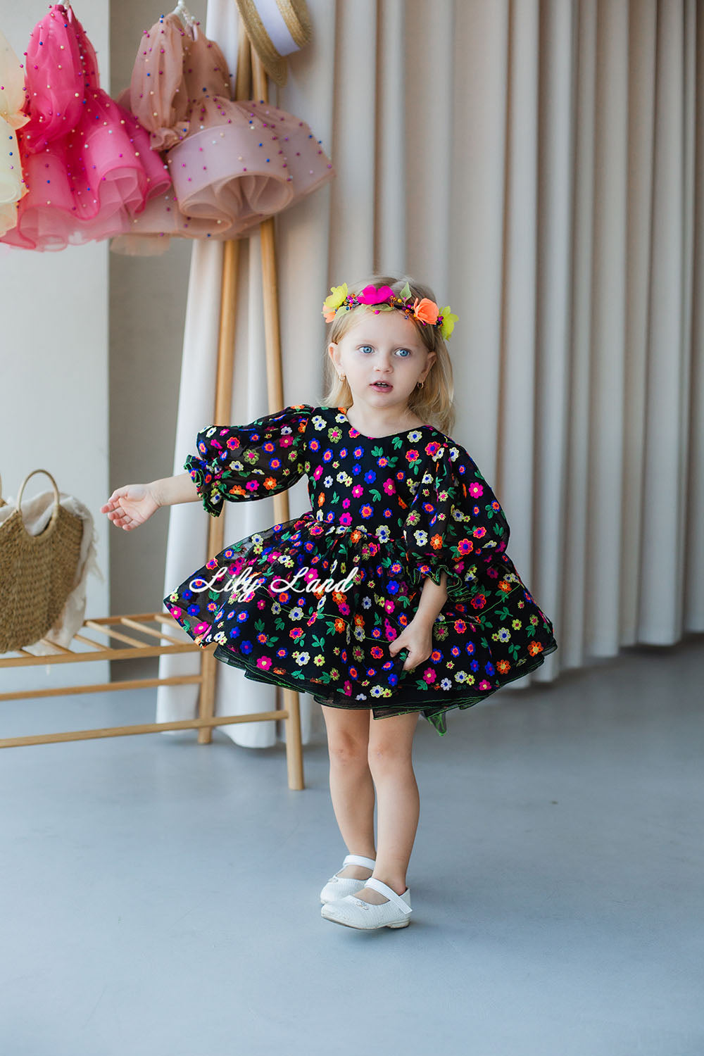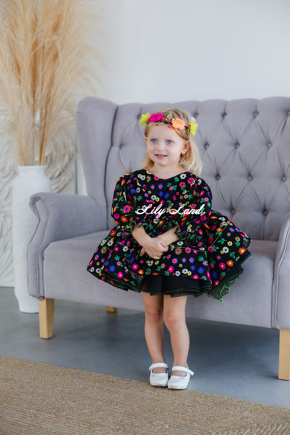 Cheryl Puffy Girl Dress in Black with Multicolored Bright Flowers