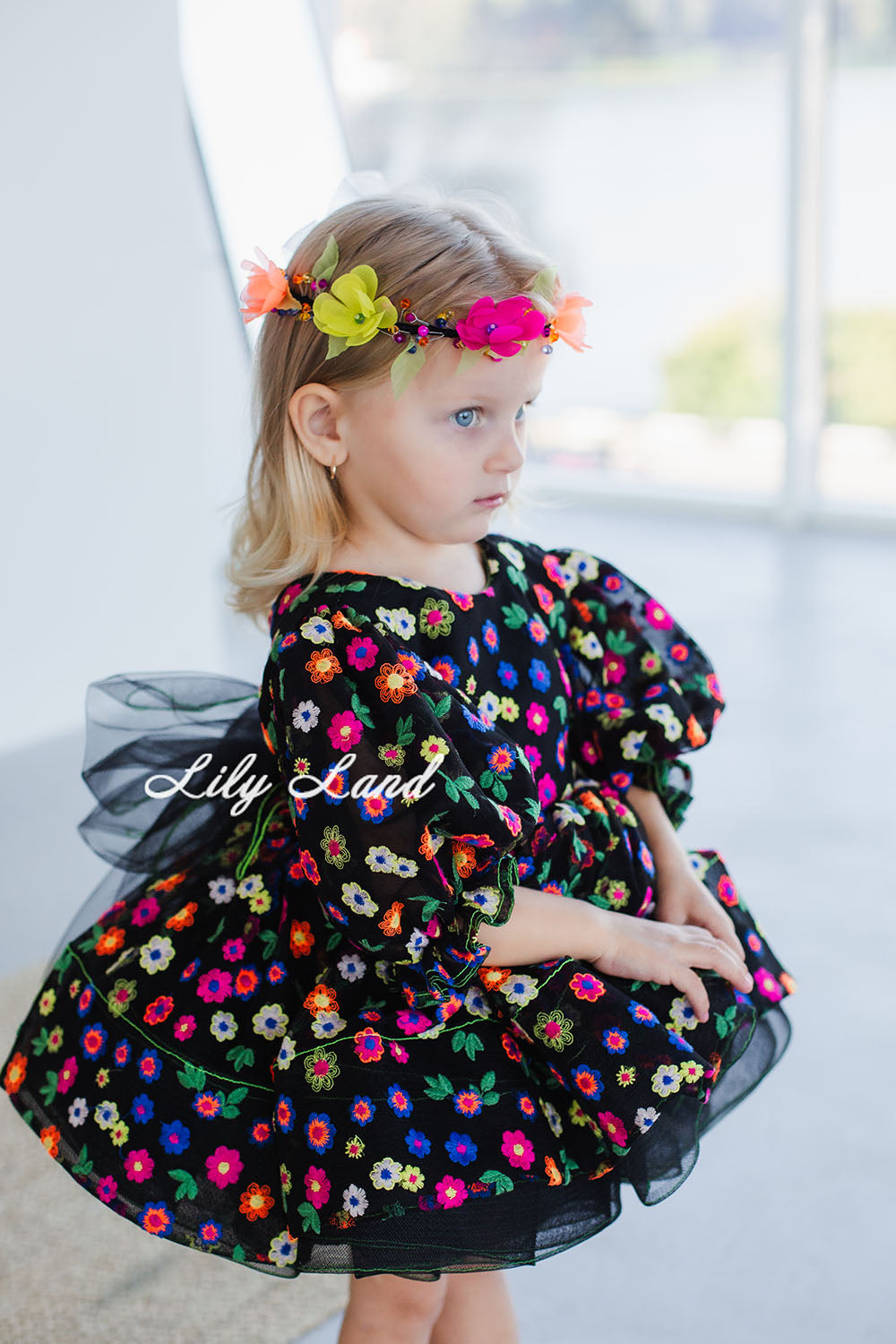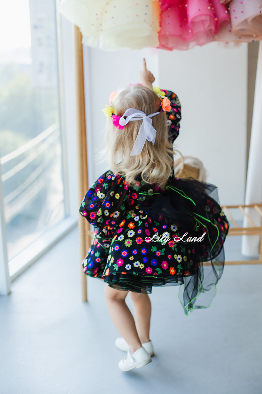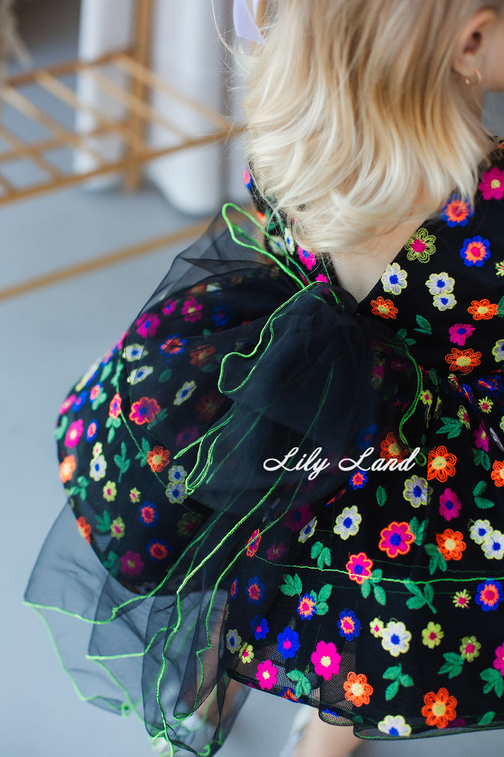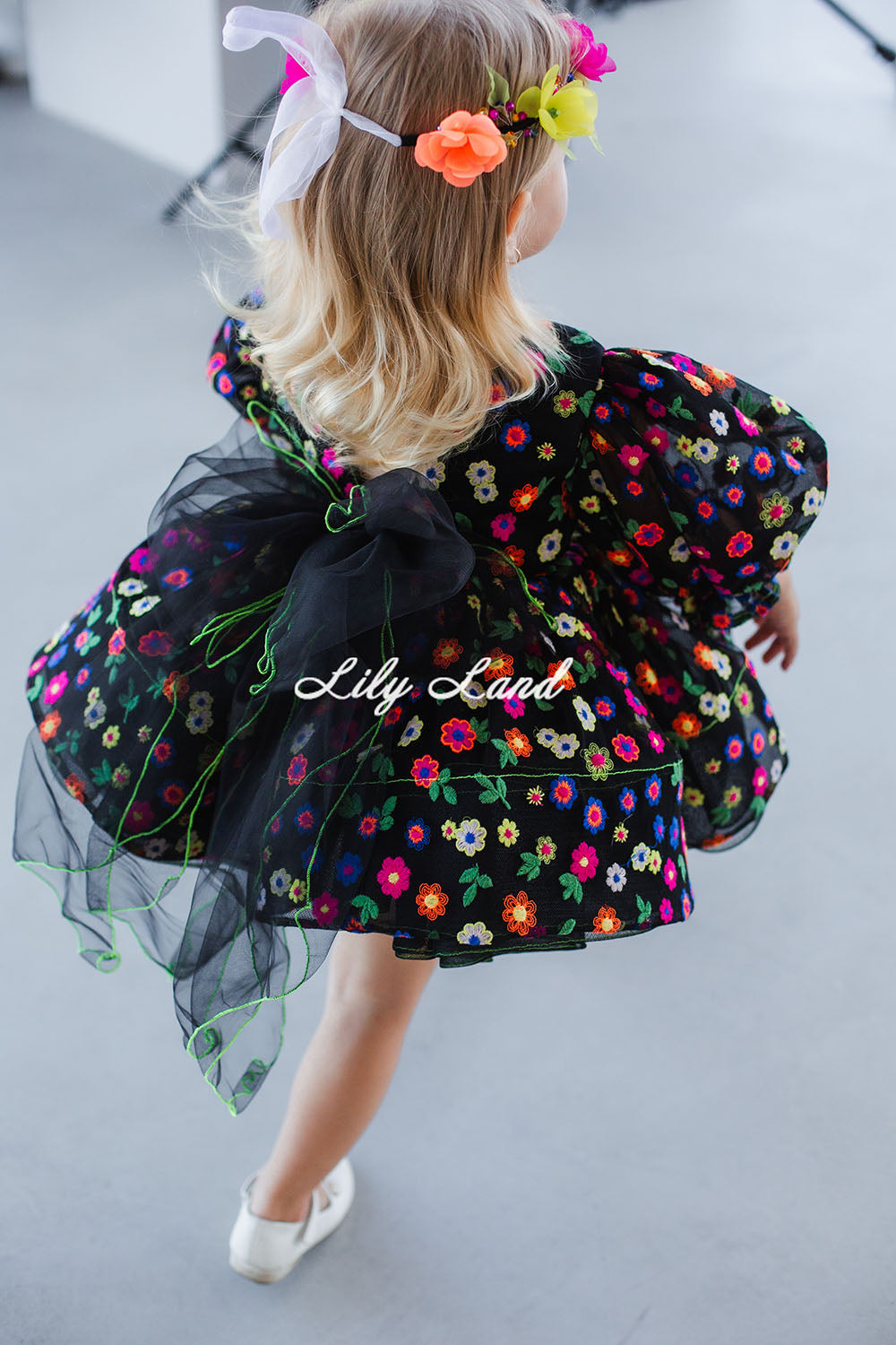 Cheryl Puffy Girl Dress in Black with Multicolored Bright Flowers