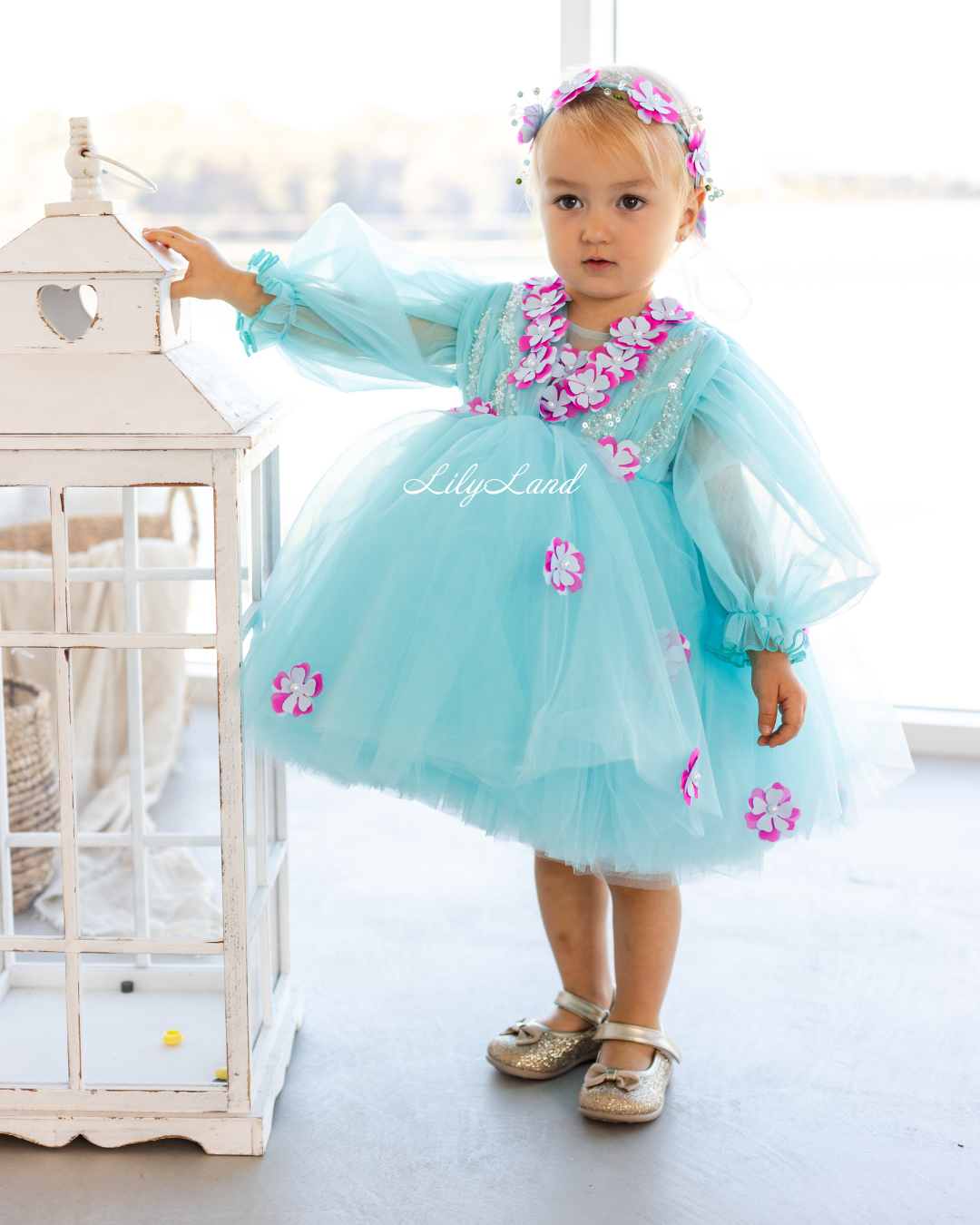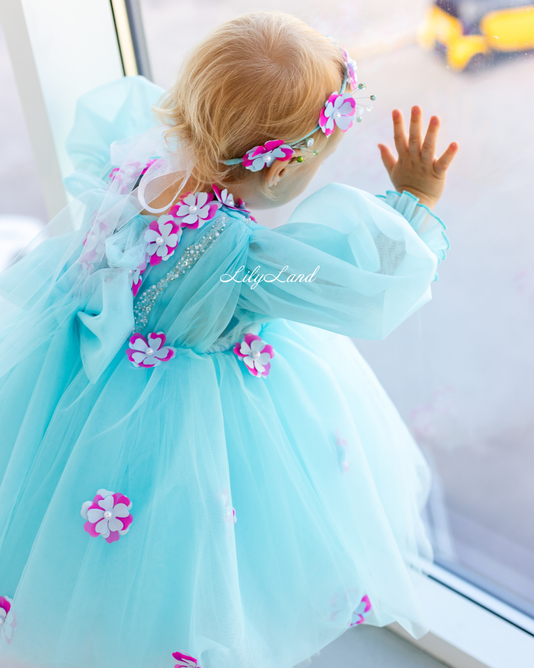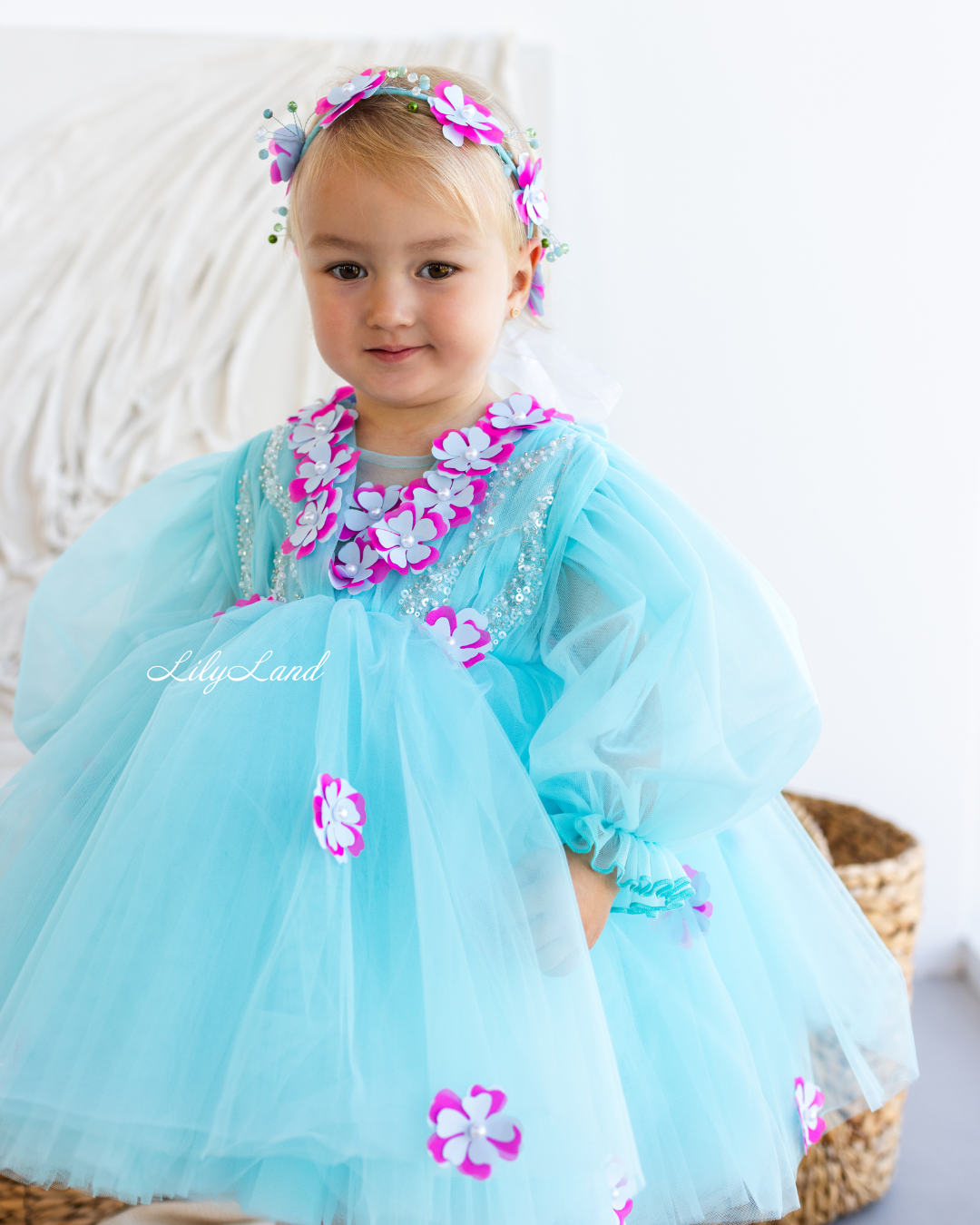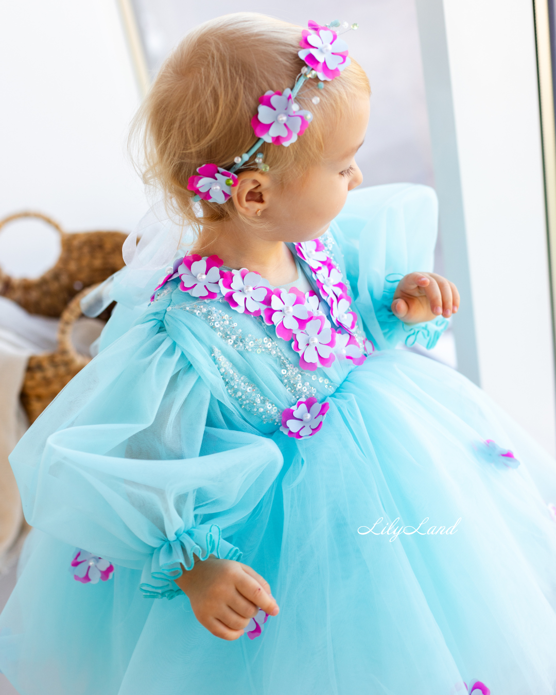 Introducing our Fifi dress from the NEW 2024 collection, now available in a stunning Tiffany color! This enchanting dress features a top beautifully decorated with attached fuchsia flowers, pearls, beads, and sequins, adding a touch of glamour and elegance. Made with tulle, this versatile dress is perfect for a variety of celebrations, including Christmas, birthday parties, weddings, flower girl or junior bridesmaid roles, proms, photoshoots, Valentine's Day, dances, elegant evenings, and more. Customize it in different colors and sizes to suit your preferences, and let your little one shine in this exquisite attire.