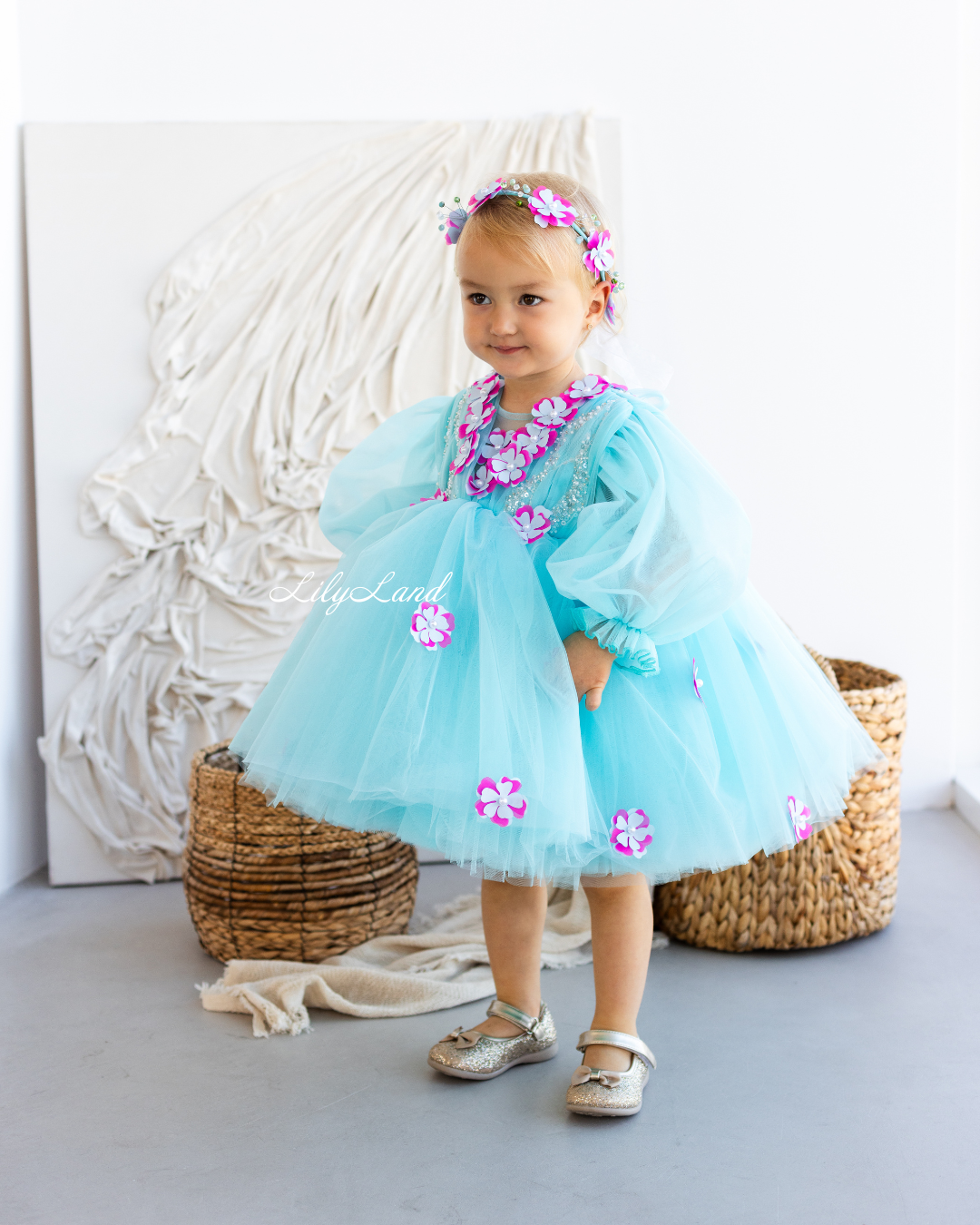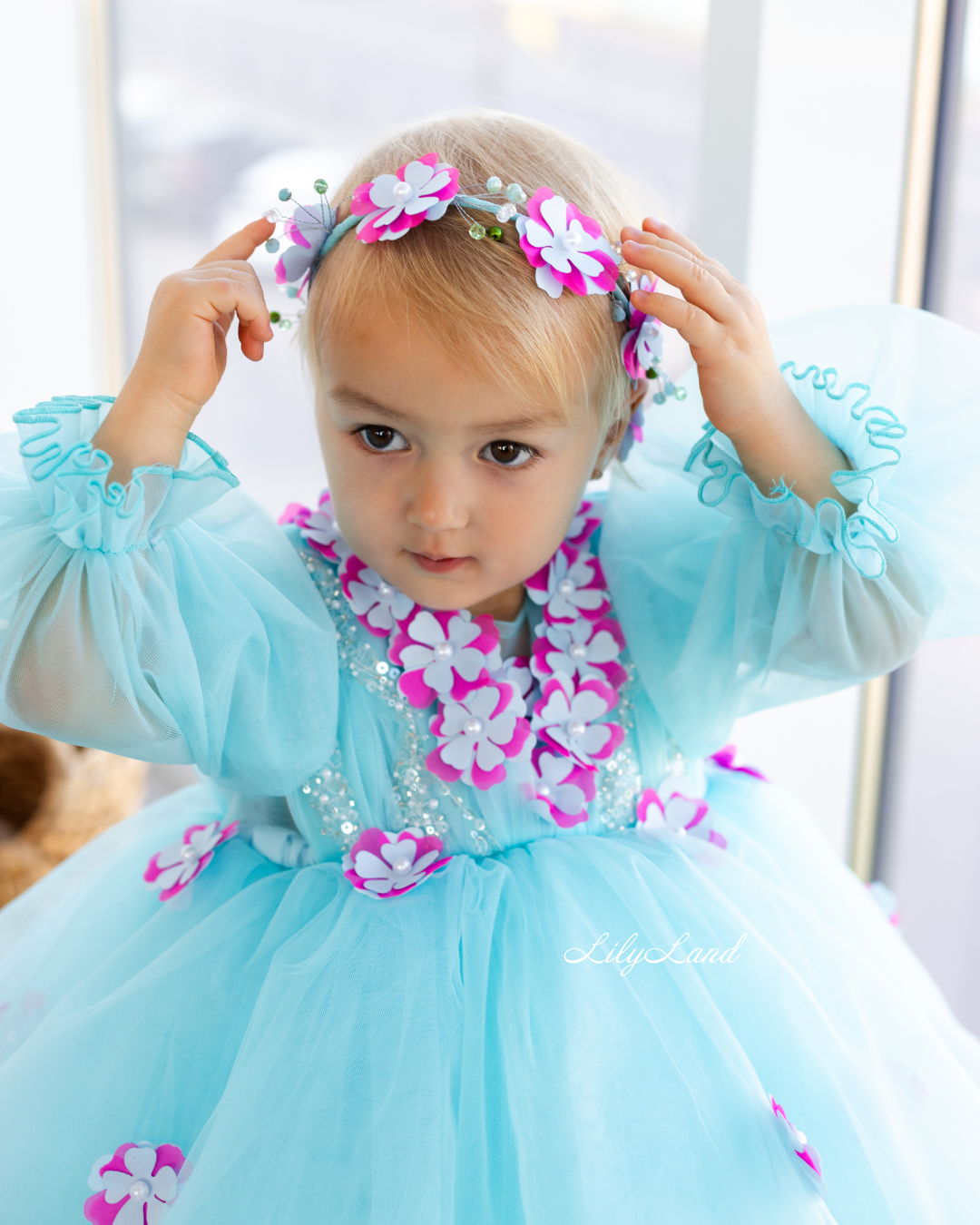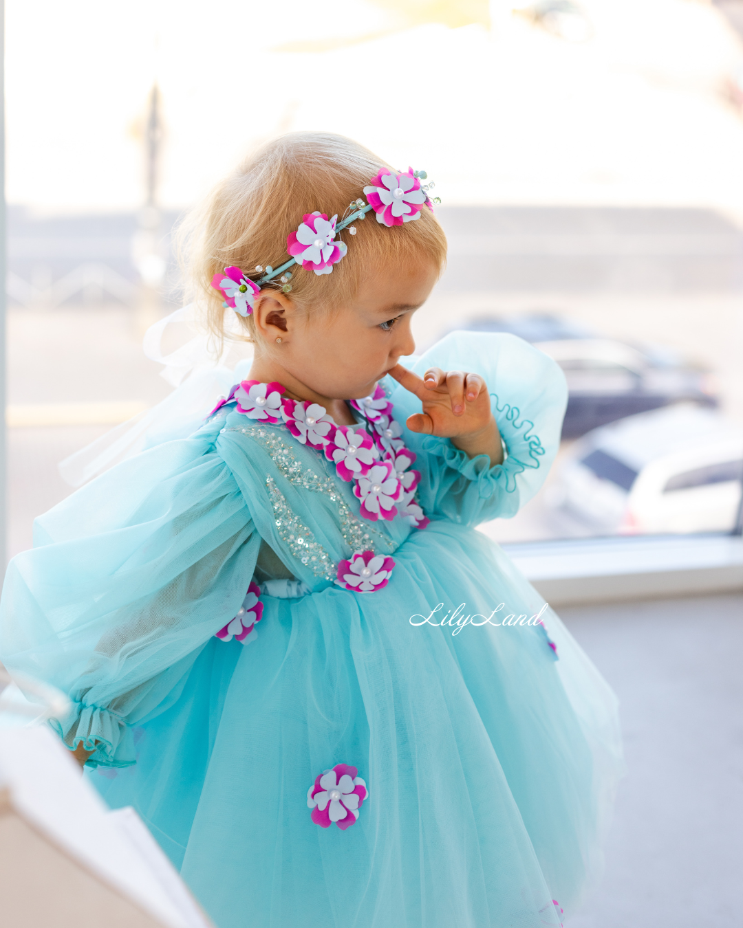 Introducing our Fifi dress from the NEW 2024 collection, now available in a stunning Tiffany color! This enchanting dress features a top beautifully decorated with attached fuchsia flowers, pearls, beads, and sequins, adding a touch of glamour and elegance. Made with tulle, this versatile dress is perfect for a variety of celebrations, including Christmas, birthday parties, weddings, flower girl or junior bridesmaid roles, proms, photoshoots, Valentine's Day, dances, elegant evenings, and more. Customize it in different colors and sizes to suit your preferences, and let your little one shine in this exquisite attire.