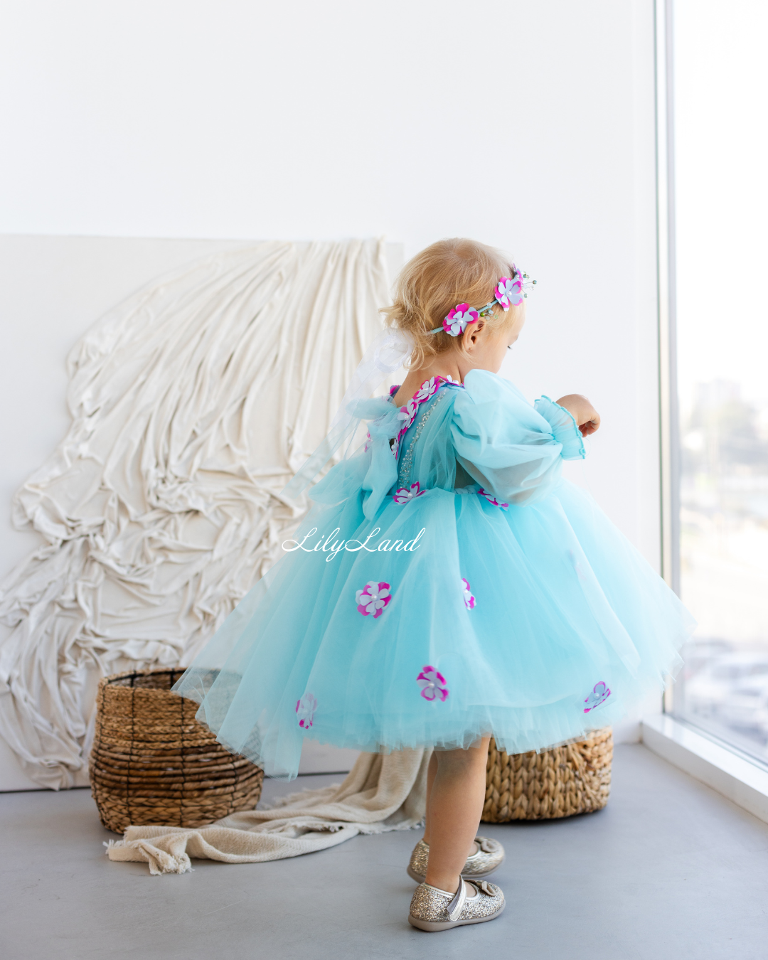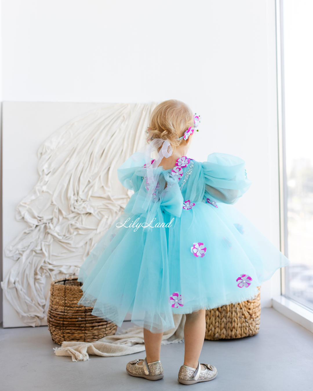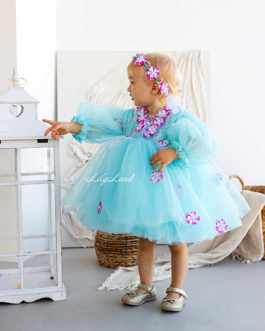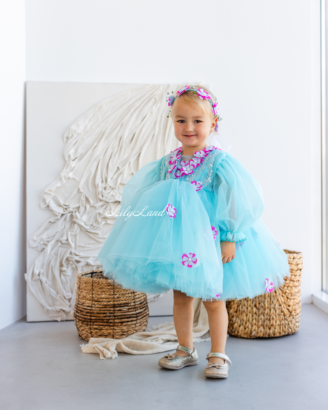 Introducing our Fifi dress from the NEW 2024 collection, now available in a stunning Tiffany color! This enchanting dress features a top beautifully decorated with attached fuchsia flowers, pearls, beads, and sequins, adding a touch of glamour and elegance. Made with tulle, this versatile dress is perfect for a variety of celebrations, including Christmas, birthday parties, weddings, flower girl or junior bridesmaid roles, proms, photoshoots, Valentine's Day, dances, elegant evenings, and more. Customize it in different colors and sizes to suit your preferences, and let your little one shine in this exquisite attire.