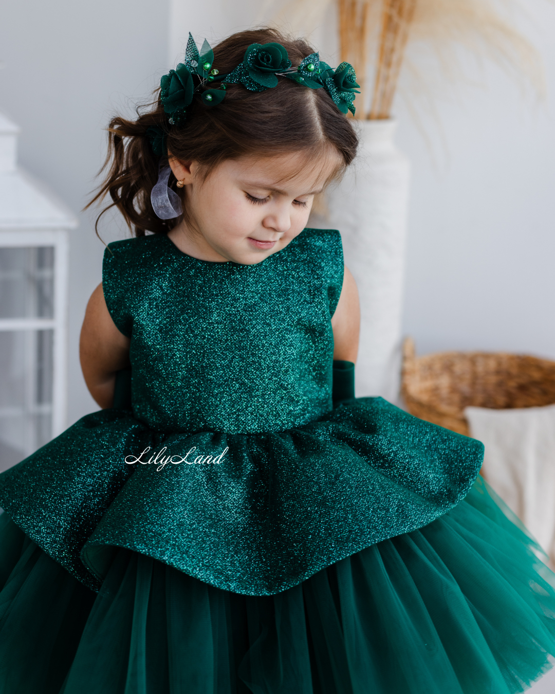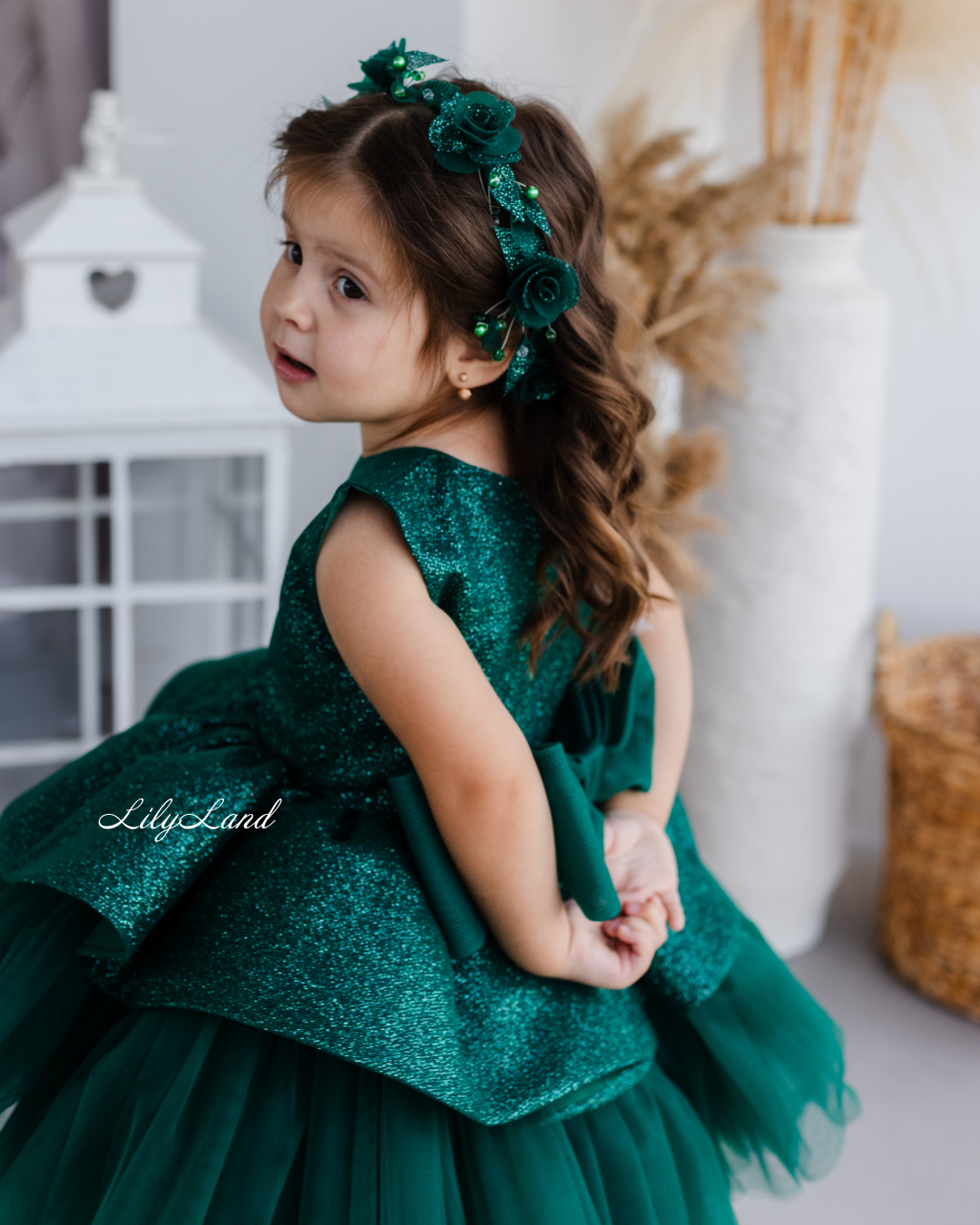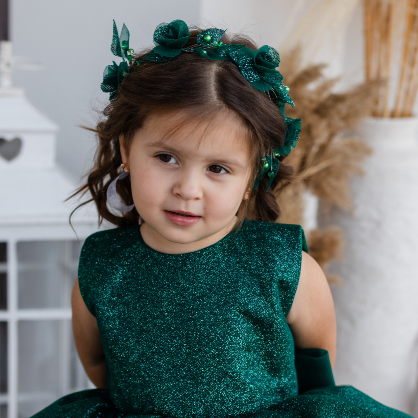 Girl Hair Accessories with Roses and Glitter Leaves in Emerald Green