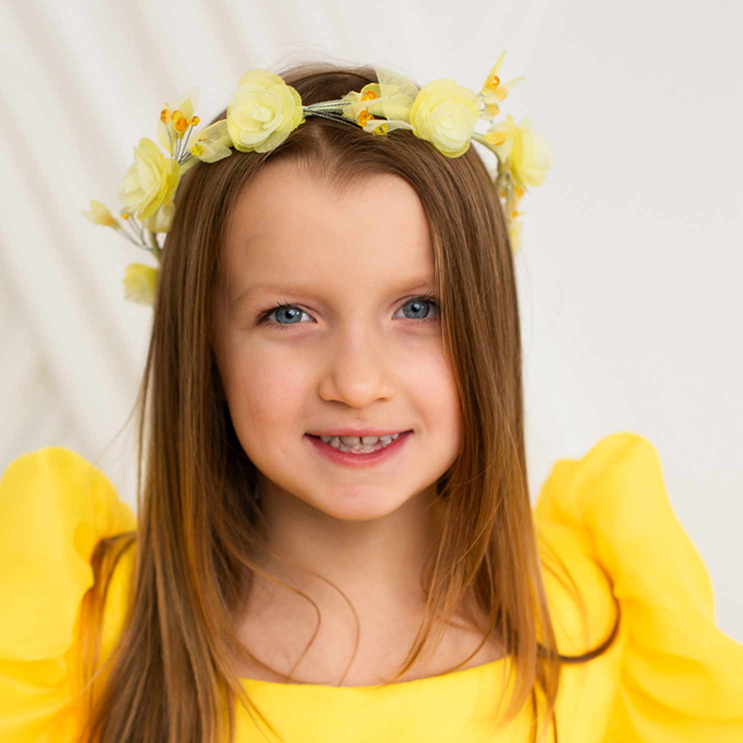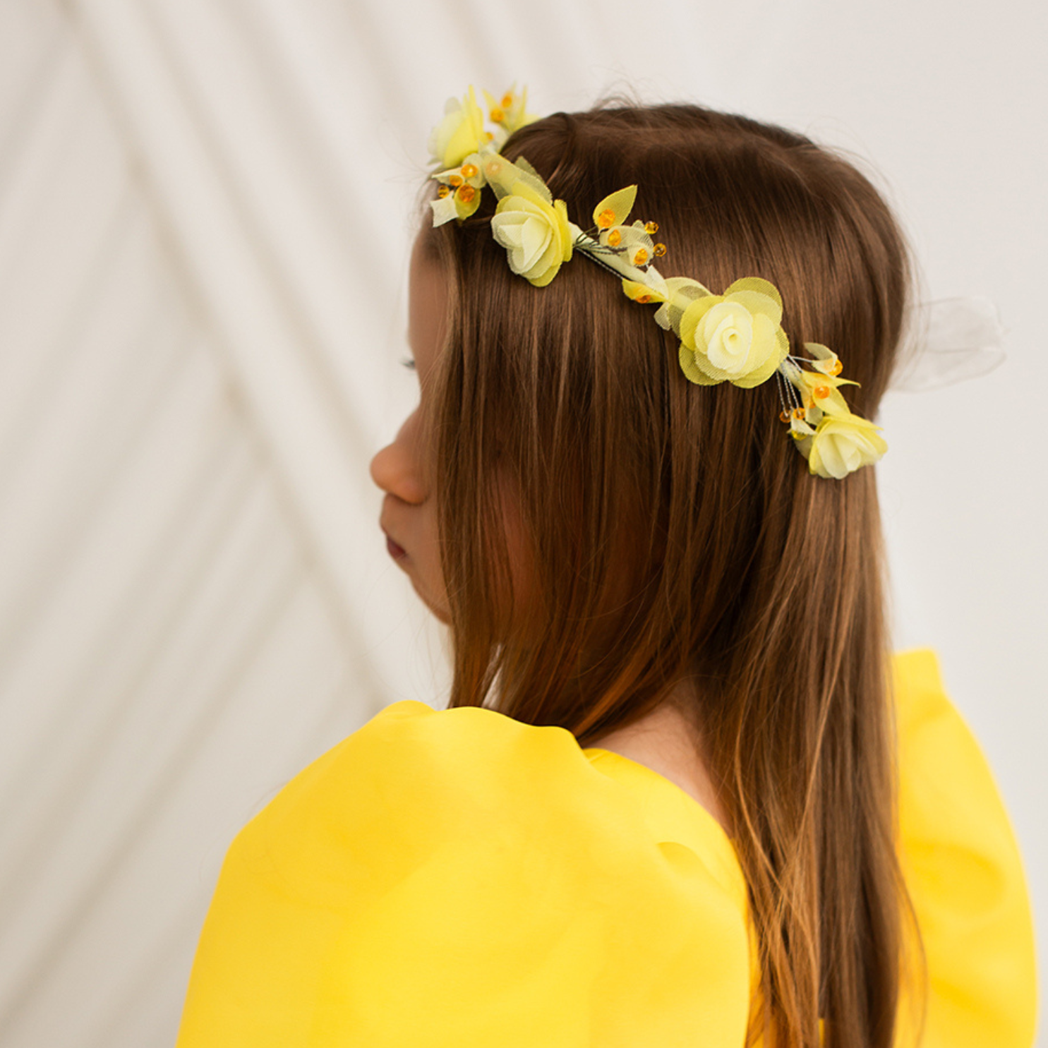 A yellow headband adorned with tulle flowers in the shape of roses, decorated with branches and beads, tied at the back with an organza bow. The headband can be made in various colors, perfectly matching any girl's outfit, tailored to the buyer's preferences.