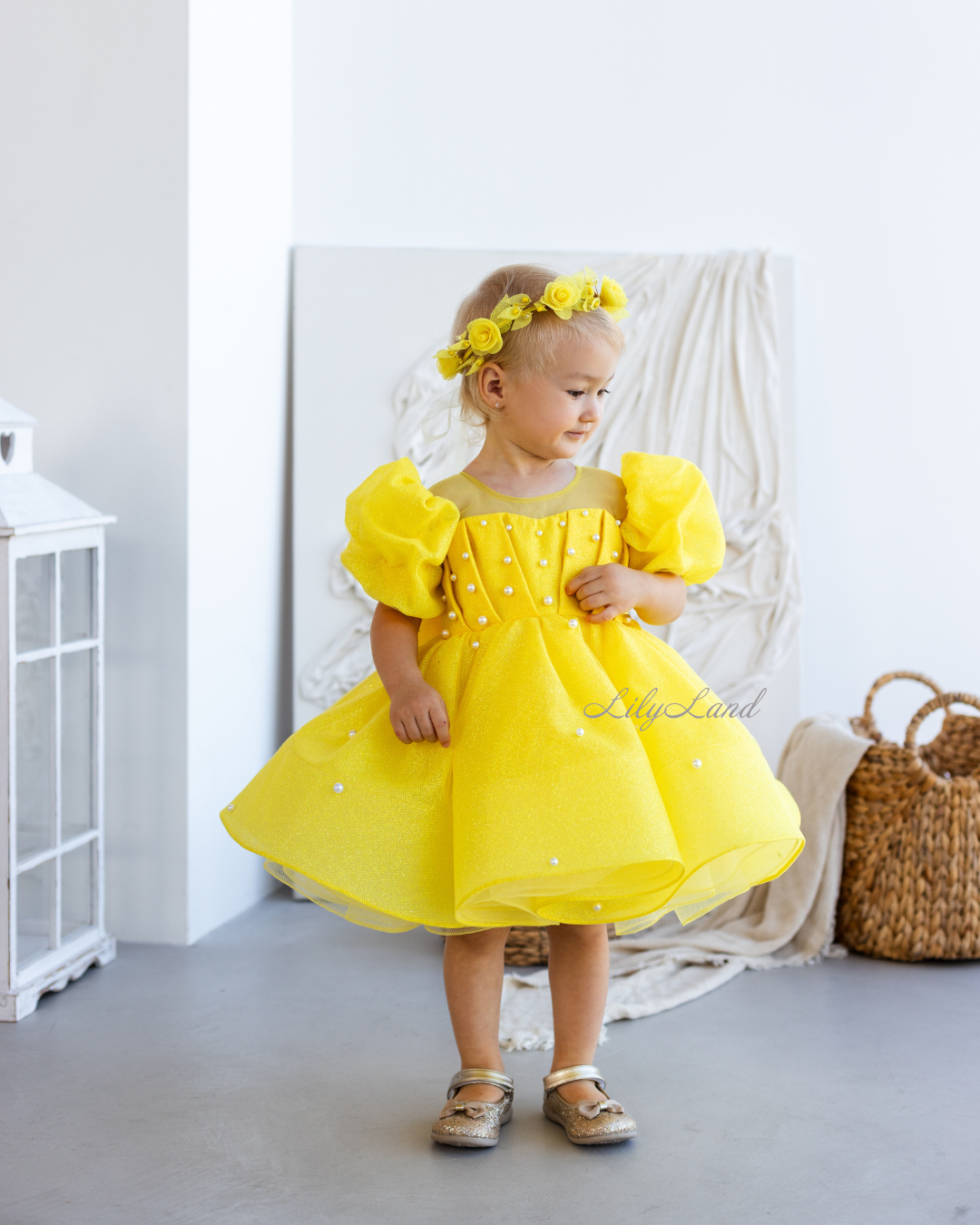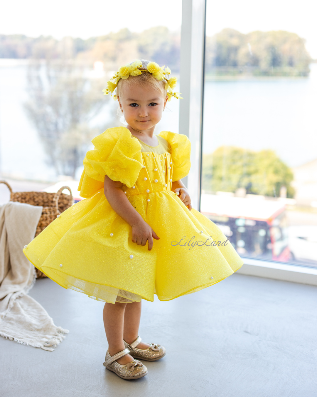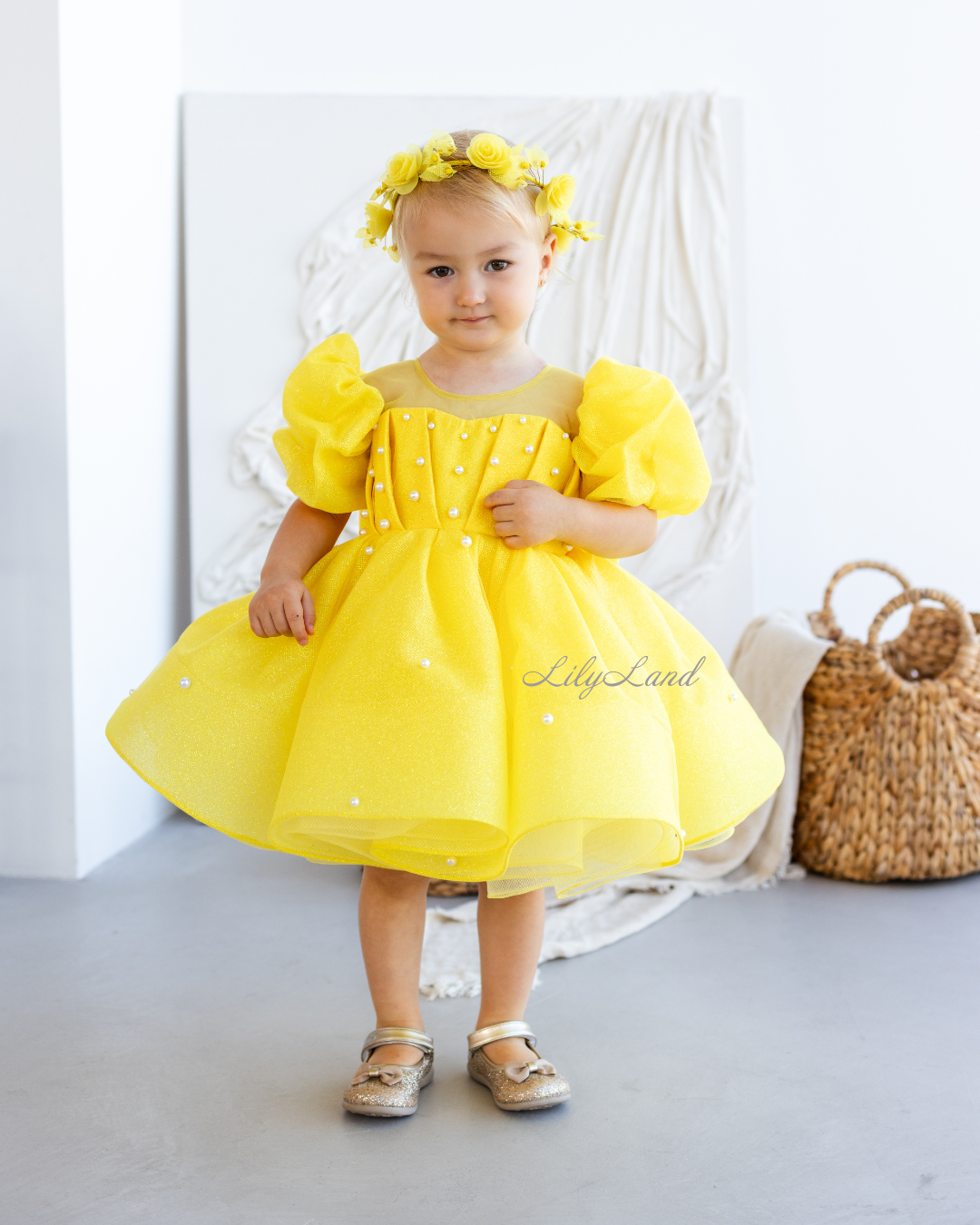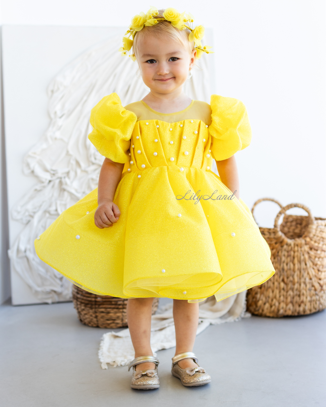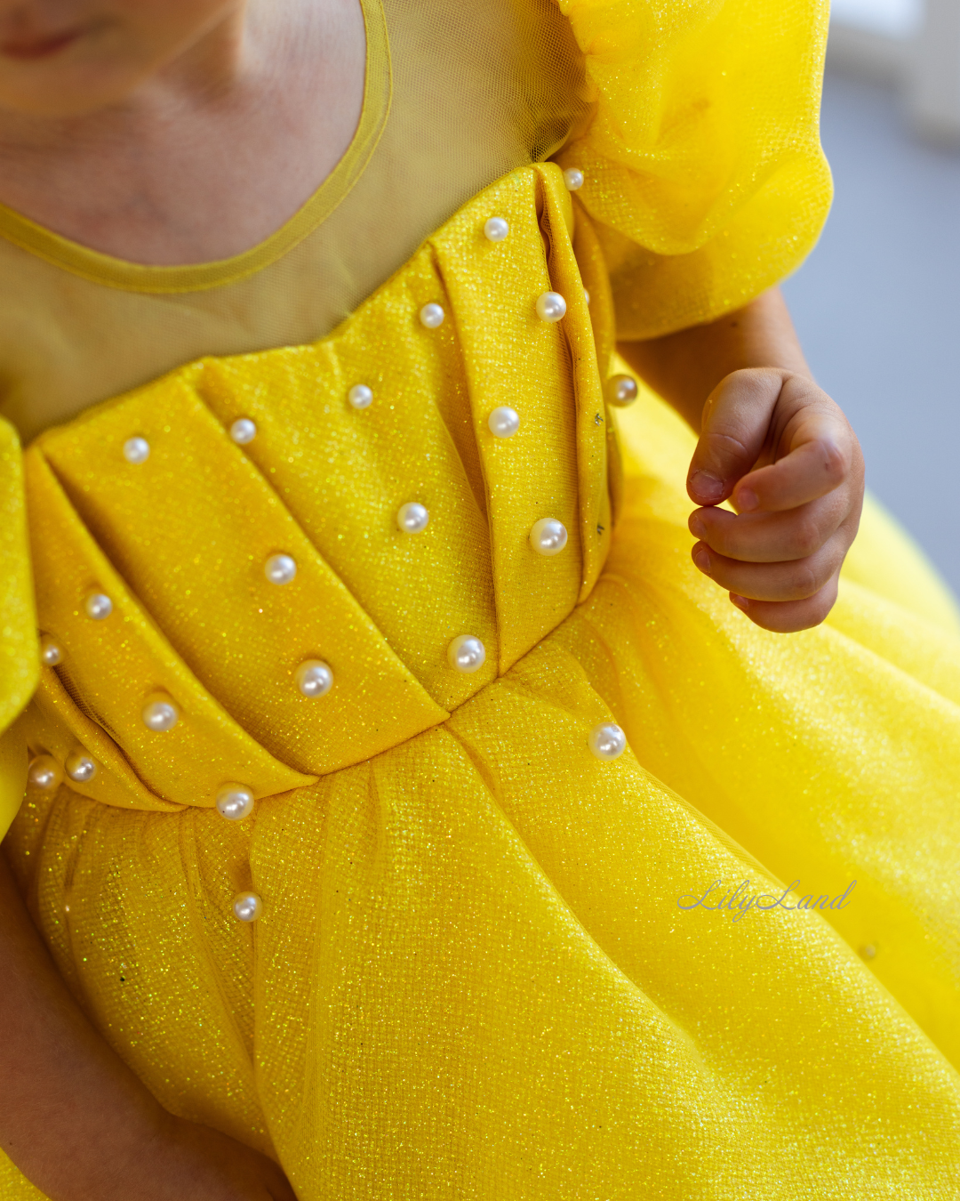 Kira Glitter Puffy Girl Dress in Yellow with Beads