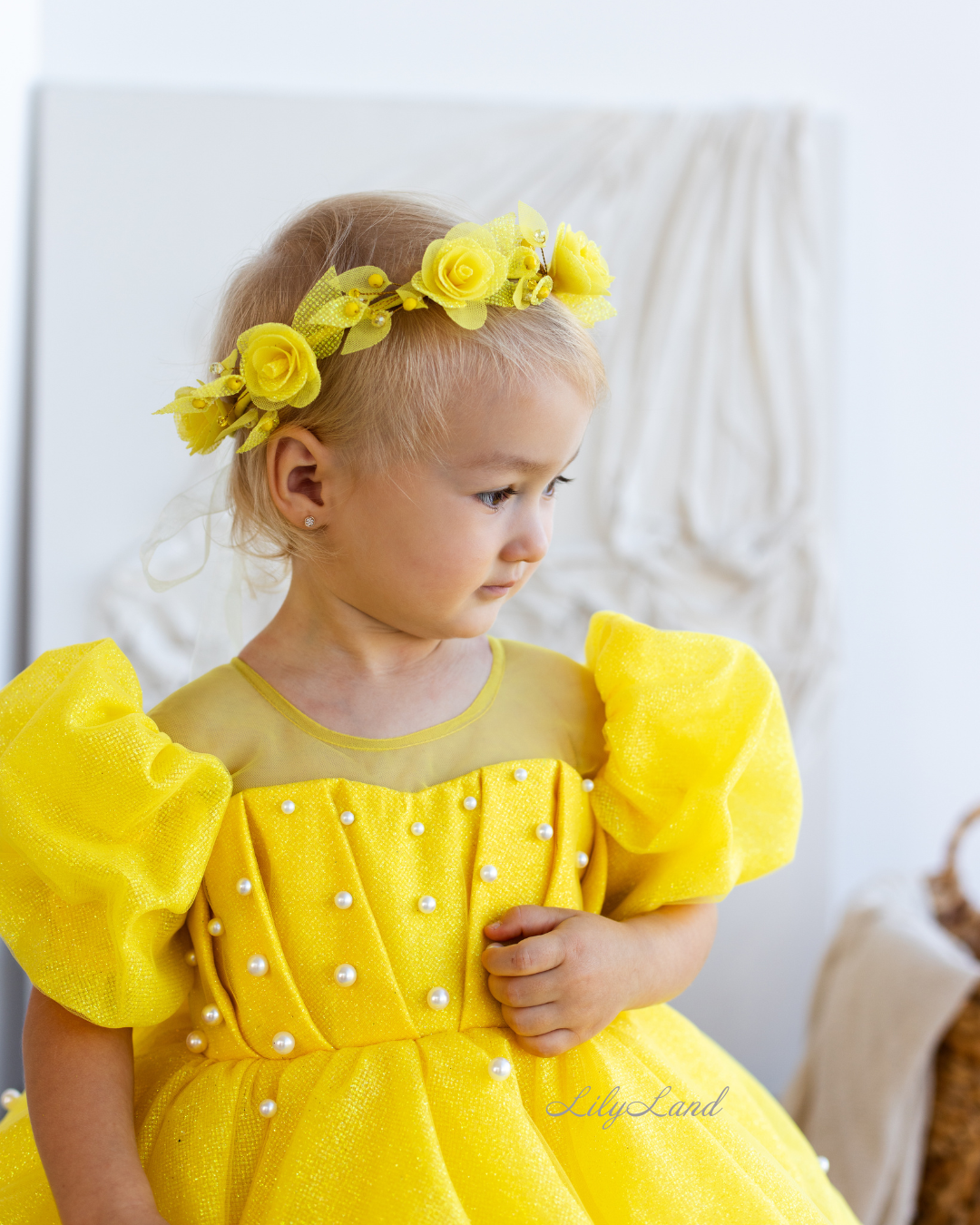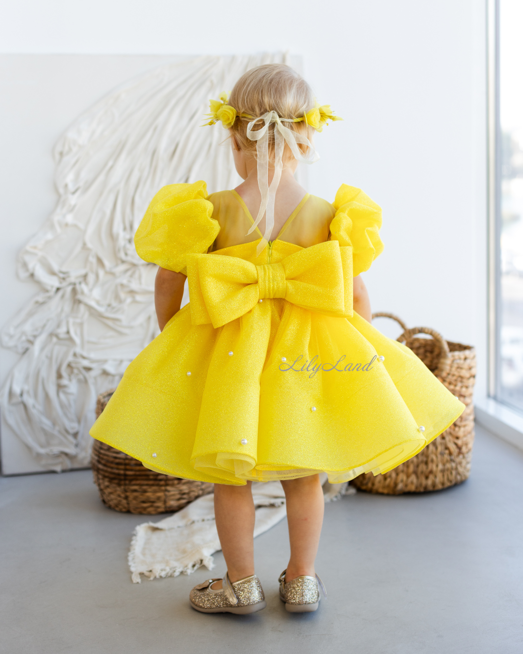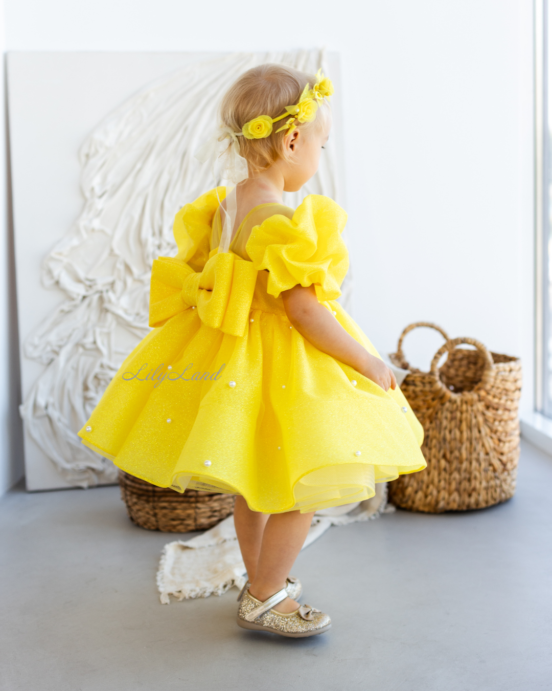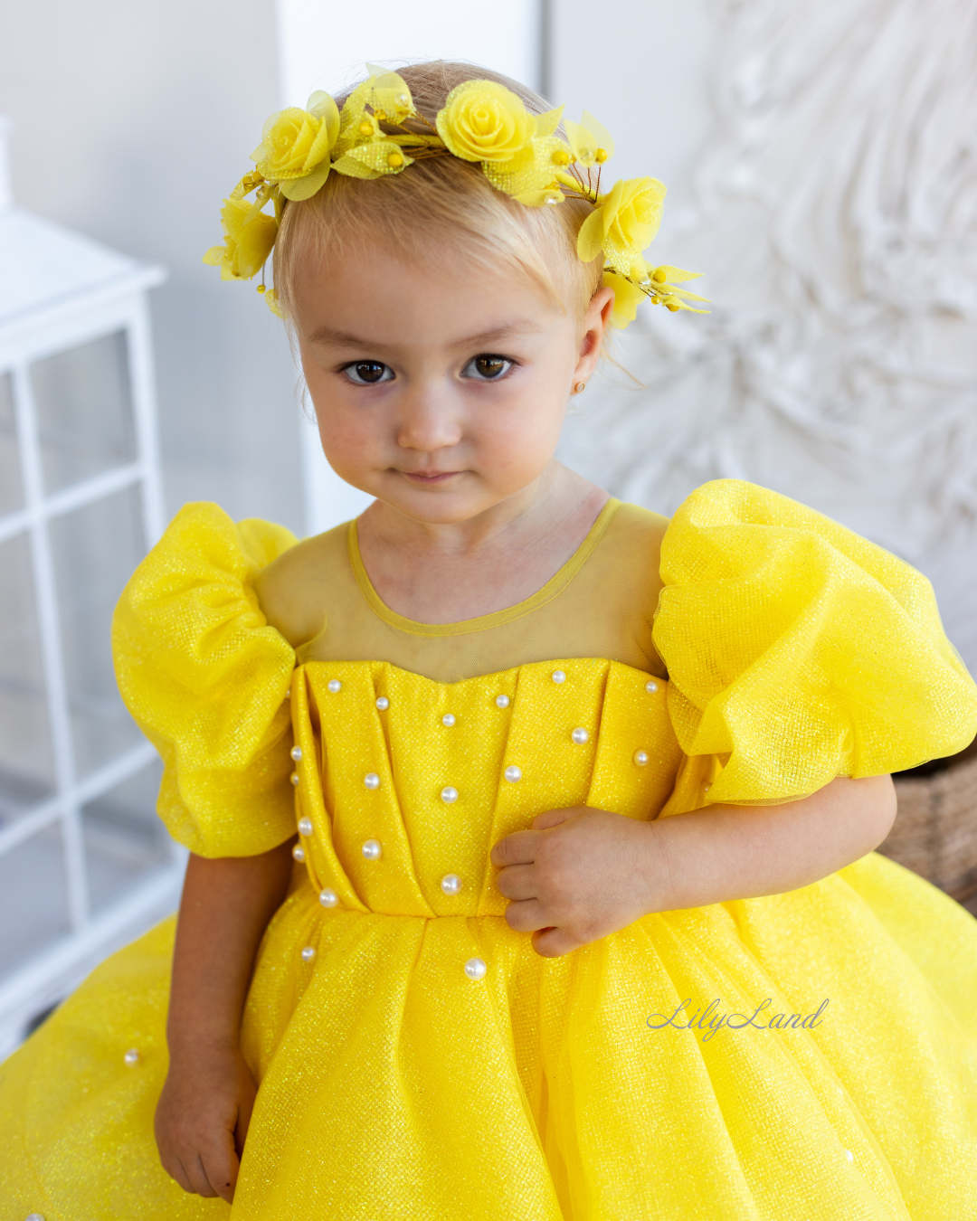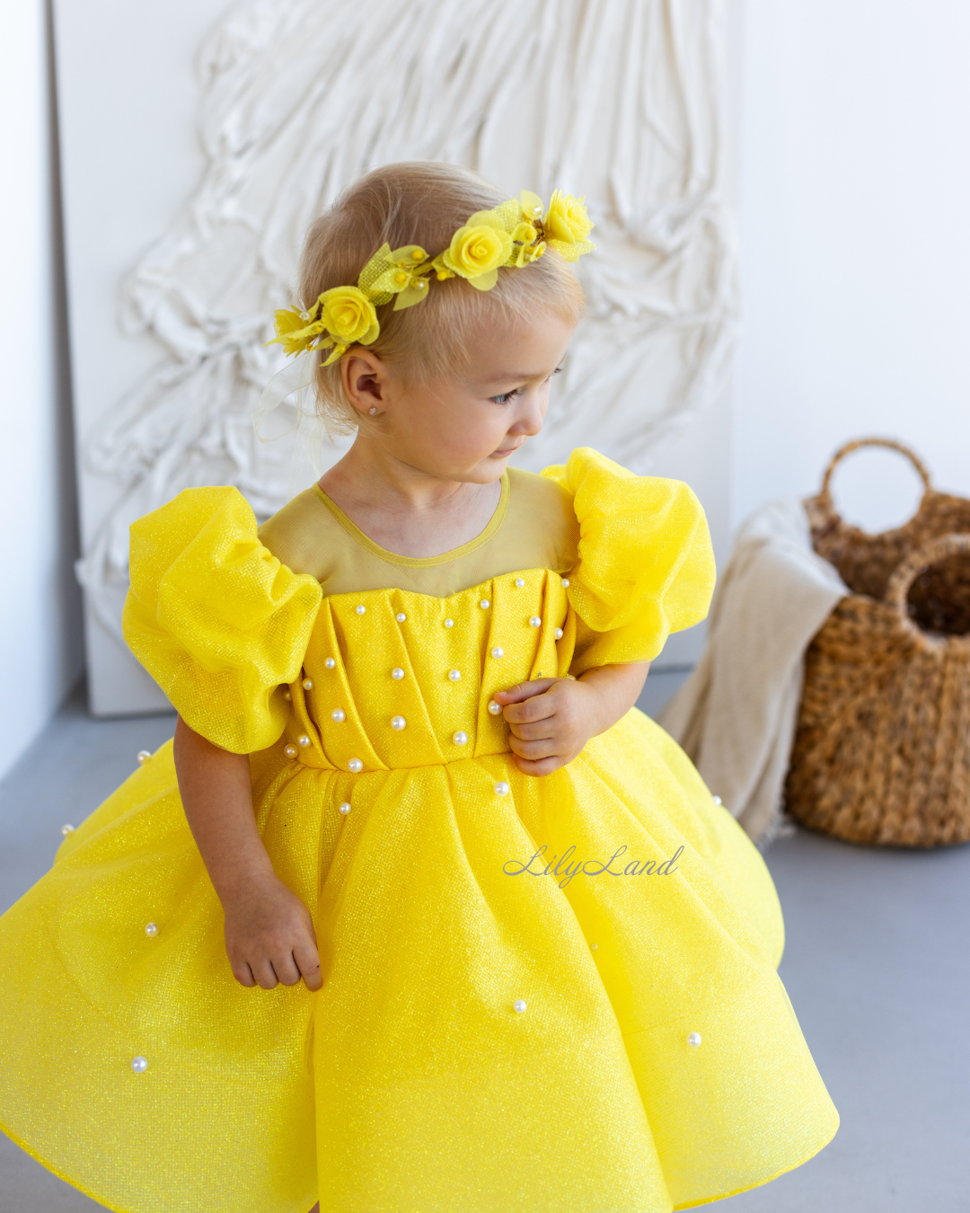 Kira Glitter Puffy Girl Dress in Yellow with Beads