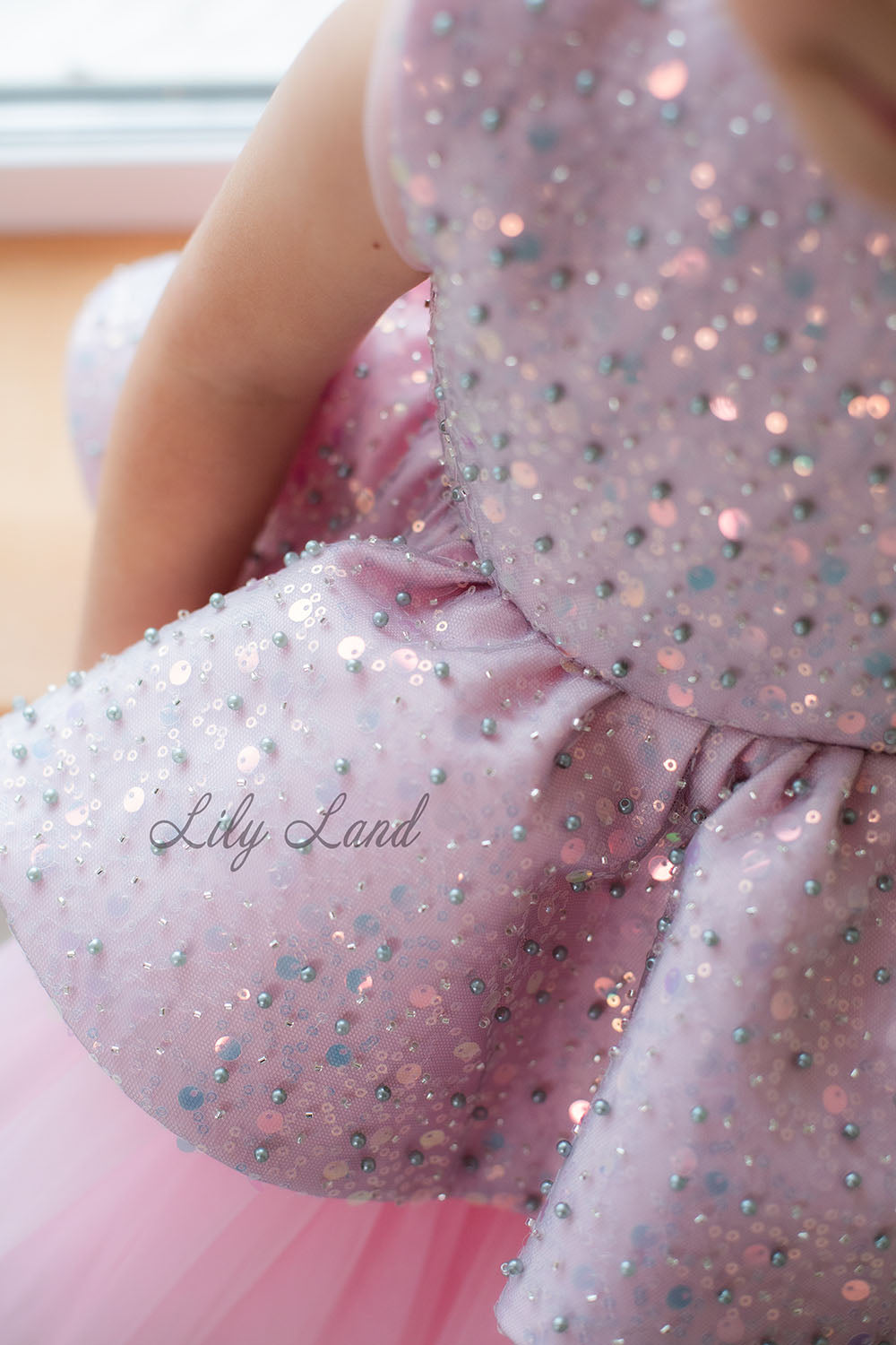 Satin top, regilin bow, beads and sequins, tulle, cotton