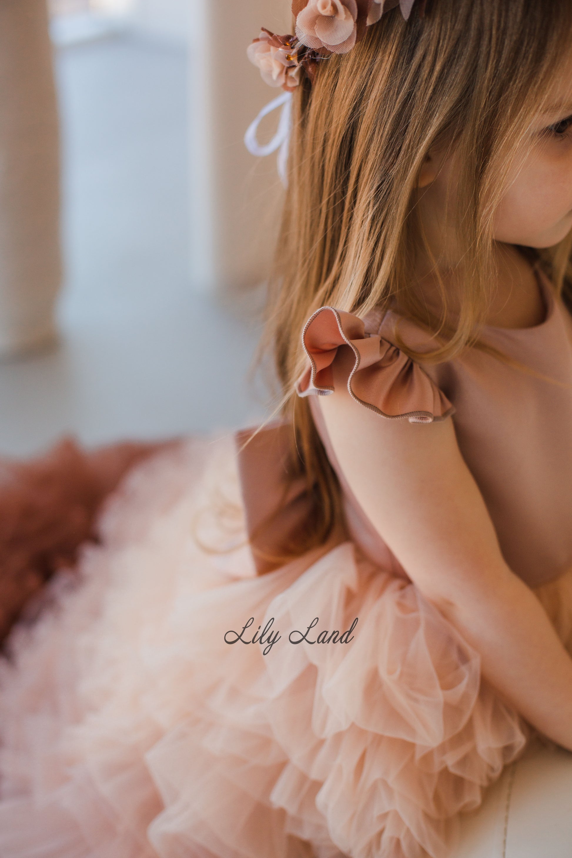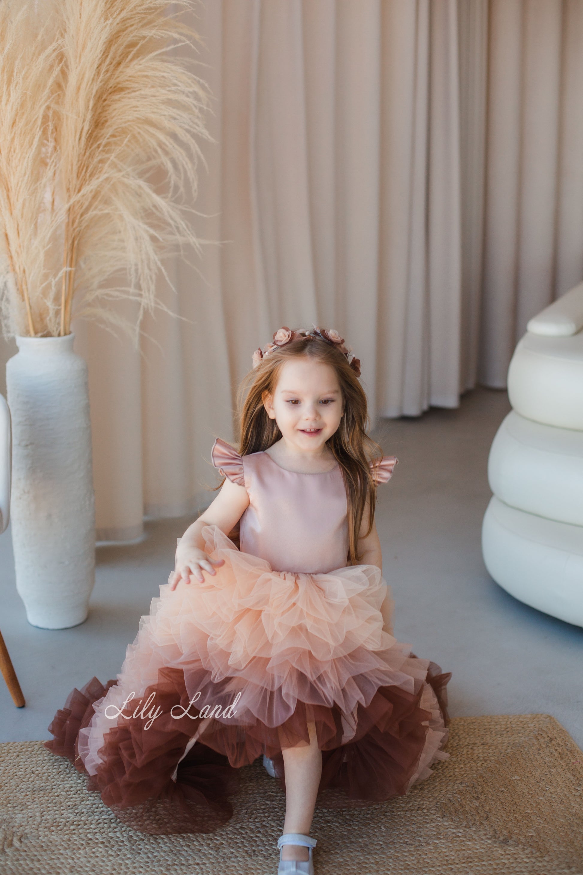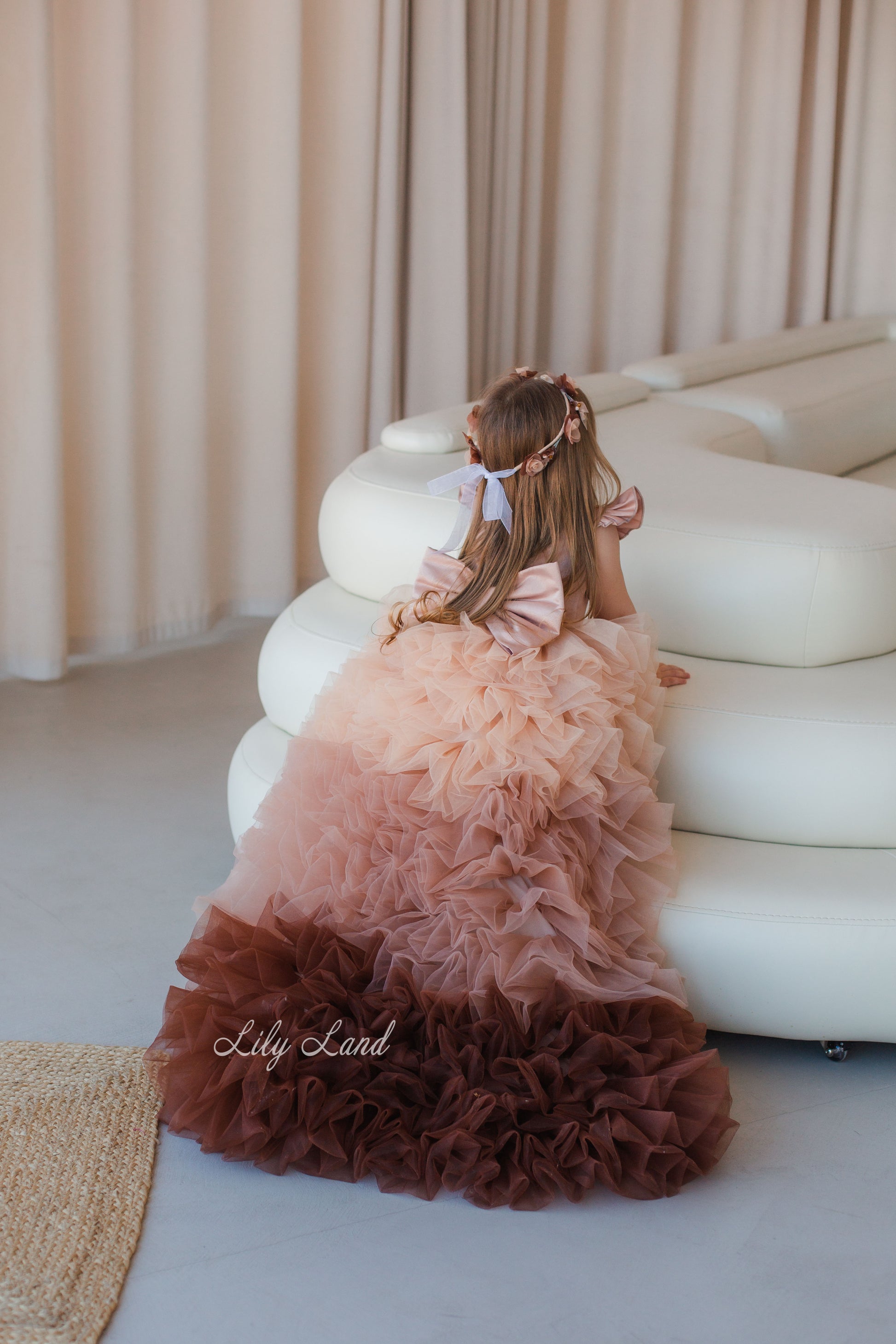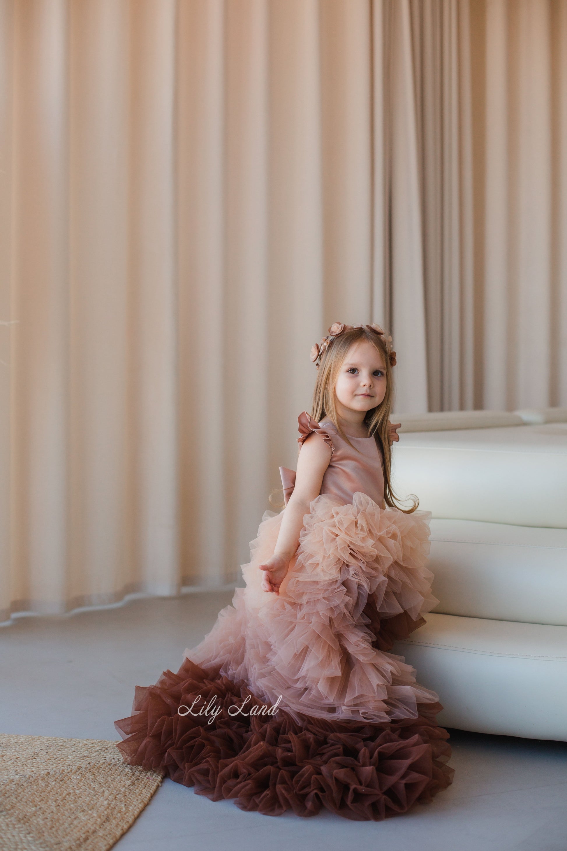 Rosa girl's dress – a magical ensemble made for your little ones to shine. This dress fulfills the dreams of young fashion lovers. The Rosa dress features a lovely cappuccino hue with a beige-brown ombre skirt, cute puff sleeves, and a trailing train. It's the ideal choice for your young princess, be it for her birthday, a special occasion, prom, wedding, a photoshoot, or as an adorable flower girl dress.