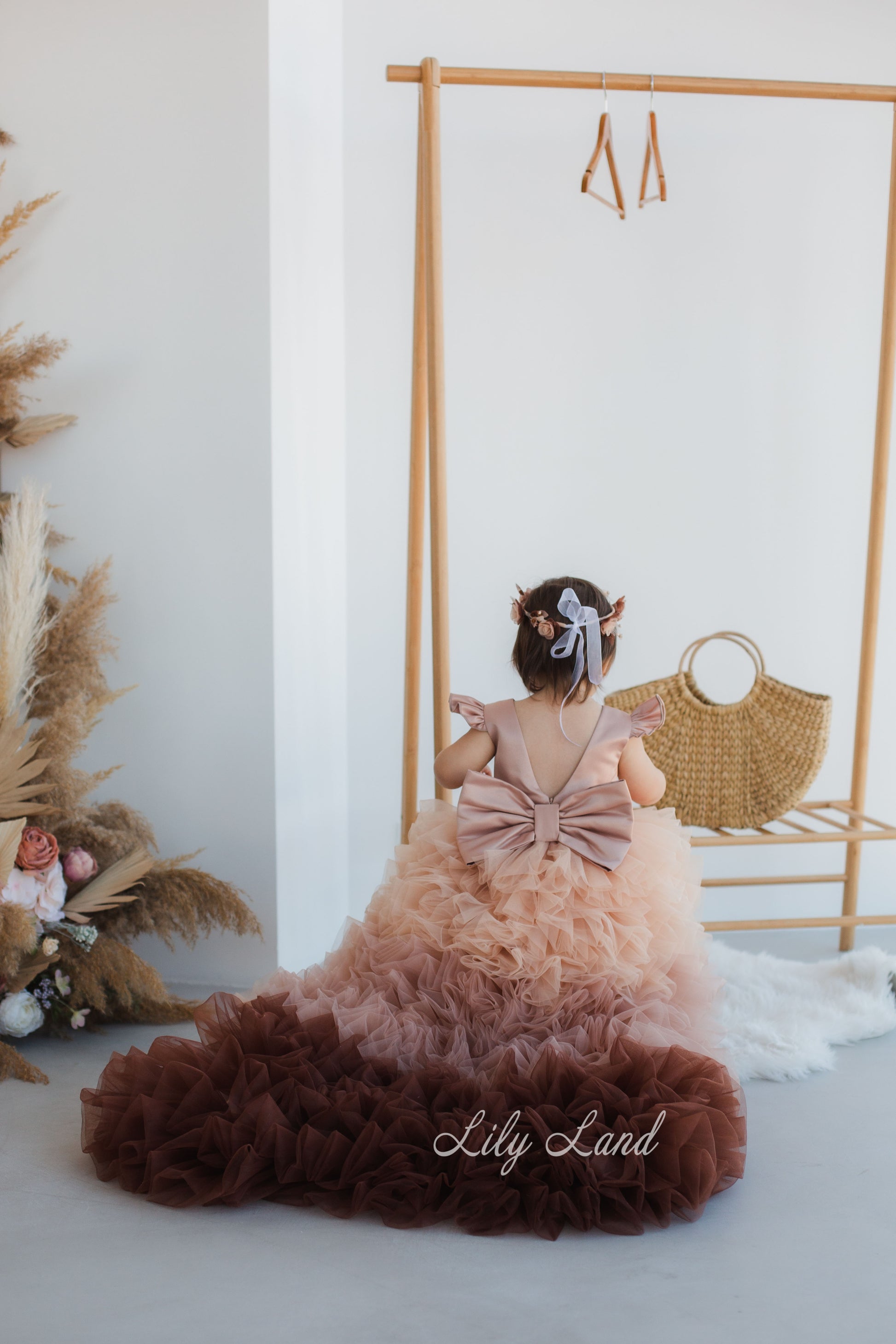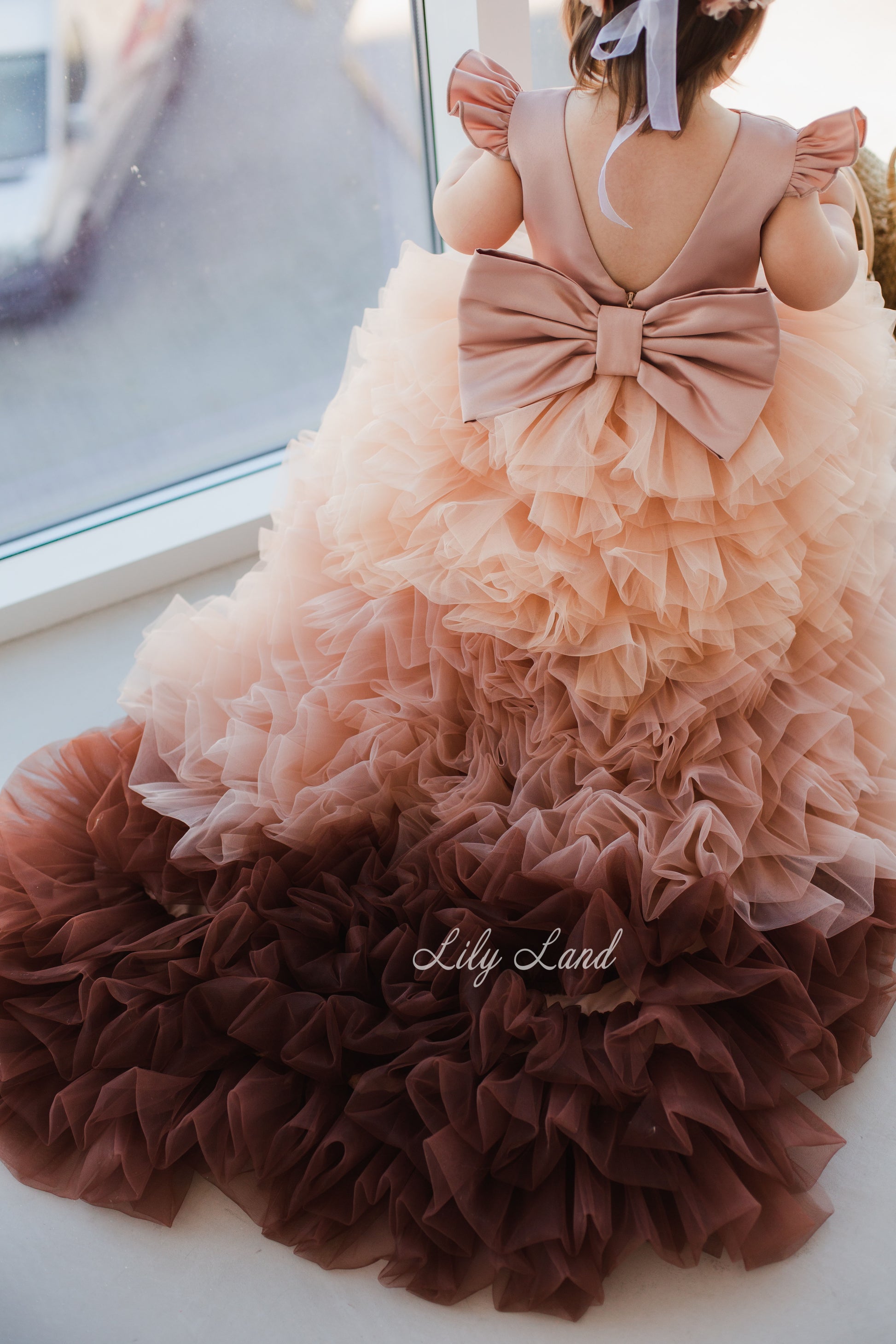 Rosa Girl Dress in Cappuccino Ombre with Long Train