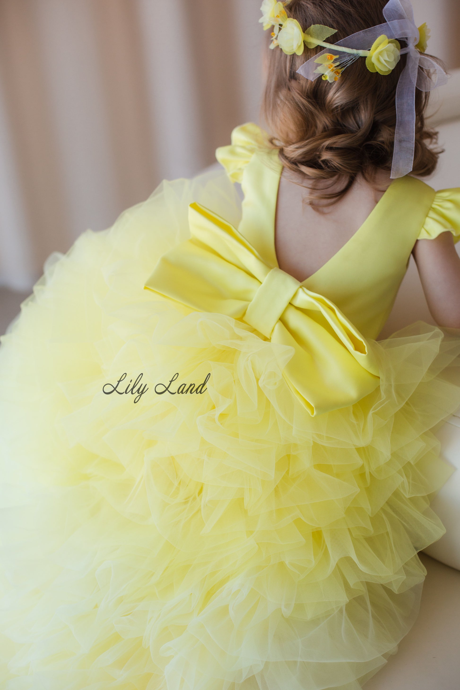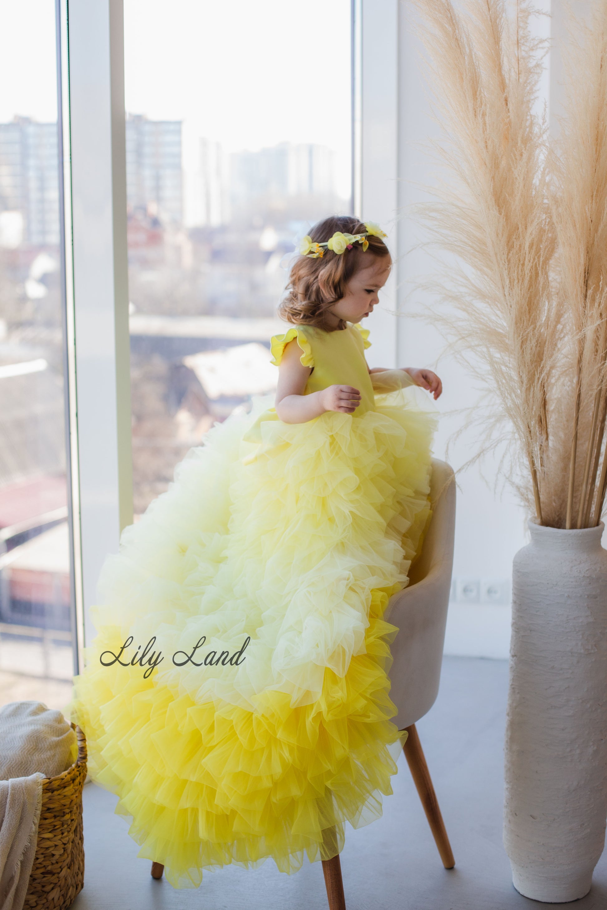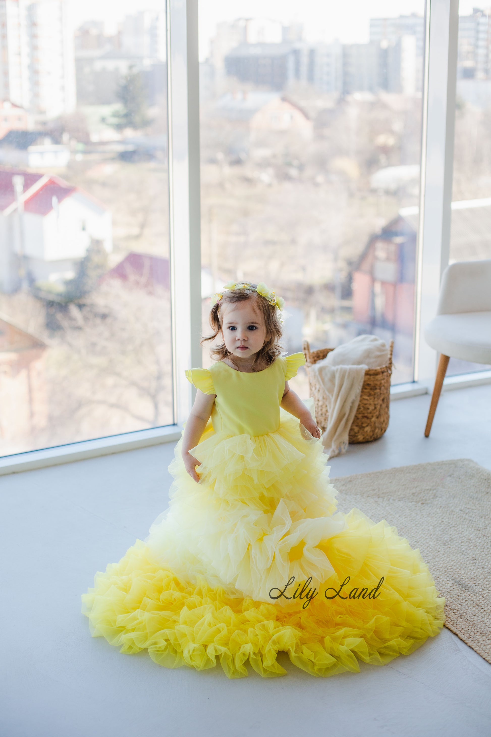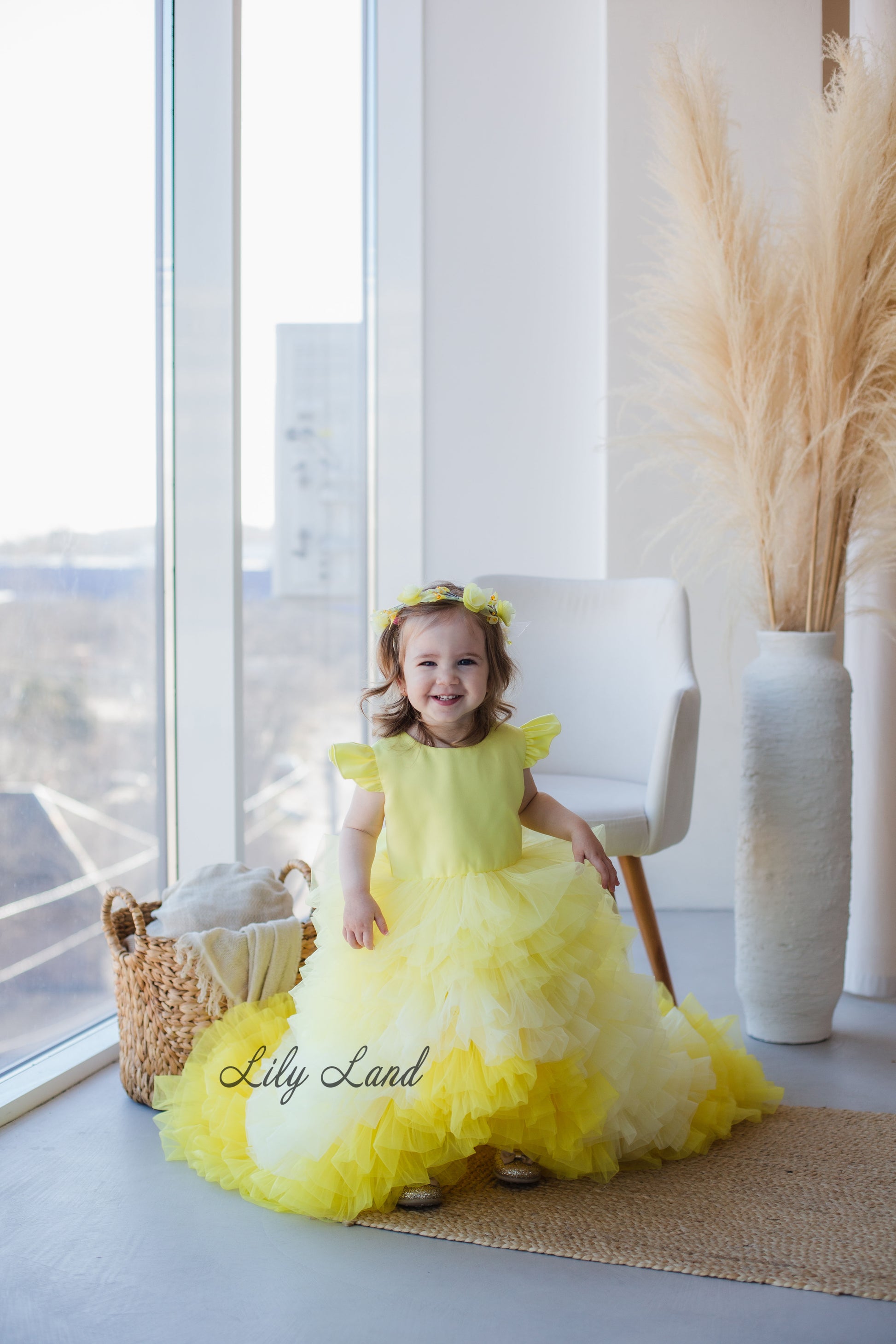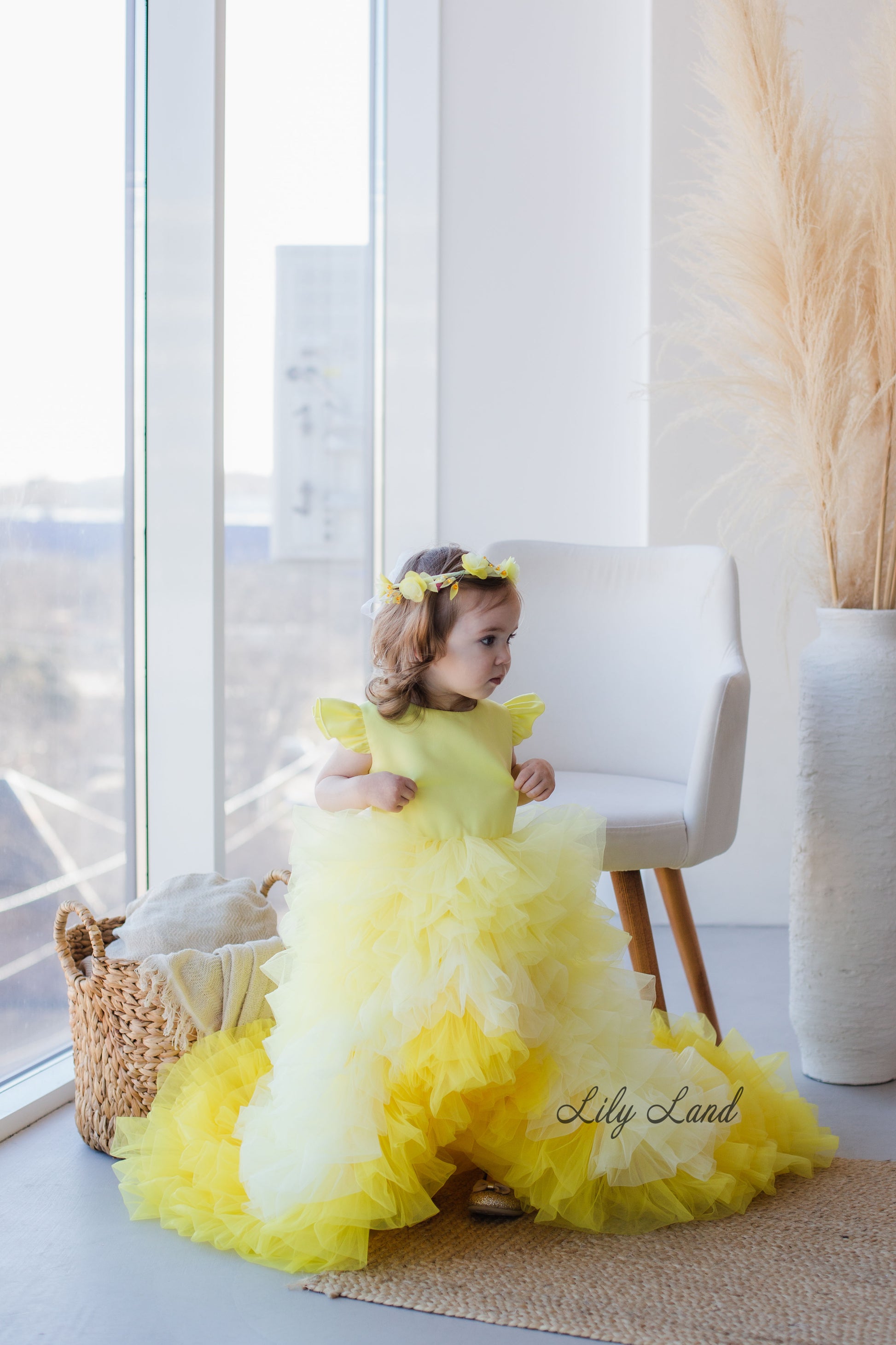 Introducing the Rosa girls' celebration dress, an enchanting ensemble designed for your little ones to shine like stars. This outfit is a dream come true for budding fashionistas. The Rosa dress comes in a charming yellow ombre color, with adorable puff sleeves and a trailing train. It's the perfect choice for your young princess, whether it's her birthday, a special party, prom, wedding, a photo session, or as a charming flower girl dress.
