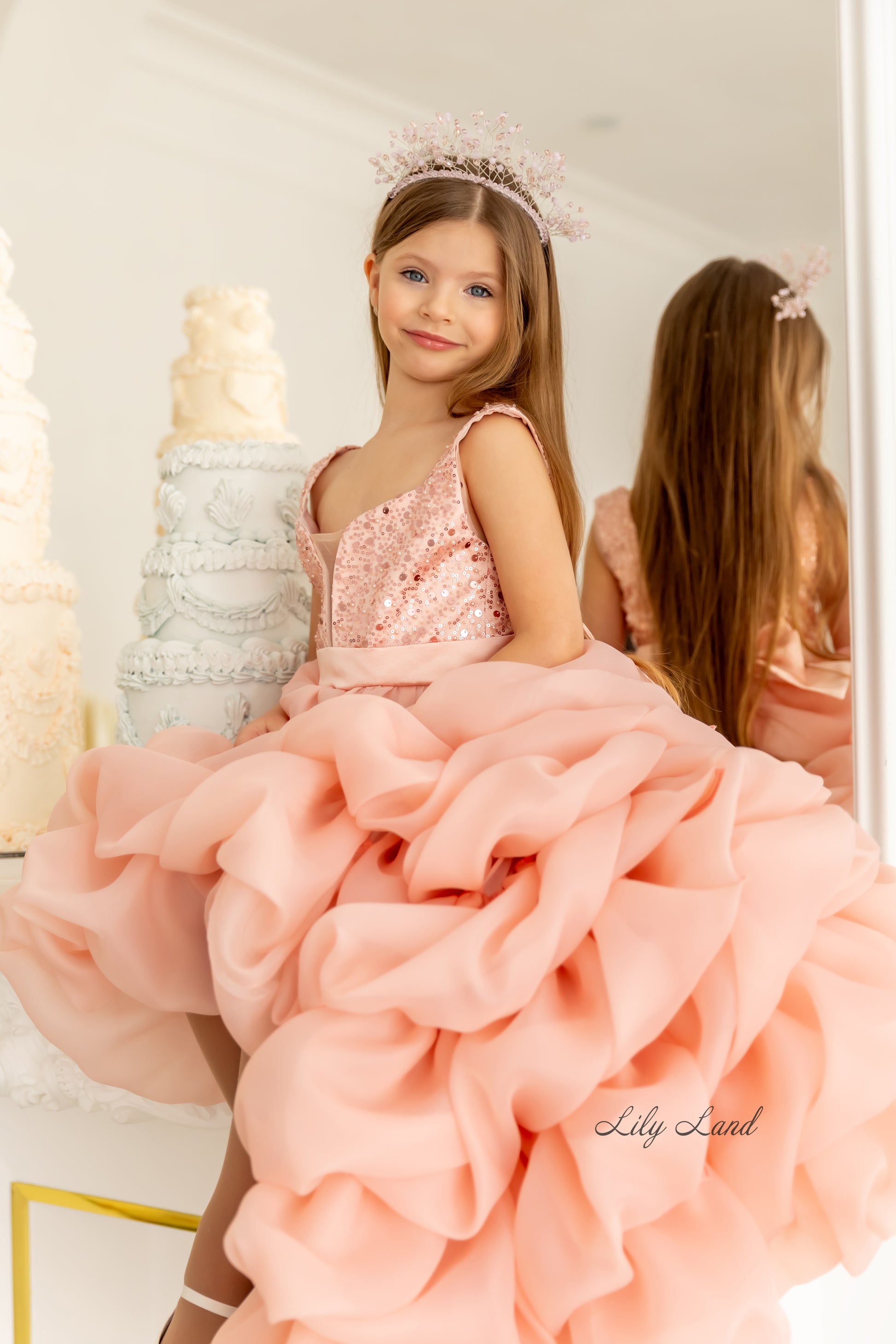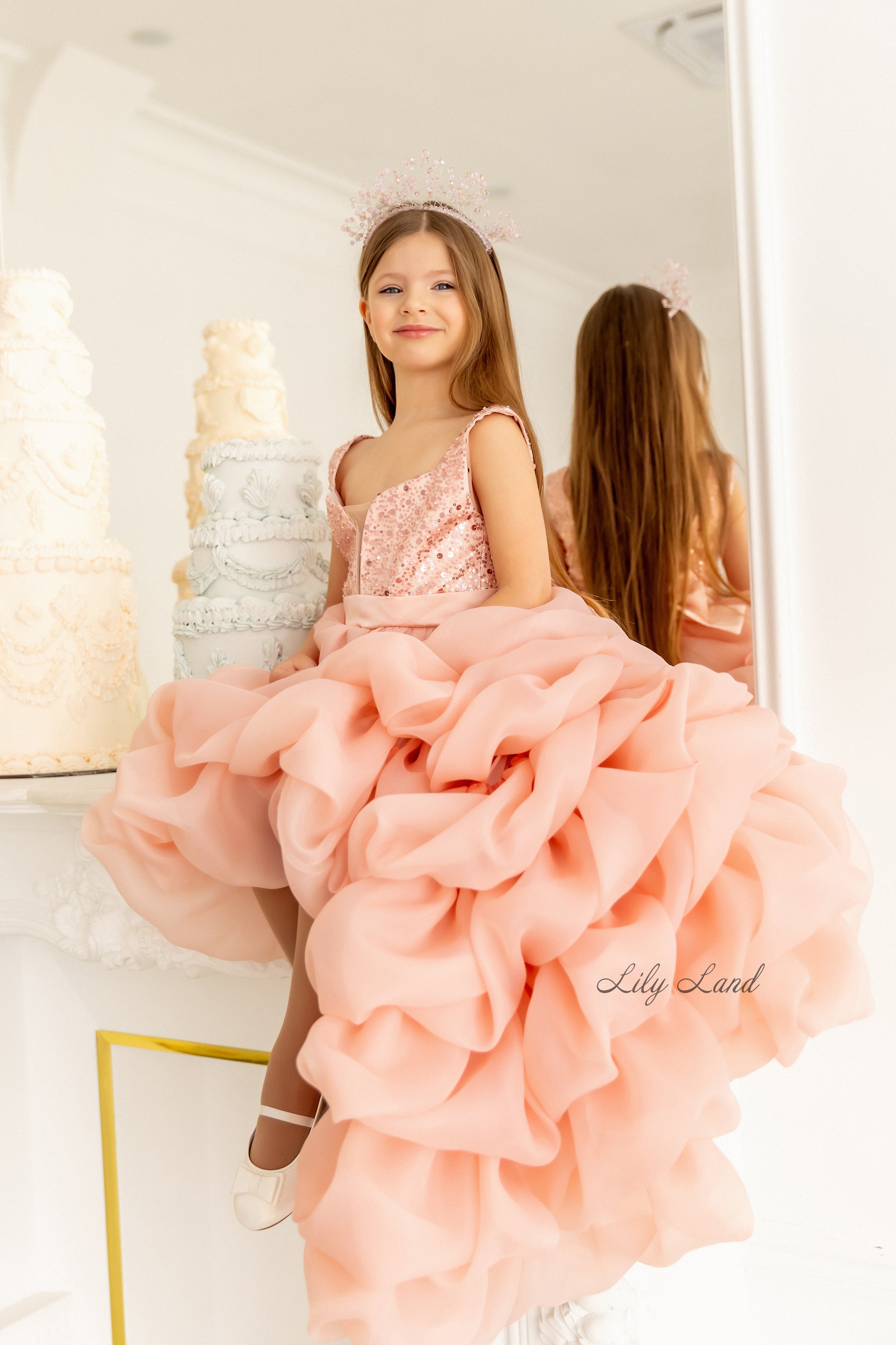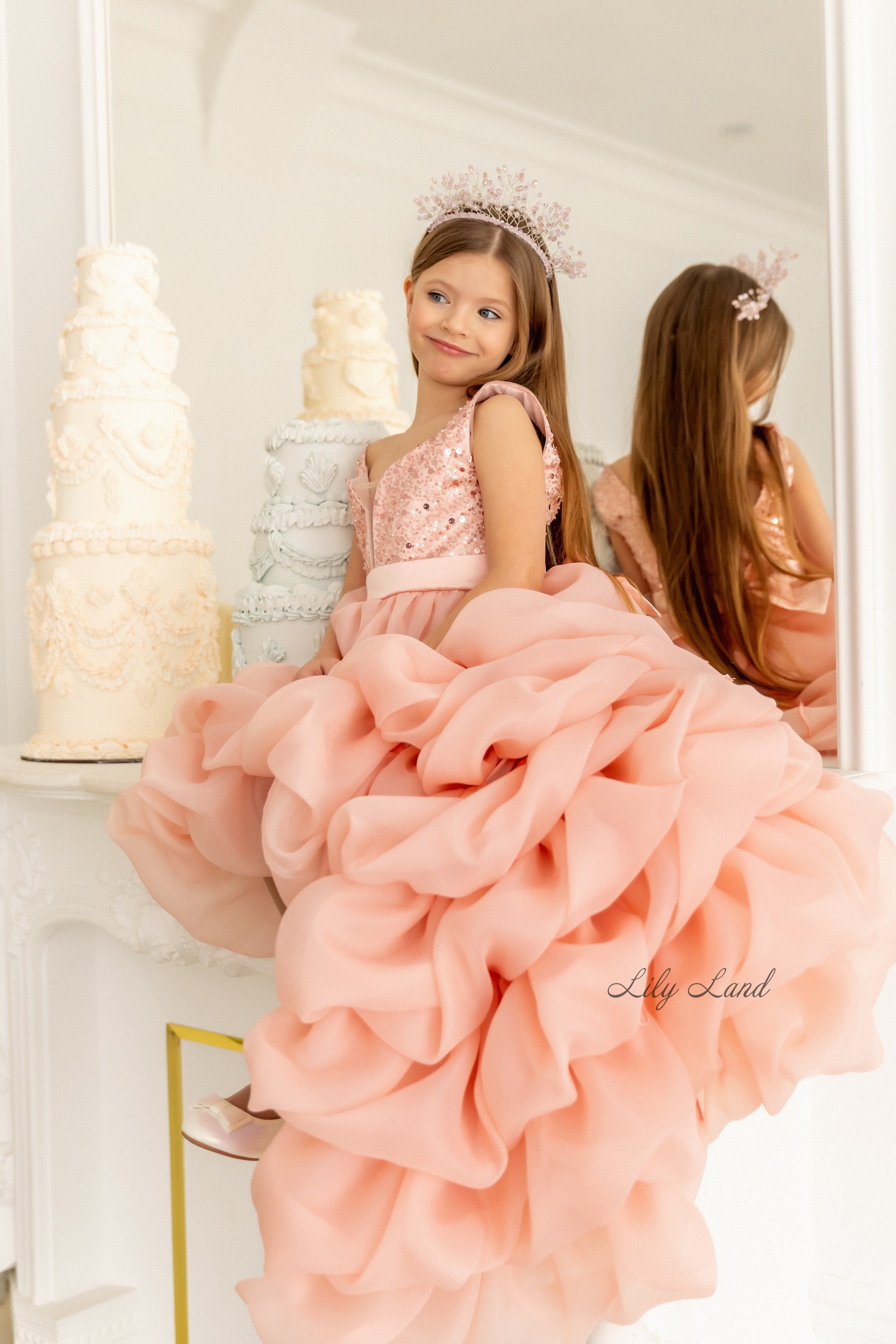 Step into a world of enchantment with the Rosalyn girl's dress – a whimsical masterpiece tailored to fill your child's universe with sheer joy. This mesmerizing dress, now available in blush pink, unveils a charming ruffled skirt, delightful sparkling top, and an elegantly flowing train. Whether it's a birthday party, a special occasion, a captivating prom night, graduation dance formal apparel, pageants, as a wedding guest, a cherished photoshoot, or a flower girl appearance, the Rosalyn dress is the key to weaving moments that linger forever.