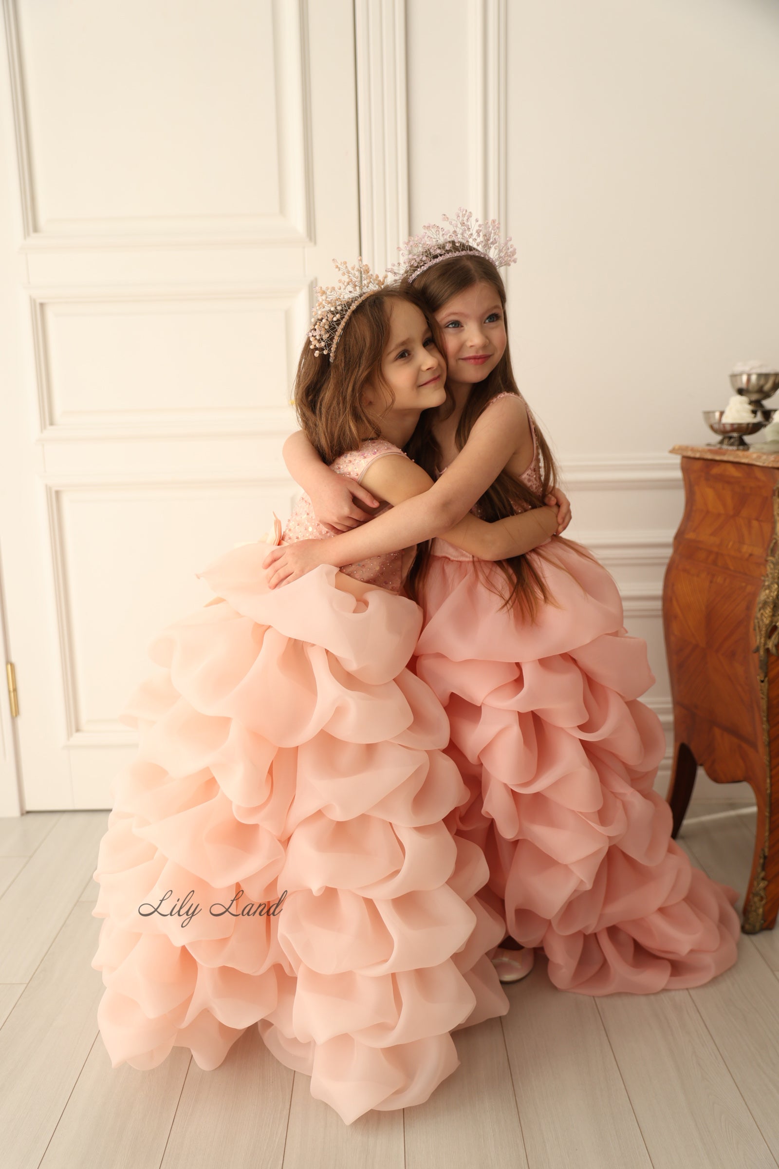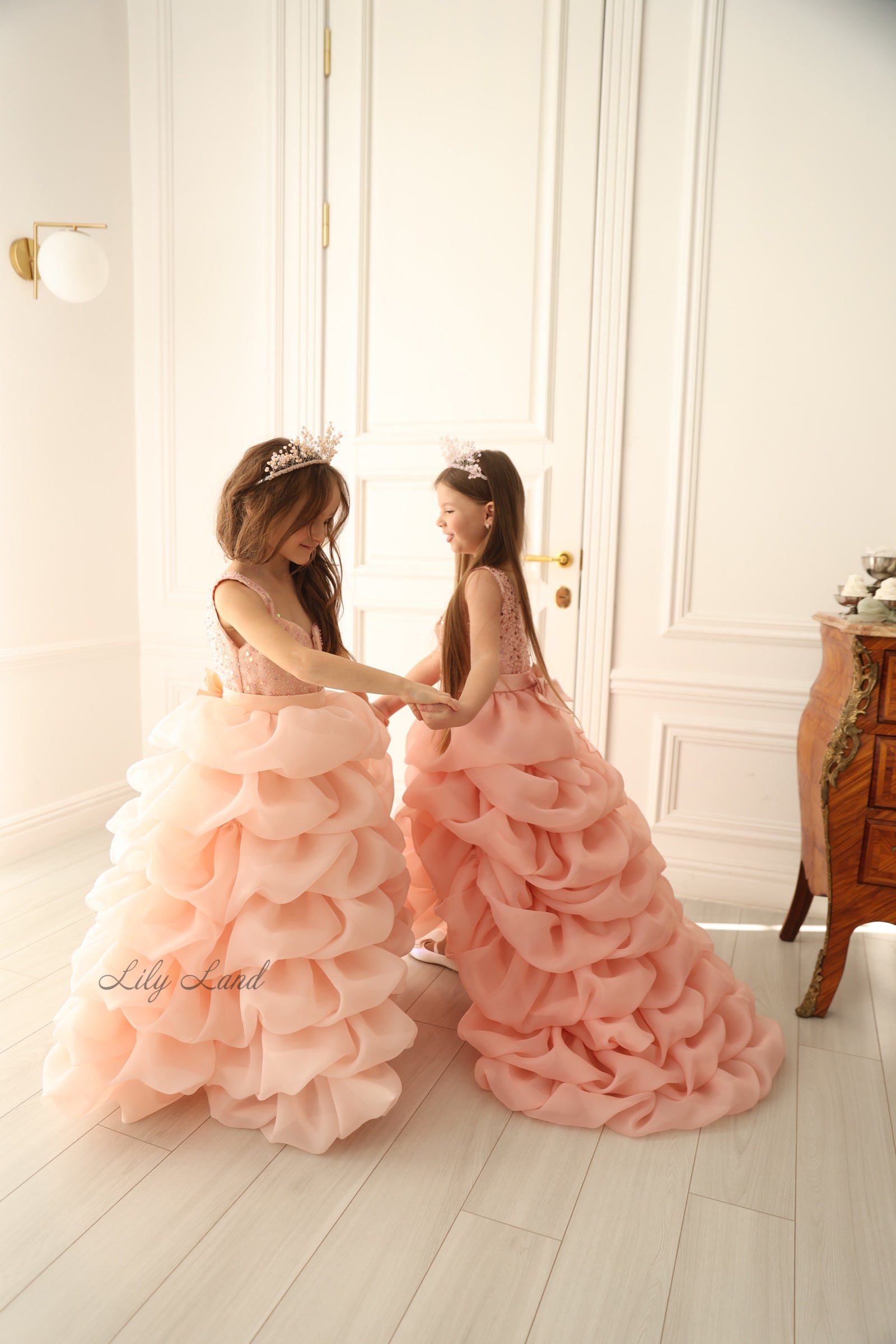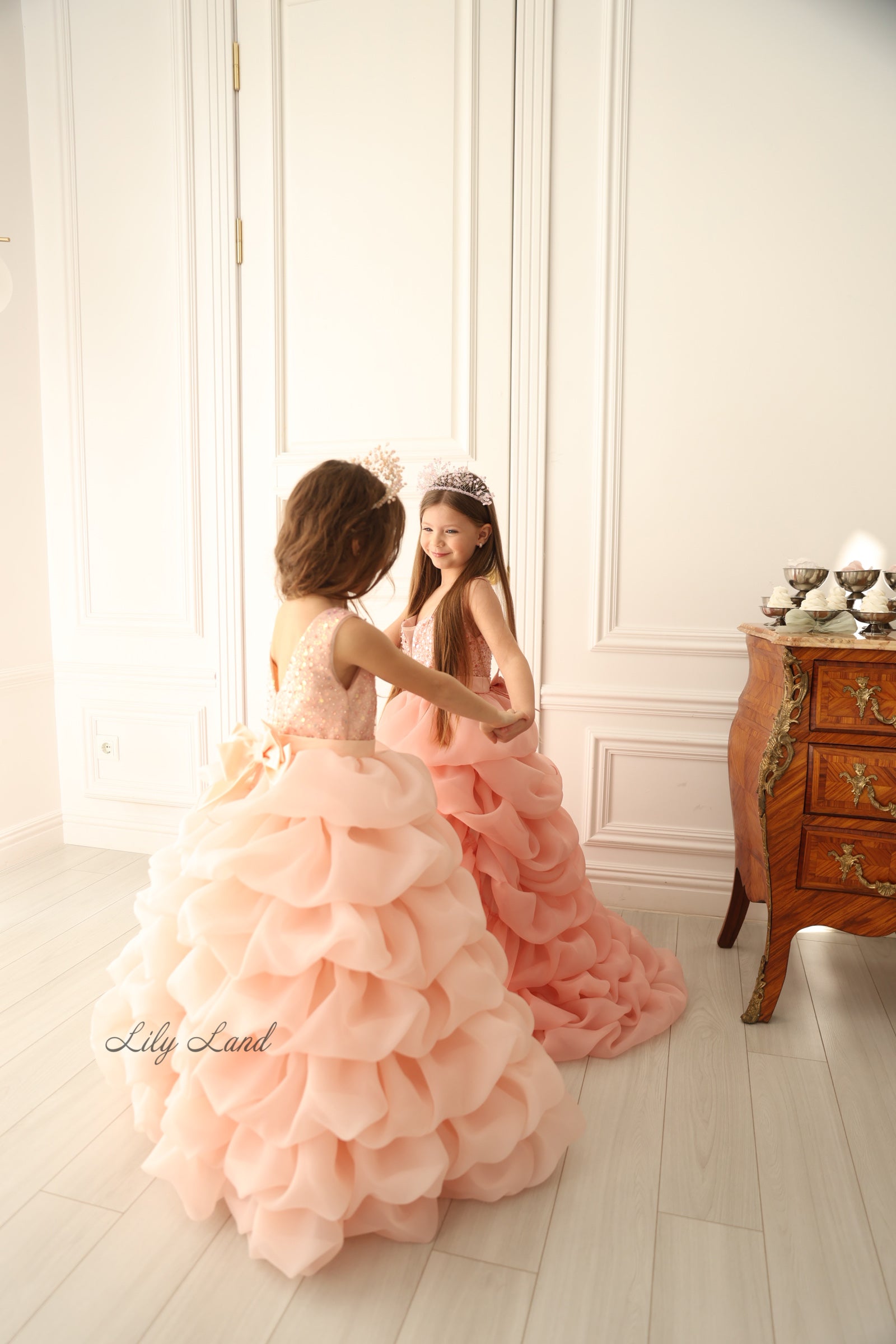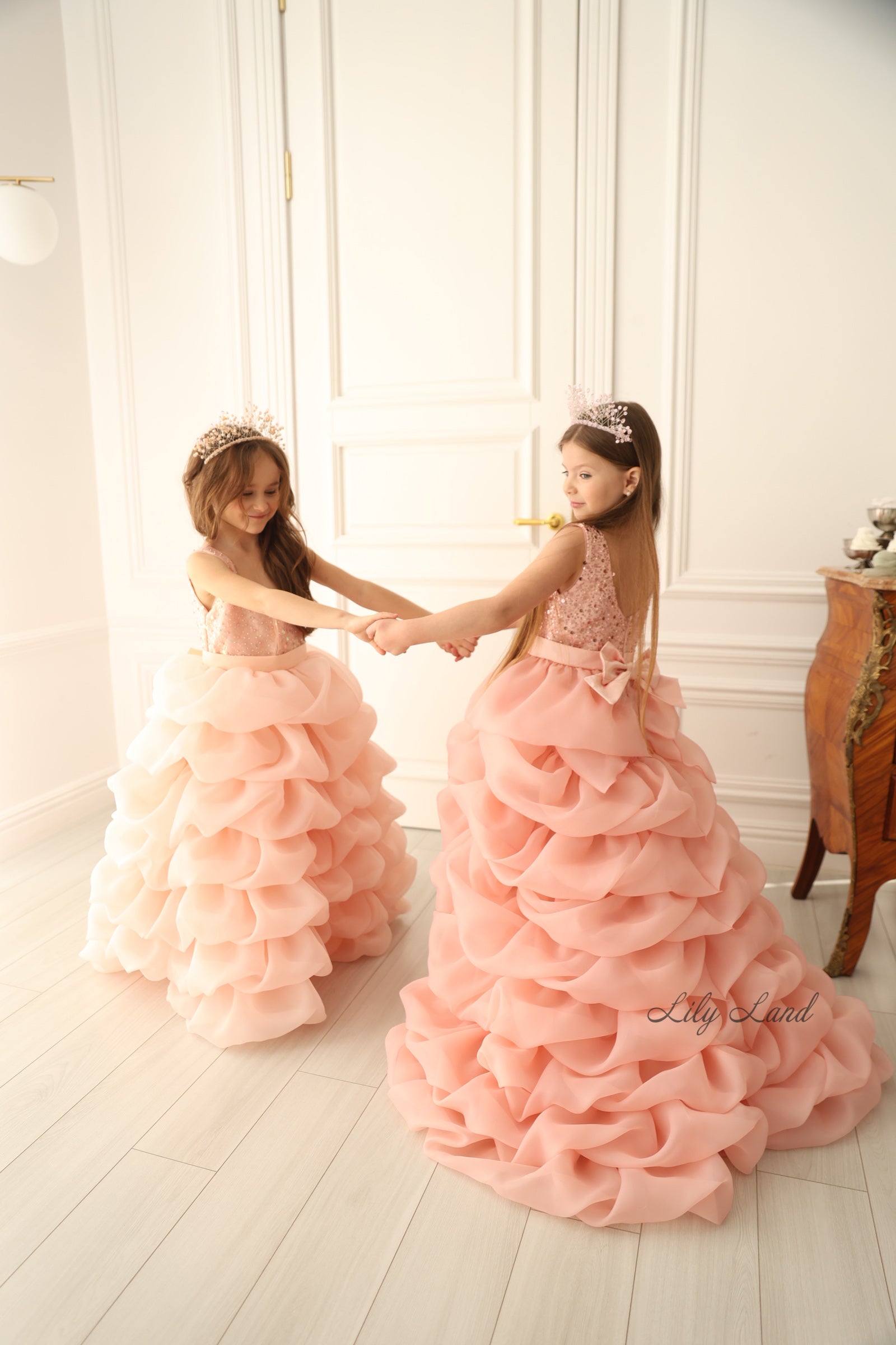 Step into a world of enchantment with the Rosalyn girl's dress – a whimsical masterpiece tailored to fill your child's universe with sheer joy. This mesmerizing dress, now available in blush pink, unveils a charming ruffled skirt, delightful sparkling top, and an elegantly flowing train. Whether it's a birthday party, a special occasion, a captivating prom night, graduation dance formal apparel, pageants, as a wedding guest, a cherished photoshoot, or a flower girl appearance, the Rosalyn dress is the key to weaving moments that linger forever.