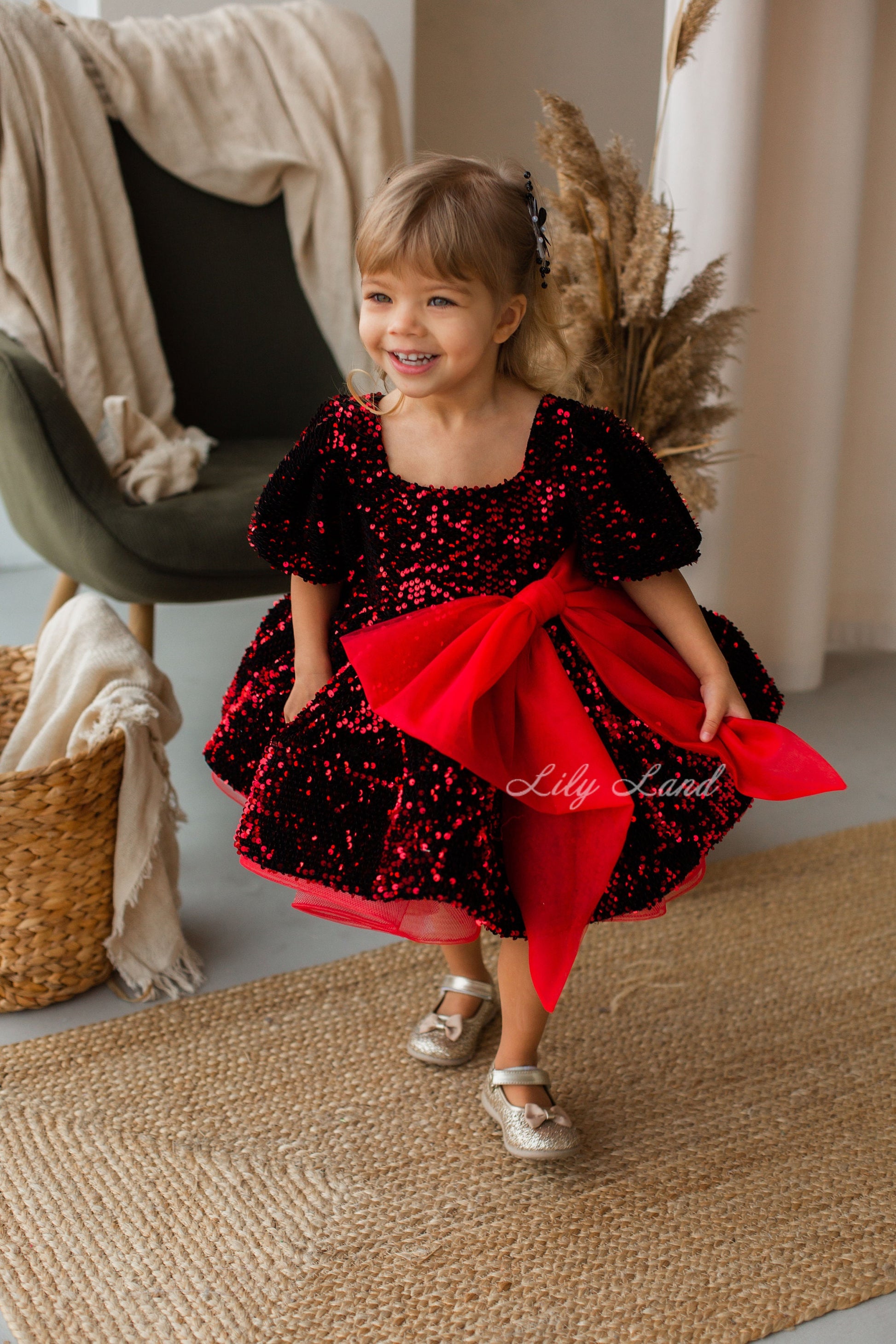 This model will help you and your princess to create a unique look anywhere to conquer the world with this beauty. Vicky dress is created in red color from two-sided sequins. This stunning dress is perfect for any special occasion, whether it's a birthday party, pageant, or prom event. The dress features a sparkling red and black design, adding a touch of glamour and sophistication to your little girl's outfit. Order now and make your little girl's special occasion even more memorable with this stunning sparkling dress.