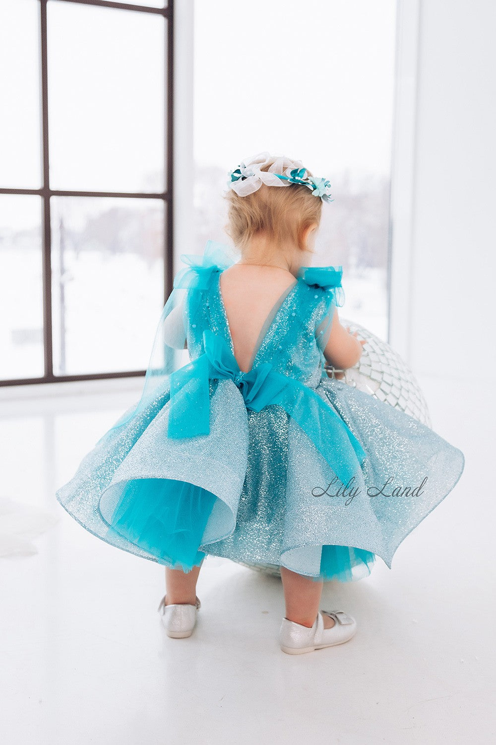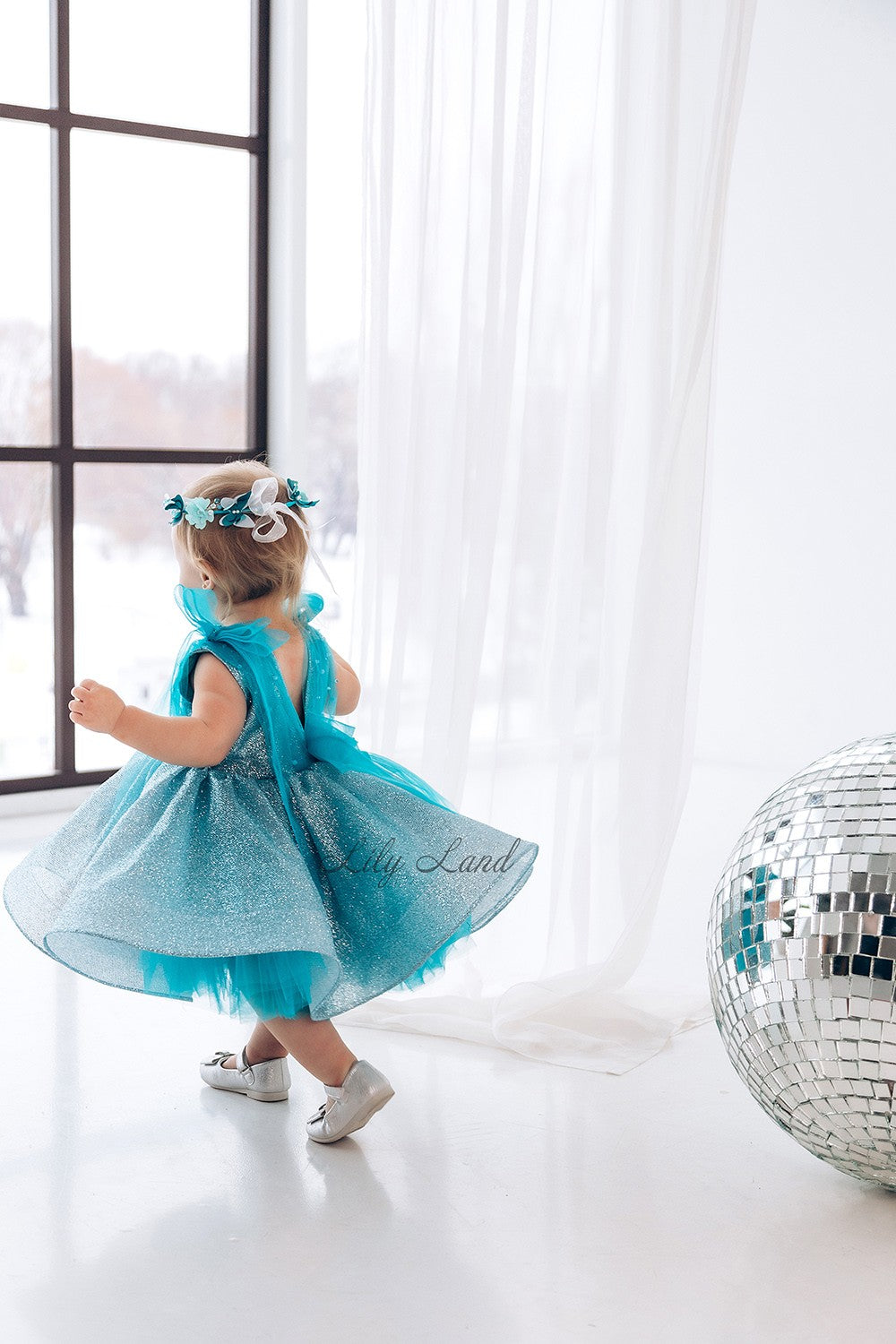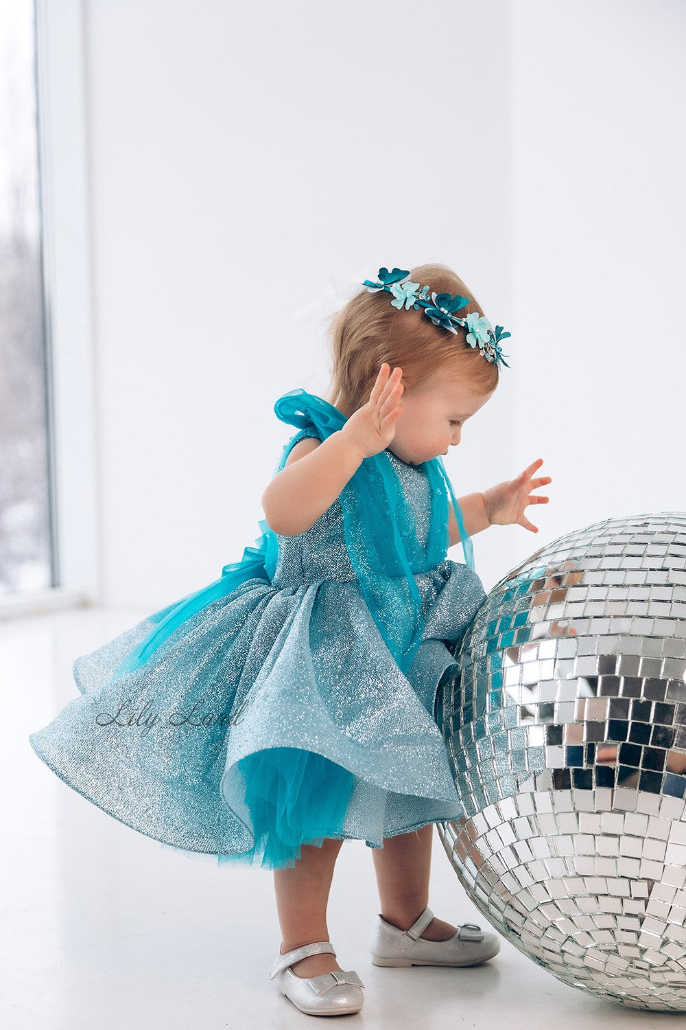 Stefania Girl Glitter Dress In Turquoise With Open Back